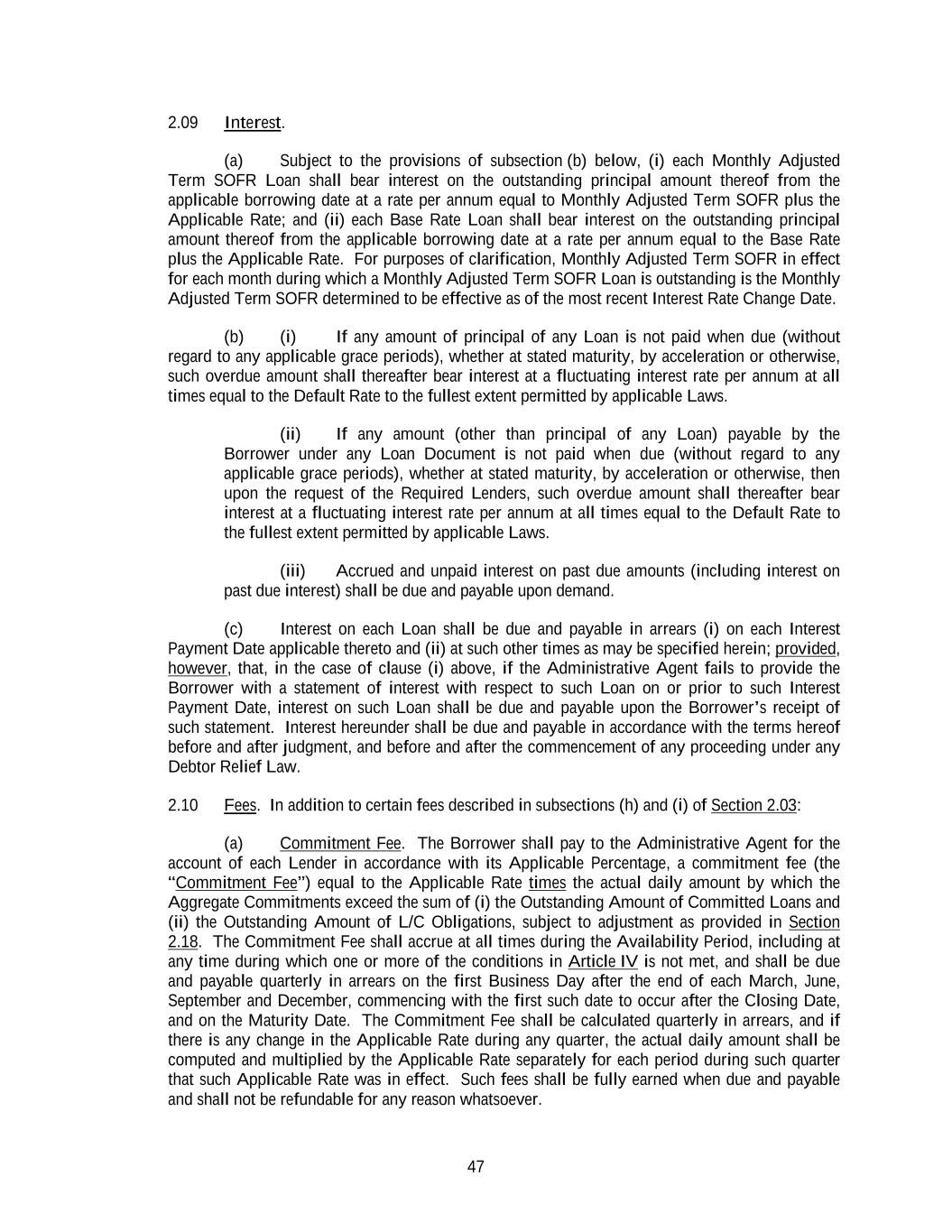 47 2.09 Interest. (a) Subject to the provisions of subsection (b) below, (i) each Monthly Adjusted Term SOFR Loan shall bear interest on the outstanding principal amount thereof from the applicable borrowing date at a rate per annum equal to Monthly Adjusted Term SOFR plus the Applicable Rate; and (ii) each Base Rate Loan shall bear interest on the outstanding principal amount thereof from the applicable borrowing date at a rate per annum equal to the Base Rate plus the Applicable Rate. For purposes of clarification, Monthly Adjusted Term SOFR in effect for each month during which a Monthly Adjusted Term SOFR Loan is outstanding is the Monthly Adjusted Term SOFR determined to be effective as of the most recent Interest Rate Change Date. (b) (i) If any amount of principal of any Loan is not paid when due (without regard to any applicable grace periods), whether at stated maturity, by acceleration or otherwise, such overdue amount shall thereafter bear interest at a fluctuating interest rate per annum at all times equal to the Default Rate to the fullest extent permitted by applicable Laws. (ii) If any amount (other than principal of any Loan) payable by the Borrower under any Loan Document is not paid when due (without regard to any applicable grace periods), whether at stated maturity, by acceleration or otherwise, then upon the request of the Required Lenders, such overdue amount shall thereafter bear interest at a fluctuating interest rate per annum at all times equal to the Default Rate to the fullest extent permitted by applicable Laws. (iii) Accrued and unpaid interest on past due amounts (including interest on past due interest) shall be due and payable upon demand. (c) Interest on each Loan shall be due and payable in arrears (i) on each Interest Payment Date applicable thereto and (ii) at such other times as may be specified herein; provided, however, that, in the case of clause (i) above, if the Administrative Agent fails to provide the Borrower with a statement of interest with respect to such Loan on or prior to such Interest Payment Date, interest on such Loan shall be due and payable upon the Borrower’s receipt of such statement. Interest hereunder shall be due and payable in accordance with the terms hereof before and after judgment, and before and after the commencement of any proceeding under any Debtor Relief Law. 2.10 Fees. In addition to certain fees described in subsections (h) and (i) of Section 2.03: (a) Commitment Fee. The Borrower shall pay to the Administrative Agent for the account of each Lender in accordance with its Applicable Percentage, a commitment fee (the “Commitment Fee”) equal to the Applicable Rate times the actual daily amount by which the Aggregate Commitments exceed the sum of (i) the Outstanding Amount of Committed Loans and (ii) the Outstanding Amount of L/C Obligations, subject to adjustment as provided in Section 2.18. The Commitment Fee shall accrue at all times during the Availability Period, including at any time during which one or more of the conditions in Article IV is not met, and shall be due and payable quarterly in arrears on the first Business Day after the end of each March, June, September and December, commencing with the first such date to occur after the Closing Date, and on the Maturity Date. The Commitment Fee shall be calculated quarterly in arrears, and if there is any change in the Applicable Rate during any quarter, the actual daily amount shall be computed and multiplied by the Applicable Rate separately for each period during such quarter that such Applicable Rate was in effect. Such fees shall be fully earned when due and payable and shall not be refundable for any reason whatsoever.