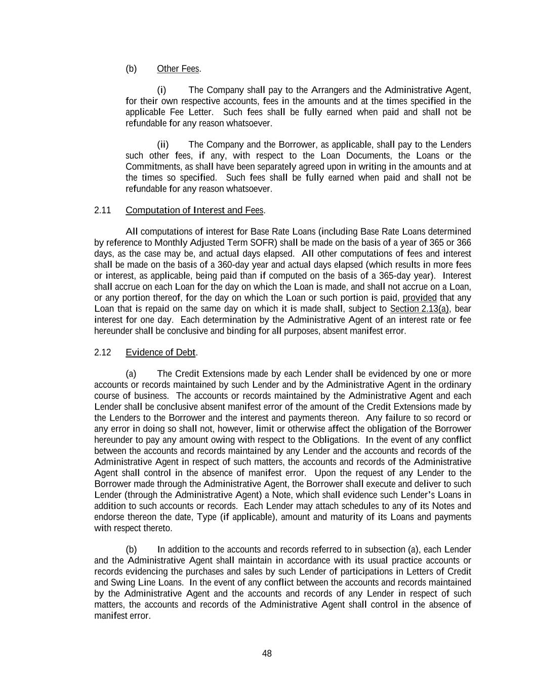 48 (b) Other Fees. (i) The Company shall pay to the Arrangers and the Administrative Agent, for their own respective accounts, fees in the amounts and at the times specified in the applicable Fee Letter. Such fees shall be fully earned when paid and shall not be refundable for any reason whatsoever. (ii) The Company and the Borrower, as applicable, shall pay to the Lenders such other fees, if any, with respect to the Loan Documents, the Loans or the Commitments, as shall have been separately agreed upon in writing in the amounts and at the times so specified. Such fees shall be fully earned when paid and shall not be refundable for any reason whatsoever. 2.11 Computation of Interest and Fees. All computations of interest for Base Rate Loans (including Base Rate Loans determined by reference to Monthly Adjusted Term SOFR) shall be made on the basis of a year of 365 or 366 days, as the case may be, and actual days elapsed. All other computations of fees and interest shall be made on the basis of a 360-day year and actual days elapsed (which results in more fees or interest, as applicable, being paid than if computed on the basis of a 365-day year). Interest shall accrue on each Loan for the day on which the Loan is made, and shall not accrue on a Loan, or any portion thereof, for the day on which the Loan or such portion is paid, provided that any Loan that is repaid on the same day on which it is made shall, subject to Section 2.13(a), bear interest for one day. Each determination by the Administrative Agent of an interest rate or fee hereunder shall be conclusive and binding for all purposes, absent manifest error. 2.12 Evidence of Debt. (a) The Credit Extensions made by each Lender shall be evidenced by one or more accounts or records maintained by such Lender and by the Administrative Agent in the ordinary course of business. The accounts or records maintained by the Administrative Agent and each Lender shall be conclusive absent manifest error of the amount of the Credit Extensions made by the Lenders to the Borrower and the interest and payments thereon. Any failure to so record or any error in doing so shall not, however, limit or otherwise affect the obligation of the Borrower hereunder to pay any amount owing with respect to the Obligations. In the event of any conflict between the accounts and records maintained by any Lender and the accounts and records of the Administrative Agent in respect of such matters, the accounts and records of the Administrative Agent shall control in the absence of manifest error. Upon the request of any Lender to the Borrower made through the Administrative Agent, the Borrower shall execute and deliver to such Lender (through the Administrative Agent) a Note, which shall evidence such Lender’s Loans in addition to such accounts or records. Each Lender may attach schedules to any of its Notes and endorse thereon the date, Type (if applicable), amount and maturity of its Loans and payments with respect thereto. (b) In addition to the accounts and records referred to in subsection (a), each Lender and the Administrative Agent shall maintain in accordance with its usual practice accounts or records evidencing the purchases and sales by such Lender of participations in Letters of Credit and Swing Line Loans. In the event of any conflict between the accounts and records maintained by the Administrative Agent and the accounts and records of any Lender in respect of such matters, the accounts and records of the Administrative Agent shall control in the absence of manifest error.