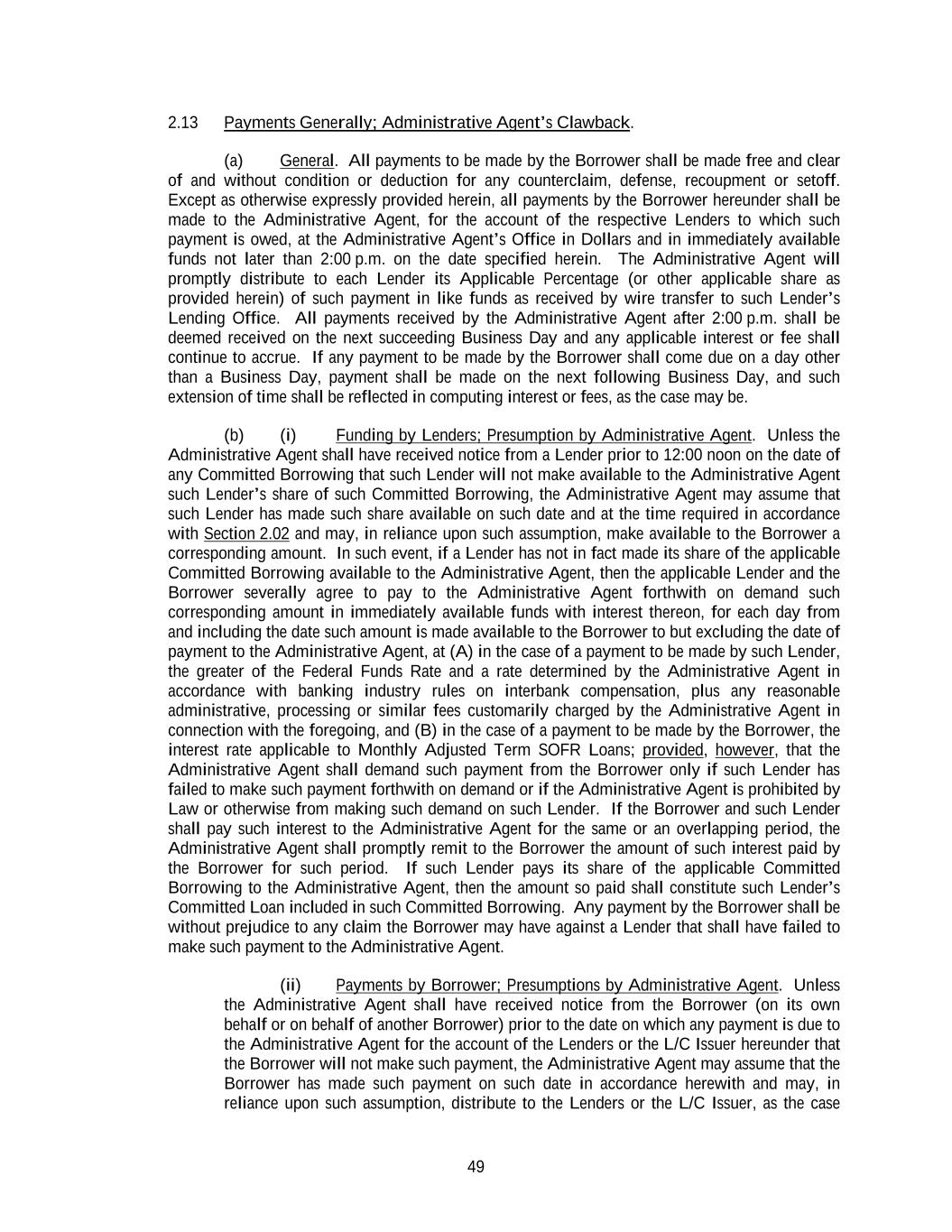 49 2.13 Payments Generally; Administrative Agent’s Clawback. (a) General. All payments to be made by the Borrower shall be made free and clear of and without condition or deduction for any counterclaim, defense, recoupment or setoff. Except as otherwise expressly provided herein, all payments by the Borrower hereunder shall be made to the Administrative Agent, for the account of the respective Lenders to which such payment is owed, at the Administrative Agent’s Office in Dollars and in immediately available funds not later than 2:00 p.m. on the date specified herein. The Administrative Agent will promptly distribute to each Lender its Applicable Percentage (or other applicable share as provided herein) of such payment in like funds as received by wire transfer to such Lender’s Lending Office. All payments received by the Administrative Agent after 2:00 p.m. shall be deemed received on the next succeeding Business Day and any applicable interest or fee shall continue to accrue. If any payment to be made by the Borrower shall come due on a day other than a Business Day, payment shall be made on the next following Business Day, and such extension of time shall be reflected in computing interest or fees, as the case may be. (b) (i) Funding by Lenders; Presumption by Administrative Agent. Unless the Administrative Agent shall have received notice from a Lender prior to 12:00 noon on the date of any Committed Borrowing that such Lender will not make available to the Administrative Agent such Lender’s share of such Committed Borrowing, the Administrative Agent may assume that such Lender has made such share available on such date and at the time required in accordance with Section 2.02 and may, in reliance upon such assumption, make available to the Borrower a corresponding amount. In such event, if a Lender has not in fact made its share of the applicable Committed Borrowing available to the Administrative Agent, then the applicable Lender and the Borrower severally agree to pay to the Administrative Agent forthwith on demand such corresponding amount in immediately available funds with interest thereon, for each day from and including the date such amount is made available to the Borrower to but excluding the date of payment to the Administrative Agent, at (A) in the case of a payment to be made by such Lender, the greater of the Federal Funds Rate and a rate determined by the Administrative Agent in accordance with banking industry rules on interbank compensation, plus any reasonable administrative, processing or similar fees customarily charged by the Administrative Agent in connection with the foregoing, and (B) in the case of a payment to be made by the Borrower, the interest rate applicable to Monthly Adjusted Term SOFR Loans; provided, however, that the Administrative Agent shall demand such payment from the Borrower only if such Lender has failed to make such payment forthwith on demand or if the Administrative Agent is prohibited by Law or otherwise from making such demand on such Lender. If the Borrower and such Lender shall pay such interest to the Administrative Agent for the same or an overlapping period, the Administrative Agent shall promptly remit to the Borrower the amount of such interest paid by the Borrower for such period. If such Lender pays its share of the applicable Committed Borrowing to the Administrative Agent, then the amount so paid shall constitute such Lender’s Committed Loan included in such Committed Borrowing. Any payment by the Borrower shall be without prejudice to any claim the Borrower may have against a Lender that shall have failed to make such payment to the Administrative Agent. (ii) Payments by Borrower; Presumptions by Administrative Agent. Unless the Administrative Agent shall have received notice from the Borrower (on its own behalf or on behalf of another Borrower) prior to the date on which any payment is due to the Administrative Agent for the account of the Lenders or the L/C Issuer hereunder that the Borrower will not make such payment, the Administrative Agent may assume that the Borrower has made such payment on such date in accordance herewith and may, in reliance upon such assumption, distribute to the Lenders or the L/C Issuer, as the case
