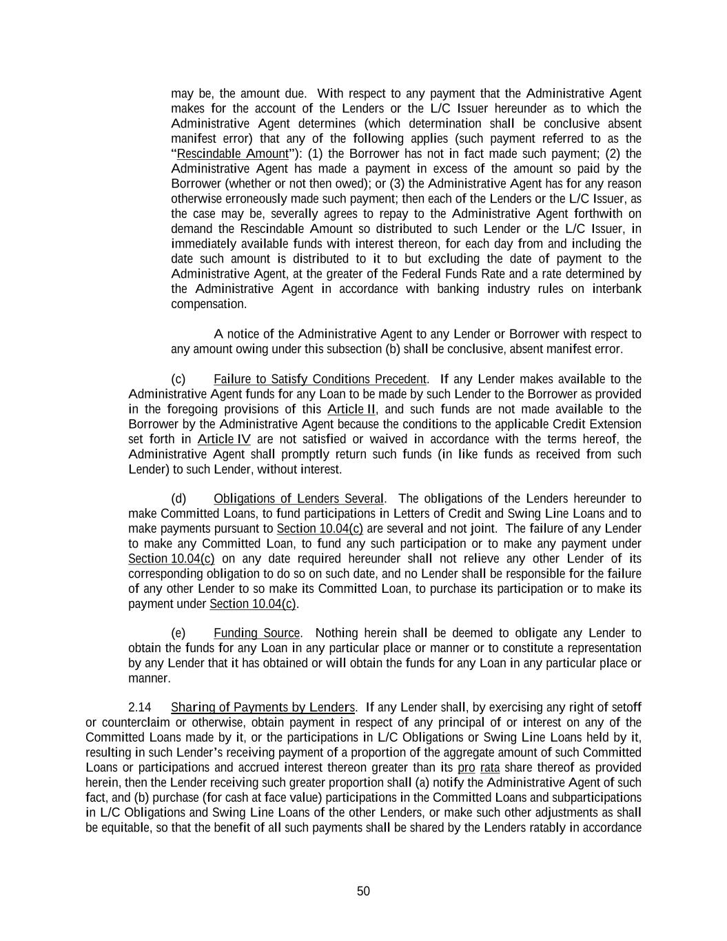 50 may be, the amount due. With respect to any payment that the Administrative Agent makes for the account of the Lenders or the L/C Issuer hereunder as to which the Administrative Agent determines (which determination shall be conclusive absent manifest error) that any of the following applies (such payment referred to as the “Rescindable Amount”): (1) the Borrower has not in fact made such payment; (2) the Administrative Agent has made a payment in excess of the amount so paid by the Borrower (whether or not then owed); or (3) the Administrative Agent has for any reason otherwise erroneously made such payment; then each of the Lenders or the L/C Issuer, as the case may be, severally agrees to repay to the Administrative Agent forthwith on demand the Rescindable Amount so distributed to such Lender or the L/C Issuer, in immediately available funds with interest thereon, for each day from and including the date such amount is distributed to it to but excluding the date of payment to the Administrative Agent, at the greater of the Federal Funds Rate and a rate determined by the Administrative Agent in accordance with banking industry rules on interbank compensation. A notice of the Administrative Agent to any Lender or Borrower with respect to any amount owing under this subsection (b) shall be conclusive, absent manifest error. (c) Failure to Satisfy Conditions Precedent. If any Lender makes available to the Administrative Agent funds for any Loan to be made by such Lender to the Borrower as provided in the foregoing provisions of this Article II, and such funds are not made available to the Borrower by the Administrative Agent because the conditions to the applicable Credit Extension set forth in Article IV are not satisfied or waived in accordance with the terms hereof, the Administrative Agent shall promptly return such funds (in like funds as received from such Lender) to such Lender, without interest. (d) Obligations of Lenders Several. The obligations of the Lenders hereunder to make Committed Loans, to fund participations in Letters of Credit and Swing Line Loans and to make payments pursuant to Section 10.04(c) are several and not joint. The failure of any Lender to make any Committed Loan, to fund any such participation or to make any payment under Section 10.04(c) on any date required hereunder shall not relieve any other Lender of its corresponding obligation to do so on such date, and no Lender shall be responsible for the failure of any other Lender to so make its Committed Loan, to purchase its participation or to make its payment under Section 10.04(c). (e) Funding Source. Nothing herein shall be deemed to obligate any Lender to obtain the funds for any Loan in any particular place or manner or to constitute a representation by any Lender that it has obtained or will obtain the funds for any Loan in any particular place or manner. 2.14 Sharing of Payments by Lenders. If any Lender shall, by exercising any right of setoff or counterclaim or otherwise, obtain payment in respect of any principal of or interest on any of the Committed Loans made by it, or the participations in L/C Obligations or Swing Line Loans held by it, resulting in such Lender’s receiving payment of a proportion of the aggregate amount of such Committed Loans or participations and accrued interest thereon greater than its pro rata share thereof as provided herein, then the Lender receiving such greater proportion shall (a) notify the Administrative Agent of such fact, and (b) purchase (for cash at face value) participations in the Committed Loans and subparticipations in L/C Obligations and Swing Line Loans of the other Lenders, or make such other adjustments as shall be equitable, so that the benefit of all such payments shall be shared by the Lenders ratably in accordance