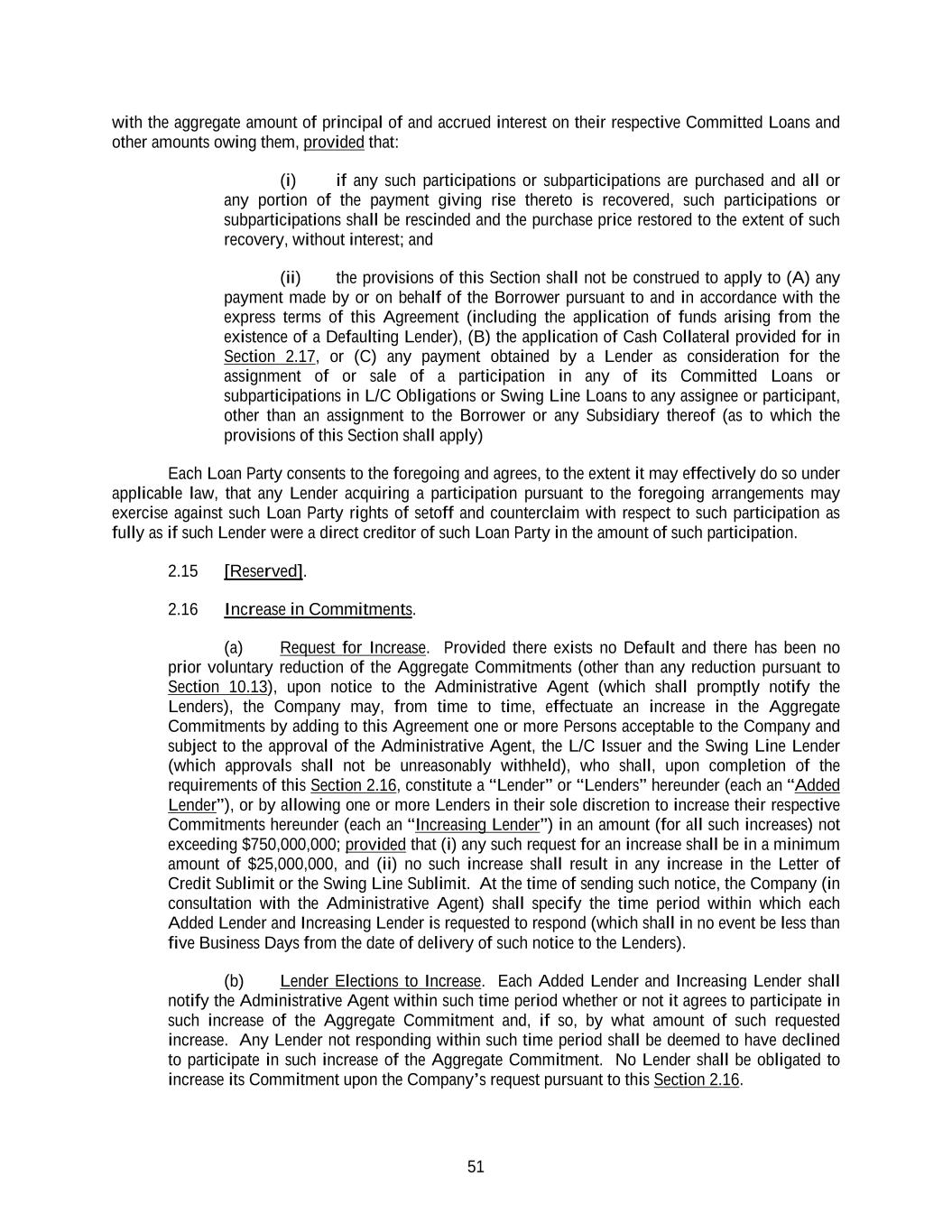 51 with the aggregate amount of principal of and accrued interest on their respective Committed Loans and other amounts owing them, provided that: (i) if any such participations or subparticipations are purchased and all or any portion of the payment giving rise thereto is recovered, such participations or subparticipations shall be rescinded and the purchase price restored to the extent of such recovery, without interest; and (ii) the provisions of this Section shall not be construed to apply to (A) any payment made by or on behalf of the Borrower pursuant to and in accordance with the express terms of this Agreement (including the application of funds arising from the existence of a Defaulting Lender), (B) the application of Cash Collateral provided for in Section 2.17, or (C) any payment obtained by a Lender as consideration for the assignment of or sale of a participation in any of its Committed Loans or subparticipations in L/C Obligations or Swing Line Loans to any assignee or participant, other than an assignment to the Borrower or any Subsidiary thereof (as to which the provisions of this Section shall apply) Each Loan Party consents to the foregoing and agrees, to the extent it may effectively do so under applicable law, that any Lender acquiring a participation pursuant to the foregoing arrangements may exercise against such Loan Party rights of setoff and counterclaim with respect to such participation as fully as if such Lender were a direct creditor of such Loan Party in the amount of such participation. 2.15 [Reserved]. 2.16 Increase in Commitments. (a) Request for Increase. Provided there exists no Default and there has been no prior voluntary reduction of the Aggregate Commitments (other than any reduction pursuant to Section 10.13), upon notice to the Administrative Agent (which shall promptly notify the Lenders), the Company may, from time to time, effectuate an increase in the Aggregate Commitments by adding to this Agreement one or more Persons acceptable to the Company and subject to the approval of the Administrative Agent, the L/C Issuer and the Swing Line Lender (which approvals shall not be unreasonably withheld), who shall, upon completion of the requirements of this Section 2.16, constitute a “Lender” or “Lenders” hereunder (each an “Added Lender”), or by allowing one or more Lenders in their sole discretion to increase their respective Commitments hereunder (each an “Increasing Lender”) in an amount (for all such increases) not exceeding $750,000,000; provided that (i) any such request for an increase shall be in a minimum amount of $25,000,000, and (ii) no such increase shall result in any increase in the Letter of Credit Sublimit or the Swing Line Sublimit. At the time of sending such notice, the Company (in consultation with the Administrative Agent) shall specify the time period within which each Added Lender and Increasing Lender is requested to respond (which shall in no event be less than five Business Days from the date of delivery of such notice to the Lenders). (b) Lender Elections to Increase. Each Added Lender and Increasing Lender shall notify the Administrative Agent within such time period whether or not it agrees to participate in such increase of the Aggregate Commitment and, if so, by what amount of such requested increase. Any Lender not responding within such time period shall be deemed to have declined to participate in such increase of the Aggregate Commitment. No Lender shall be obligated to increase its Commitment upon the Company’s request pursuant to this Section 2.16.