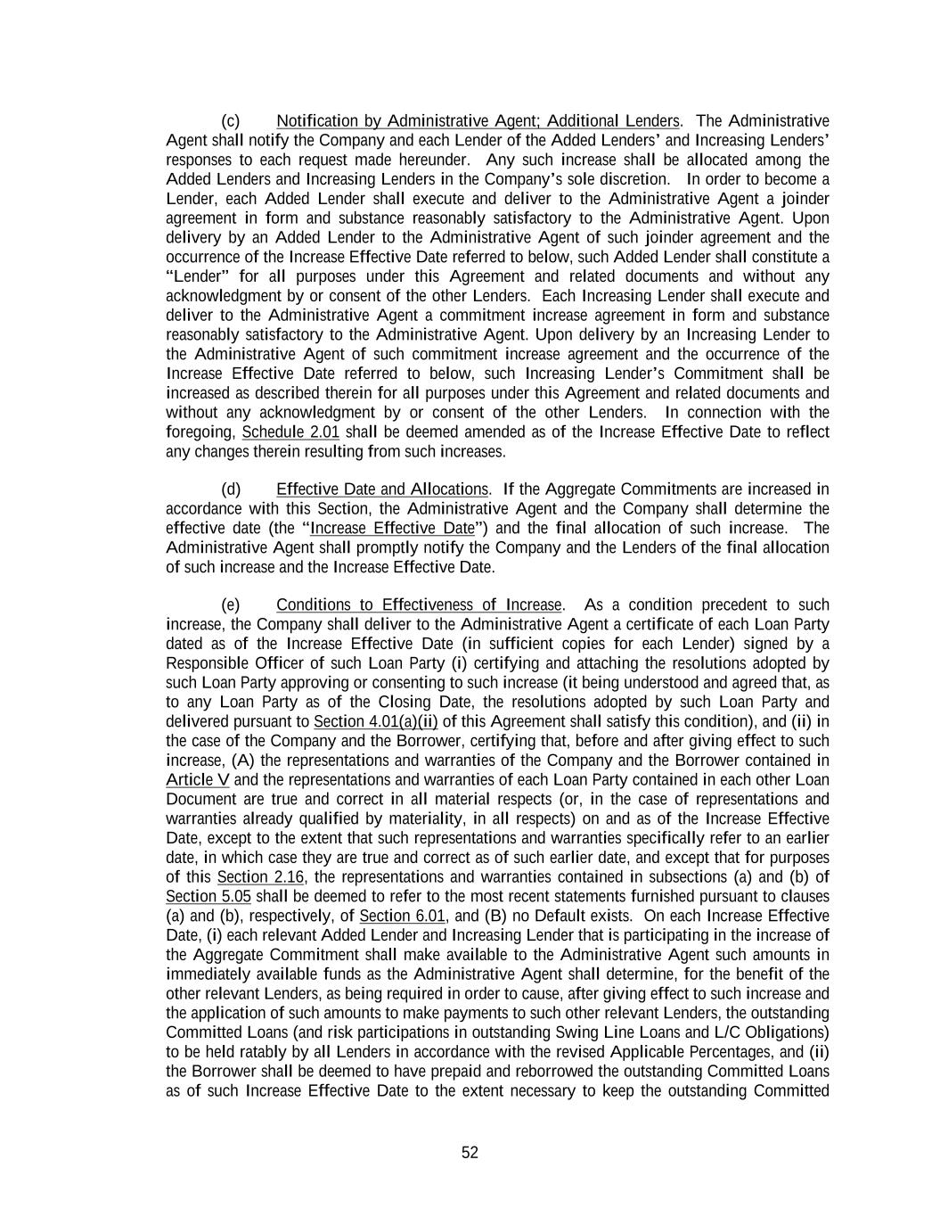 52 (c) Notification by Administrative Agent; Additional Lenders. The Administrative Agent shall notify the Company and each Lender of the Added Lenders’ and Increasing Lenders’ responses to each request made hereunder. Any such increase shall be allocated among the Added Lenders and Increasing Lenders in the Company’s sole discretion. In order to become a Lender, each Added Lender shall execute and deliver to the Administrative Agent a joinder agreement in form and substance reasonably satisfactory to the Administrative Agent. Upon delivery by an Added Lender to the Administrative Agent of such joinder agreement and the occurrence of the Increase Effective Date referred to below, such Added Lender shall constitute a “Lender” for all purposes under this Agreement and related documents and without any acknowledgment by or consent of the other Lenders. Each Increasing Lender shall execute and deliver to the Administrative Agent a commitment increase agreement in form and substance reasonably satisfactory to the Administrative Agent. Upon delivery by an Increasing Lender to the Administrative Agent of such commitment increase agreement and the occurrence of the Increase Effective Date referred to below, such Increasing Lender’s Commitment shall be increased as described therein for all purposes under this Agreement and related documents and without any acknowledgment by or consent of the other Lenders. In connection with the foregoing, Schedule 2.01 shall be deemed amended as of the Increase Effective Date to reflect any changes therein resulting from such increases. (d) Effective Date and Allocations. If the Aggregate Commitments are increased in accordance with this Section, the Administrative Agent and the Company shall determine the effective date (the “Increase Effective Date”) and the final allocation of such increase. The Administrative Agent shall promptly notify the Company and the Lenders of the final allocation of such increase and the Increase Effective Date. (e) Conditions to Effectiveness of Increase. As a condition precedent to such increase, the Company shall deliver to the Administrative Agent a certificate of each Loan Party dated as of the Increase Effective Date (in sufficient copies for each Lender) signed by a Responsible Officer of such Loan Party (i) certifying and attaching the resolutions adopted by such Loan Party approving or consenting to such increase (it being understood and agreed that, as to any Loan Party as of the Closing Date, the resolutions adopted by such Loan Party and delivered pursuant to Section 4.01(a)(ii) of this Agreement shall satisfy this condition), and (ii) in the case of the Company and the Borrower, certifying that, before and after giving effect to such increase, (A) the representations and warranties of the Company and the Borrower contained in Article V and the representations and warranties of each Loan Party contained in each other Loan Document are true and correct in all material respects (or, in the case of representations and warranties already qualified by materiality, in all respects) on and as of the Increase Effective Date, except to the extent that such representations and warranties specifically refer to an earlier date, in which case they are true and correct as of such earlier date, and except that for purposes of this Section 2.16, the representations and warranties contained in subsections (a) and (b) of Section 5.05 shall be deemed to refer to the most recent statements furnished pursuant to clauses (a) and (b), respectively, of Section 6.01, and (B) no Default exists. On each Increase Effective Date, (i) each relevant Added Lender and Increasing Lender that is participating in the increase of the Aggregate Commitment shall make available to the Administrative Agent such amounts in immediately available funds as the Administrative Agent shall determine, for the benefit of the other relevant Lenders, as being required in order to cause, after giving effect to such increase and the application of such amounts to make payments to such other relevant Lenders, the outstanding Committed Loans (and risk participations in outstanding Swing Line Loans and L/C Obligations) to be held ratably by all Lenders in accordance with the revised Applicable Percentages, and (ii) the Borrower shall be deemed to have prepaid and reborrowed the outstanding Committed Loans as of such Increase Effective Date to the extent necessary to keep the outstanding Committed