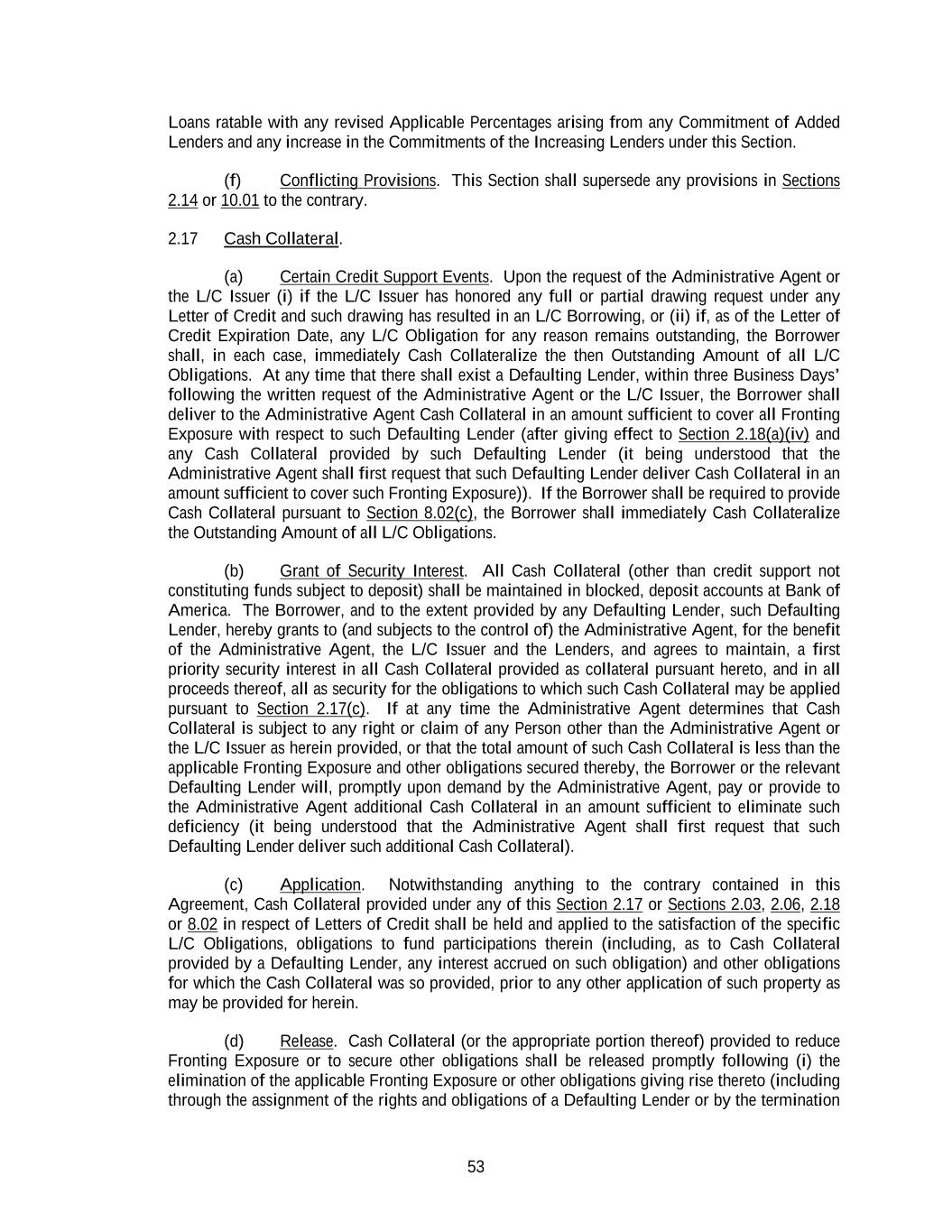 53 Loans ratable with any revised Applicable Percentages arising from any Commitment of Added Lenders and any increase in the Commitments of the Increasing Lenders under this Section. (f) Conflicting Provisions. This Section shall supersede any provisions in Sections 2.14 or 10.01 to the contrary. 2.17 Cash Collateral. (a) Certain Credit Support Events. Upon the request of the Administrative Agent or the L/C Issuer (i) if the L/C Issuer has honored any full or partial drawing request under any Letter of Credit and such drawing has resulted in an L/C Borrowing, or (ii) if, as of the Letter of Credit Expiration Date, any L/C Obligation for any reason remains outstanding, the Borrower shall, in each case, immediately Cash Collateralize the then Outstanding Amount of all L/C Obligations. At any time that there shall exist a Defaulting Lender, within three Business Days’ following the written request of the Administrative Agent or the L/C Issuer, the Borrower shall deliver to the Administrative Agent Cash Collateral in an amount sufficient to cover all Fronting Exposure with respect to such Defaulting Lender (after giving effect to Section 2.18(a)(iv) and any Cash Collateral provided by such Defaulting Lender (it being understood that the Administrative Agent shall first request that such Defaulting Lender deliver Cash Collateral in an amount sufficient to cover such Fronting Exposure)). If the Borrower shall be required to provide Cash Collateral pursuant to Section 8.02(c), the Borrower shall immediately Cash Collateralize the Outstanding Amount of all L/C Obligations. (b) Grant of Security Interest. All Cash Collateral (other than credit support not constituting funds subject to deposit) shall be maintained in blocked, deposit accounts at Bank of America. The Borrower, and to the extent provided by any Defaulting Lender, such Defaulting Lender, hereby grants to (and subjects to the control of) the Administrative Agent, for the benefit of the Administrative Agent, the L/C Issuer and the Lenders, and agrees to maintain, a first priority security interest in all Cash Collateral provided as collateral pursuant hereto, and in all proceeds thereof, all as security for the obligations to which such Cash Collateral may be applied pursuant to Section 2.17(c). If at any time the Administrative Agent determines that Cash Collateral is subject to any right or claim of any Person other than the Administrative Agent or the L/C Issuer as herein provided, or that the total amount of such Cash Collateral is less than the applicable Fronting Exposure and other obligations secured thereby, the Borrower or the relevant Defaulting Lender will, promptly upon demand by the Administrative Agent, pay or provide to the Administrative Agent additional Cash Collateral in an amount sufficient to eliminate such deficiency (it being understood that the Administrative Agent shall first request that such Defaulting Lender deliver such additional Cash Collateral). (c) Application. Notwithstanding anything to the contrary contained in this Agreement, Cash Collateral provided under any of this Section 2.17 or Sections 2.03, 2.06, 2.18 or 8.02 in respect of Letters of Credit shall be held and applied to the satisfaction of the specific L/C Obligations, obligations to fund participations therein (including, as to Cash Collateral provided by a Defaulting Lender, any interest accrued on such obligation) and other obligations for which the Cash Collateral was so provided, prior to any other application of such property as may be provided for herein. (d) Release. Cash Collateral (or the appropriate portion thereof) provided to reduce Fronting Exposure or to secure other obligations shall be released promptly following (i) the elimination of the applicable Fronting Exposure or other obligations giving rise thereto (including through the assignment of the rights and obligations of a Defaulting Lender or by the termination