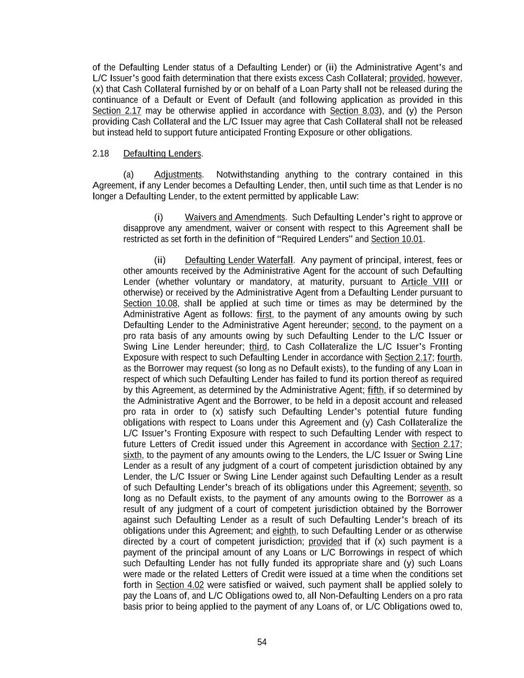 54 of the Defaulting Lender status of a Defaulting Lender) or (ii) the Administrative Agent’s and L/C Issuer’s good faith determination that there exists excess Cash Collateral; provided, however, (x) that Cash Collateral furnished by or on behalf of a Loan Party shall not be released during the continuance of a Default or Event of Default (and following application as provided in this Section 2.17 may be otherwise applied in accordance with Section 8.03), and (y) the Person providing Cash Collateral and the L/C Issuer may agree that Cash Collateral shall not be released but instead held to support future anticipated Fronting Exposure or other obligations. 2.18 Defaulting Lenders. (a) Adjustments. Notwithstanding anything to the contrary contained in this Agreement, if any Lender becomes a Defaulting Lender, then, until such time as that Lender is no longer a Defaulting Lender, to the extent permitted by applicable Law: (i) Waivers and Amendments. Such Defaulting Lender’s right to approve or disapprove any amendment, waiver or consent with respect to this Agreement shall be restricted as set forth in the definition of “Required Lenders” and Section 10.01. (ii) Defaulting Lender Waterfall. Any payment of principal, interest, fees or other amounts received by the Administrative Agent for the account of such Defaulting Lender (whether voluntary or mandatory, at maturity, pursuant to Article VIII or otherwise) or received by the Administrative Agent from a Defaulting Lender pursuant to Section 10.08, shall be applied at such time or times as may be determined by the Administrative Agent as follows: first, to the payment of any amounts owing by such Defaulting Lender to the Administrative Agent hereunder; second, to the payment on a pro rata basis of any amounts owing by such Defaulting Lender to the L/C Issuer or Swing Line Lender hereunder; third, to Cash Collateralize the L/C Issuer’s Fronting Exposure with respect to such Defaulting Lender in accordance with Section 2.17; fourth, as the Borrower may request (so long as no Default exists), to the funding of any Loan in respect of which such Defaulting Lender has failed to fund its portion thereof as required by this Agreement, as determined by the Administrative Agent; fifth, if so determined by the Administrative Agent and the Borrower, to be held in a deposit account and released pro rata in order to (x) satisfy such Defaulting Lender’s potential future funding obligations with respect to Loans under this Agreement and (y) Cash Collateralize the L/C Issuer’s Fronting Exposure with respect to such Defaulting Lender with respect to future Letters of Credit issued under this Agreement in accordance with Section 2.17; sixth, to the payment of any amounts owing to the Lenders, the L/C Issuer or Swing Line Lender as a result of any judgment of a court of competent jurisdiction obtained by any Lender, the L/C Issuer or Swing Line Lender against such Defaulting Lender as a result of such Defaulting Lender’s breach of its obligations under this Agreement; seventh, so long as no Default exists, to the payment of any amounts owing to the Borrower as a result of any judgment of a court of competent jurisdiction obtained by the Borrower against such Defaulting Lender as a result of such Defaulting Lender’s breach of its obligations under this Agreement; and eighth, to such Defaulting Lender or as otherwise directed by a court of competent jurisdiction; provided that if (x) such payment is a payment of the principal amount of any Loans or L/C Borrowings in respect of which such Defaulting Lender has not fully funded its appropriate share and (y) such Loans were made or the related Letters of Credit were issued at a time when the conditions set forth in Section 4.02 were satisfied or waived, such payment shall be applied solely to pay the Loans of, and L/C Obligations owed to, all Non-Defaulting Lenders on a pro rata basis prior to being applied to the payment of any Loans of, or L/C Obligations owed to,