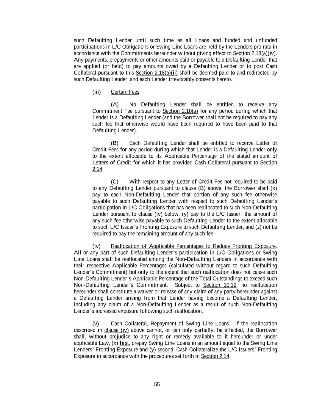 55 such Defaulting Lender until such time as all Loans and funded and unfunded participations in L/C Obligations or Swing Line Loans are held by the Lenders pro rata in accordance with the Commitments hereunder without giving effect to Section 2.18(a)(iv). Any payments, prepayments or other amounts paid or payable to a Defaulting Lender that are applied (or held) to pay amounts owed by a Defaulting Lender or to post Cash Collateral pursuant to this Section 2.18(a)(ii) shall be deemed paid to and redirected by such Defaulting Lender, and each Lender irrevocably consents hereto. (iii) Certain Fees. (A) No Defaulting Lender shall be entitled to receive any Commitment Fee pursuant to Section 2.10(a) for any period during which that Lender is a Defaulting Lender (and the Borrower shall not be required to pay any such fee that otherwise would have been required to have been paid to that Defaulting Lender). (B) Each Defaulting Lender shall be entitled to receive Letter of Credit Fees for any period during which that Lender is a Defaulting Lender only to the extent allocable to its Applicable Percentage of the stated amount of Letters of Credit for which it has provided Cash Collateral pursuant to Section 2.14. (C) With respect to any Letter of Credit Fee not required to be paid to any Defaulting Lender pursuant to clause (B) above, the Borrower shall (x) pay to each Non-Defaulting Lender that portion of any such fee otherwise payable to such Defaulting Lender with respect to such Defaulting Lender’s participation in L/C Obligations that has been reallocated to such Non-Defaulting Lender pursuant to clause (iv) below, (y) pay to the L/C Issuer the amount of any such fee otherwise payable to such Defaulting Lender to the extent allocable to such L/C Issuer’s Fronting Exposure to such Defaulting Lender, and (z) not be required to pay the remaining amount of any such fee. (iv) Reallocation of Applicable Percentages to Reduce Fronting Exposure. All or any part of such Defaulting Lender’s participation in L/C Obligations or Swing Line Loans shall be reallocated among the Non-Defaulting Lenders in accordance with their respective Applicable Percentages (calculated without regard to such Defaulting Lender’s Commitment) but only to the extent that such reallocation does not cause such Non-Defaulting Lender’s Applicable Percentage of the Total Outstandings to exceed such Non-Defaulting Lender’s Commitment. Subject to Section 10.19, no reallocation hereunder shall constitute a waiver or release of any claim of any party hereunder against a Defaulting Lender arising from that Lender having become a Defaulting Lender, including any claim of a Non-Defaulting Lender as a result of such Non-Defaulting Lender’s increased exposure following such reallocation. (v) Cash Collateral, Repayment of Swing Line Loans. If the reallocation described in clause (iv) above cannot, or can only partially, be effected, the Borrower shall, without prejudice to any right or remedy available to it hereunder or under applicable Law, (x) first, prepay Swing Line Loans in an amount equal to the Swing Line Lenders’ Fronting Exposure and (y) second, Cash Collateralize the L/C Issuers’ Fronting Exposure in accordance with the procedures set forth in Section 2.14.