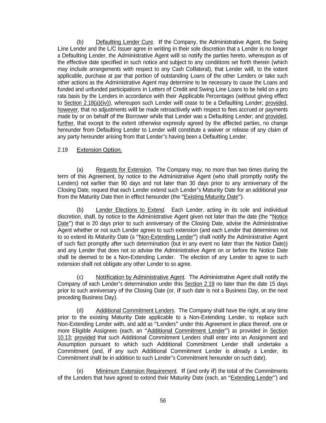 56 (b) Defaulting Lender Cure. If the Company, the Administrative Agent, the Swing Line Lender and the L/C Issuer agree in writing in their sole discretion that a Lender is no longer a Defaulting Lender, the Administrative Agent will so notify the parties hereto, whereupon as of the effective date specified in such notice and subject to any conditions set forth therein (which may include arrangements with respect to any Cash Collateral), that Lender will, to the extent applicable, purchase at par that portion of outstanding Loans of the other Lenders or take such other actions as the Administrative Agent may determine to be necessary to cause the Loans and funded and unfunded participations in Letters of Credit and Swing Line Loans to be held on a pro rata basis by the Lenders in accordance with their Applicable Percentages (without giving effect to Section 2.18(a)(iv)), whereupon such Lender will cease to be a Defaulting Lender; provided, however, that no adjustments will be made retroactively with respect to fees accrued or payments made by or on behalf of the Borrower while that Lender was a Defaulting Lender; and provided, further, that except to the extent otherwise expressly agreed by the affected parties, no change hereunder from Defaulting Lender to Lender will constitute a waiver or release of any claim of any party hereunder arising from that Lender’s having been a Defaulting Lender. 2.19 Extension Option. (a) Requests for Extension. The Company may, no more than two times during the term of this Agreement, by notice to the Administrative Agent (who shall promptly notify the Lenders) not earlier than 90 days and not later than 30 days prior to any anniversary of the Closing Date, request that each Lender extend such Lender’s Maturity Date for an additional year from the Maturity Date then in effect hereunder (the “Existing Maturity Date”). (b) Lender Elections to Extend. Each Lender, acting in its sole and individual discretion, shall, by notice to the Administrative Agent given not later than the date (the “Notice Date”) that is 20 days prior to such anniversary of the Closing Date, advise the Administrative Agent whether or not such Lender agrees to such extension (and each Lender that determines not to so extend its Maturity Date (a “Non-Extending Lender”) shall notify the Administrative Agent of such fact promptly after such determination (but in any event no later than the Notice Date)) and any Lender that does not so advise the Administrative Agent on or before the Notice Date shall be deemed to be a Non-Extending Lender. The election of any Lender to agree to such extension shall not obligate any other Lender to so agree. (c) Notification by Administrative Agent. The Administrative Agent shall notify the Company of each Lender’s determination under this Section 2.19 no later than the date 15 days prior to such anniversary of the Closing Date (or, if such date is not a Business Day, on the next preceding Business Day). (d) Additional Commitment Lenders. The Company shall have the right, at any time prior to the existing Maturity Date applicable to a Non-Extending Lender, to replace such Non-Extending Lender with, and add as “Lenders” under this Agreement in place thereof, one or more Eligible Assignees (each, an “Additional Commitment Lender”) as provided in Section 10.13; provided that such Additional Commitment Lenders shall enter into an Assignment and Assumption pursuant to which such Additional Commitment Lender shall undertake a Commitment (and, if any such Additional Commitment Lender is already a Lender, its Commitment shall be in addition to such Lender’s Commitment hereunder on such date). (e) Minimum Extension Requirement. If (and only if) the total of the Commitments of the Lenders that have agreed to extend their Maturity Date (each, an “Extending Lender”) and