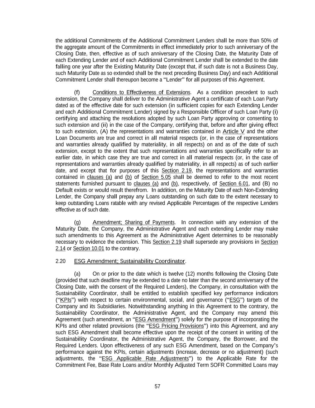 57 the additional Commitments of the Additional Commitment Lenders shall be more than 50% of the aggregate amount of the Commitments in effect immediately prior to such anniversary of the Closing Date, then, effective as of such anniversary of the Closing Date, the Maturity Date of each Extending Lender and of each Additional Commitment Lender shall be extended to the date falling one year after the Existing Maturity Date (except that, if such date is not a Business Day, such Maturity Date as so extended shall be the next preceding Business Day) and each Additional Commitment Lender shall thereupon become a “Lender” for all purposes of this Agreement. (f) Conditions to Effectiveness of Extensions. As a condition precedent to such extension, the Company shall deliver to the Administrative Agent a certificate of each Loan Party dated as of the effective date for such extension (in sufficient copies for each Extending Lender and each Additional Commitment Lender) signed by a Responsible Officer of such Loan Party (i) certifying and attaching the resolutions adopted by such Loan Party approving or consenting to such extension and (ii) in the case of the Company, certifying that, before and after giving effect to such extension, (A) the representations and warranties contained in Article V and the other Loan Documents are true and correct in all material respects (or, in the case of representations and warranties already qualified by materiality, in all respects) on and as of the date of such extension, except to the extent that such representations and warranties specifically refer to an earlier date, in which case they are true and correct in all material respects (or, in the case of representations and warranties already qualified by materiality, in all respects) as of such earlier date, and except that for purposes of this Section 2.19, the representations and warranties contained in clauses (a) and (b) of Section 5.05 shall be deemed to refer to the most recent statements furnished pursuant to clauses (a) and (b), respectively, of Section 6.01, and (B) no Default exists or would result therefrom. In addition, on the Maturity Date of each Non-Extending Lender, the Company shall prepay any Loans outstanding on such date to the extent necessary to keep outstanding Loans ratable with any revised Applicable Percentages of the respective Lenders effective as of such date. (g) Amendment; Sharing of Payments. In connection with any extension of the Maturity Date, the Company, the Administrative Agent and each extending Lender may make such amendments to this Agreement as the Administrative Agent determines to be reasonably necessary to evidence the extension. This Section 2.19 shall supersede any provisions in Section 2.14 or Section 10.01 to the contrary. 2.20 ESG Amendment; Sustainability Coordinator. (a) On or prior to the date which is twelve (12) months following the Closing Date (provided that such deadline may be extended to a date no later than the second anniversary of the Closing Date, with the consent of the Required Lenders), the Company, in consultation with the Sustainability Coordinator, shall be entitled to establish specified key performance indicators (“KPIs”) with respect to certain environmental, social, and governance (“ESG”) targets of the Company and its Subsidiaries. Notwithstanding anything in this Agreement to the contrary, the Sustainability Coordinator, the Administrative Agent, and the Company may amend this Agreement (such amendment, an “ESG Amendment”) solely for the purpose of incorporating the KPIs and other related provisions (the “ESG Pricing Provisions”) into this Agreement, and any such ESG Amendment shall become effective upon the receipt of the consent in writing of the Sustainability Coordinator, the Administrative Agent, the Company, the Borrower, and the Required Lenders. Upon effectiveness of any such ESG Amendment, based on the Company’s performance against the KPIs, certain adjustments (increase, decrease or no adjustment) (such adjustments, the “ESG Applicable Rate Adjustments”) to the Applicable Rate for the Commitment Fee, Base Rate Loans and/or Monthly Adjusted Term SOFR Committed Loans may