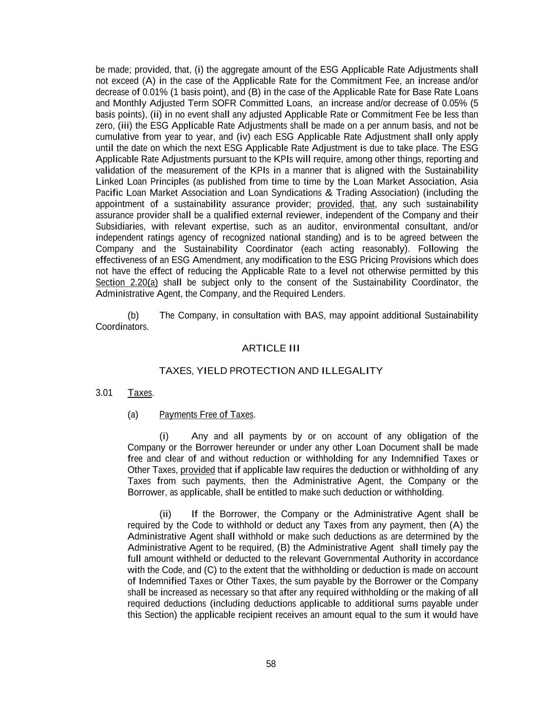 58 be made; provided, that, (i) the aggregate amount of the ESG Applicable Rate Adjustments shall not exceed (A) in the case of the Applicable Rate for the Commitment Fee, an increase and/or decrease of 0.01% (1 basis point), and (B) in the case of the Applicable Rate for Base Rate Loans and Monthly Adjusted Term SOFR Committed Loans, an increase and/or decrease of 0.05% (5 basis points), (ii) in no event shall any adjusted Applicable Rate or Commitment Fee be less than zero, (iii) the ESG Applicable Rate Adjustments shall be made on a per annum basis, and not be cumulative from year to year, and (iv) each ESG Applicable Rate Adjustment shall only apply until the date on which the next ESG Applicable Rate Adjustment is due to take place. The ESG Applicable Rate Adjustments pursuant to the KPIs will require, among other things, reporting and validation of the measurement of the KPIs in a manner that is aligned with the Sustainability Linked Loan Principles (as published from time to time by the Loan Market Association, Asia Pacific Loan Market Association and Loan Syndications & Trading Association) (including the appointment of a sustainability assurance provider; provided, that, any such sustainability assurance provider shall be a qualified external reviewer, independent of the Company and their Subsidiaries, with relevant expertise, such as an auditor, environmental consultant, and/or independent ratings agency of recognized national standing) and is to be agreed between the Company and the Sustainability Coordinator (each acting reasonably). Following the effectiveness of an ESG Amendment, any modification to the ESG Pricing Provisions which does not have the effect of reducing the Applicable Rate to a level not otherwise permitted by this Section 2.20(a) shall be subject only to the consent of the Sustainability Coordinator, the Administrative Agent, the Company, and the Required Lenders. (b) The Company, in consultation with BAS, may appoint additional Sustainability Coordinators. ARTICLE III TAXES, YIELD PROTECTION AND ILLEGALITY 3.01 Taxes. (a) Payments Free of Taxes. (i) Any and all payments by or on account of any obligation of the Company or the Borrower hereunder or under any other Loan Document shall be made free and clear of and without reduction or withholding for any Indemnified Taxes or Other Taxes, provided that if applicable law requires the deduction or withholding of any Taxes from such payments, then the Administrative Agent, the Company or the Borrower, as applicable, shall be entitled to make such deduction or withholding. (ii) If the Borrower, the Company or the Administrative Agent shall be required by the Code to withhold or deduct any Taxes from any payment, then (A) the Administrative Agent shall withhold or make such deductions as are determined by the Administrative Agent to be required, (B) the Administrative Agent shall timely pay the full amount withheld or deducted to the relevant Governmental Authority in accordance with the Code, and (C) to the extent that the withholding or deduction is made on account of Indemnified Taxes or Other Taxes, the sum payable by the Borrower or the Company shall be increased as necessary so that after any required withholding or the making of all required deductions (including deductions applicable to additional sums payable under this Section) the applicable recipient receives an amount equal to the sum it would have