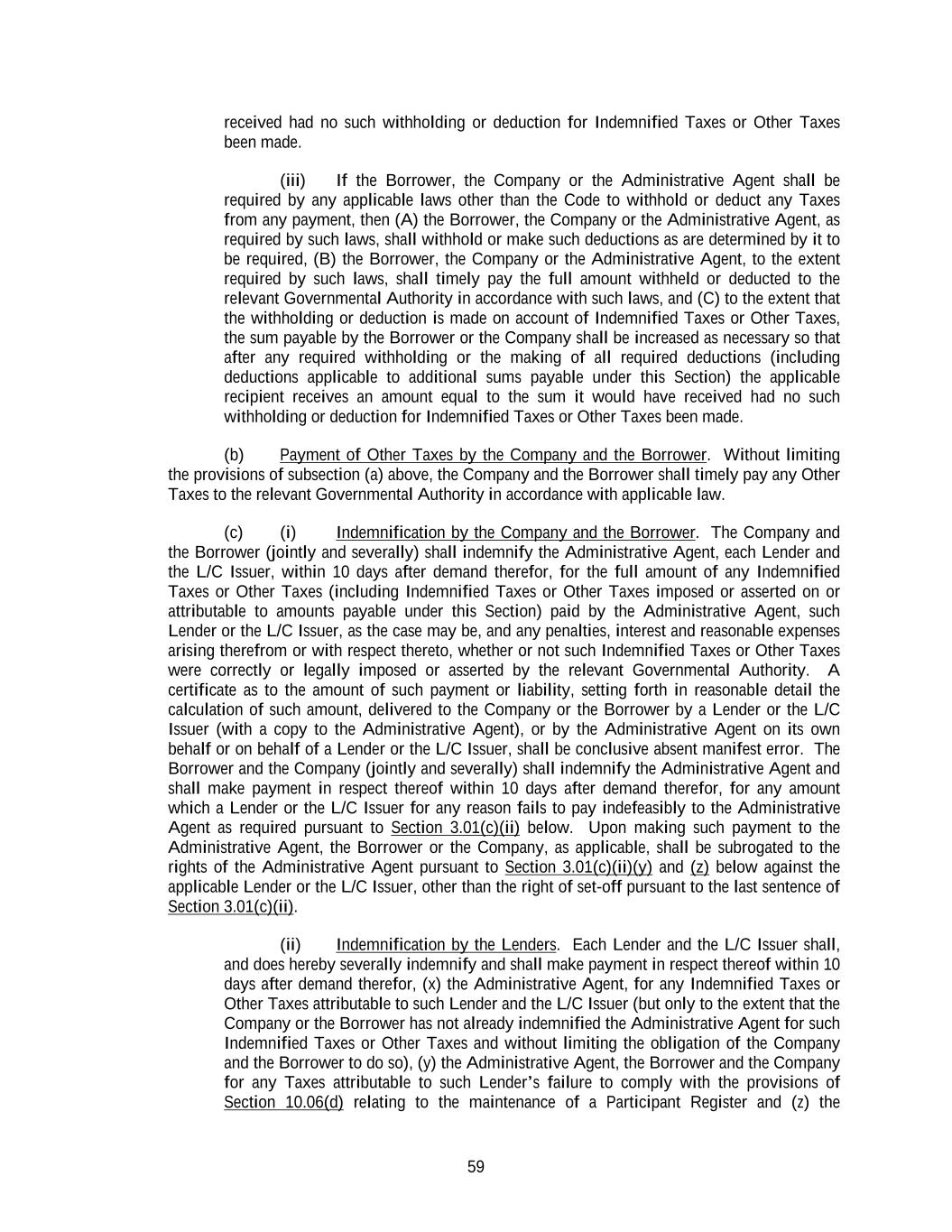 59 received had no such withholding or deduction for Indemnified Taxes or Other Taxes been made. (iii) If the Borrower, the Company or the Administrative Agent shall be required by any applicable laws other than the Code to withhold or deduct any Taxes from any payment, then (A) the Borrower, the Company or the Administrative Agent, as required by such laws, shall withhold or make such deductions as are determined by it to be required, (B) the Borrower, the Company or the Administrative Agent, to the extent required by such laws, shall timely pay the full amount withheld or deducted to the relevant Governmental Authority in accordance with such laws, and (C) to the extent that the withholding or deduction is made on account of Indemnified Taxes or Other Taxes, the sum payable by the Borrower or the Company shall be increased as necessary so that after any required withholding or the making of all required deductions (including deductions applicable to additional sums payable under this Section) the applicable recipient receives an amount equal to the sum it would have received had no such withholding or deduction for Indemnified Taxes or Other Taxes been made. (b) Payment of Other Taxes by the Company and the Borrower. Without limiting the provisions of subsection (a) above, the Company and the Borrower shall timely pay any Other Taxes to the relevant Governmental Authority in accordance with applicable law. (c) (i) Indemnification by the Company and the Borrower. The Company and the Borrower (jointly and severally) shall indemnify the Administrative Agent, each Lender and the L/C Issuer, within 10 days after demand therefor, for the full amount of any Indemnified Taxes or Other Taxes (including Indemnified Taxes or Other Taxes imposed or asserted on or attributable to amounts payable under this Section) paid by the Administrative Agent, such Lender or the L/C Issuer, as the case may be, and any penalties, interest and reasonable expenses arising therefrom or with respect thereto, whether or not such Indemnified Taxes or Other Taxes were correctly or legally imposed or asserted by the relevant Governmental Authority. A certificate as to the amount of such payment or liability, setting forth in reasonable detail the calculation of such amount, delivered to the Company or the Borrower by a Lender or the L/C Issuer (with a copy to the Administrative Agent), or by the Administrative Agent on its own behalf or on behalf of a Lender or the L/C Issuer, shall be conclusive absent manifest error. The Borrower and the Company (jointly and severally) shall indemnify the Administrative Agent and shall make payment in respect thereof within 10 days after demand therefor, for any amount which a Lender or the L/C Issuer for any reason fails to pay indefeasibly to the Administrative Agent as required pursuant to Section 3.01(c)(ii) below. Upon making such payment to the Administrative Agent, the Borrower or the Company, as applicable, shall be subrogated to the rights of the Administrative Agent pursuant to Section 3.01(c)(ii)(y) and (z) below against the applicable Lender or the L/C Issuer, other than the right of set-off pursuant to the last sentence of Section 3.01(c)(ii). (ii) Indemnification by the Lenders. Each Lender and the L/C Issuer shall, and does hereby severally indemnify and shall make payment in respect thereof within 10 days after demand therefor, (x) the Administrative Agent, for any Indemnified Taxes or Other Taxes attributable to such Lender and the L/C Issuer (but only to the extent that the Company or the Borrower has not already indemnified the Administrative Agent for such Indemnified Taxes or Other Taxes and without limiting the obligation of the Company and the Borrower to do so), (y) the Administrative Agent, the Borrower and the Company for any Taxes attributable to such Lender’s failure to comply with the provisions of Section 10.06(d) relating to the maintenance of a Participant Register and (z) the