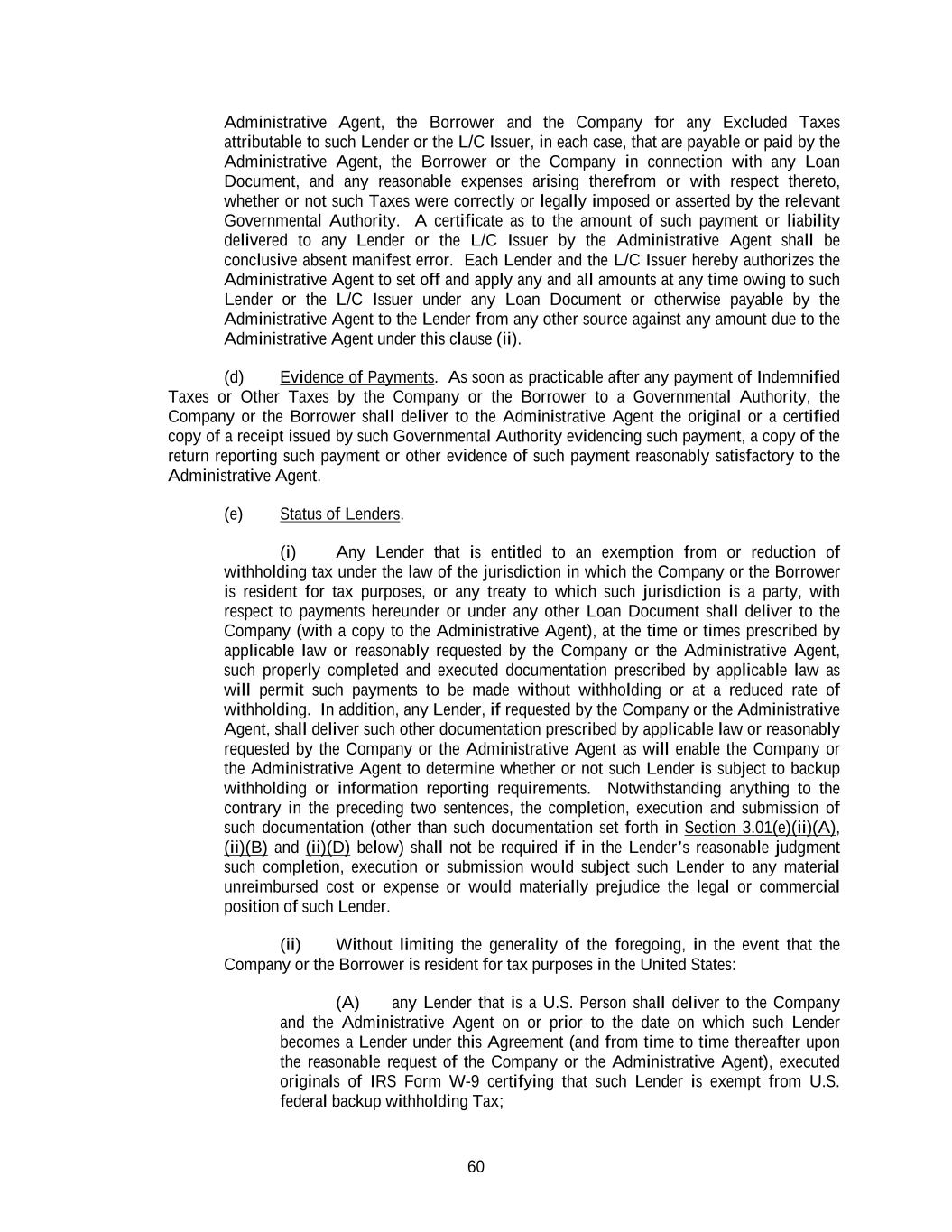 60 Administrative Agent, the Borrower and the Company for any Excluded Taxes attributable to such Lender or the L/C Issuer, in each case, that are payable or paid by the Administrative Agent, the Borrower or the Company in connection with any Loan Document, and any reasonable expenses arising therefrom or with respect thereto, whether or not such Taxes were correctly or legally imposed or asserted by the relevant Governmental Authority. A certificate as to the amount of such payment or liability delivered to any Lender or the L/C Issuer by the Administrative Agent shall be conclusive absent manifest error. Each Lender and the L/C Issuer hereby authorizes the Administrative Agent to set off and apply any and all amounts at any time owing to such Lender or the L/C Issuer under any Loan Document or otherwise payable by the Administrative Agent to the Lender from any other source against any amount due to the Administrative Agent under this clause (ii). (d) Evidence of Payments. As soon as practicable after any payment of Indemnified Taxes or Other Taxes by the Company or the Borrower to a Governmental Authority, the Company or the Borrower shall deliver to the Administrative Agent the original or a certified copy of a receipt issued by such Governmental Authority evidencing such payment, a copy of the return reporting such payment or other evidence of such payment reasonably satisfactory to the Administrative Agent. (e) Status of Lenders. (i) Any Lender that is entitled to an exemption from or reduction of withholding tax under the law of the jurisdiction in which the Company or the Borrower is resident for tax purposes, or any treaty to which such jurisdiction is a party, with respect to payments hereunder or under any other Loan Document shall deliver to the Company (with a copy to the Administrative Agent), at the time or times prescribed by applicable law or reasonably requested by the Company or the Administrative Agent, such properly completed and executed documentation prescribed by applicable law as will permit such payments to be made without withholding or at a reduced rate of withholding. In addition, any Lender, if requested by the Company or the Administrative Agent, shall deliver such other documentation prescribed by applicable law or reasonably requested by the Company or the Administrative Agent as will enable the Company or the Administrative Agent to determine whether or not such Lender is subject to backup withholding or information reporting requirements. Notwithstanding anything to the contrary in the preceding two sentences, the completion, execution and submission of such documentation (other than such documentation set forth in Section 3.01(e)(ii)(A), (ii)(B) and (ii)(D) below) shall not be required if in the Lender’s reasonable judgment such completion, execution or submission would subject such Lender to any material unreimbursed cost or expense or would materially prejudice the legal or commercial position of such Lender. (ii) Without limiting the generality of the foregoing, in the event that the Company or the Borrower is resident for tax purposes in the United States: (A) any Lender that is a U.S. Person shall deliver to the Company and the Administrative Agent on or prior to the date on which such Lender becomes a Lender under this Agreement (and from time to time thereafter upon the reasonable request of the Company or the Administrative Agent), executed originals of IRS Form W-9 certifying that such Lender is exempt from U.S. federal backup withholding Tax;
