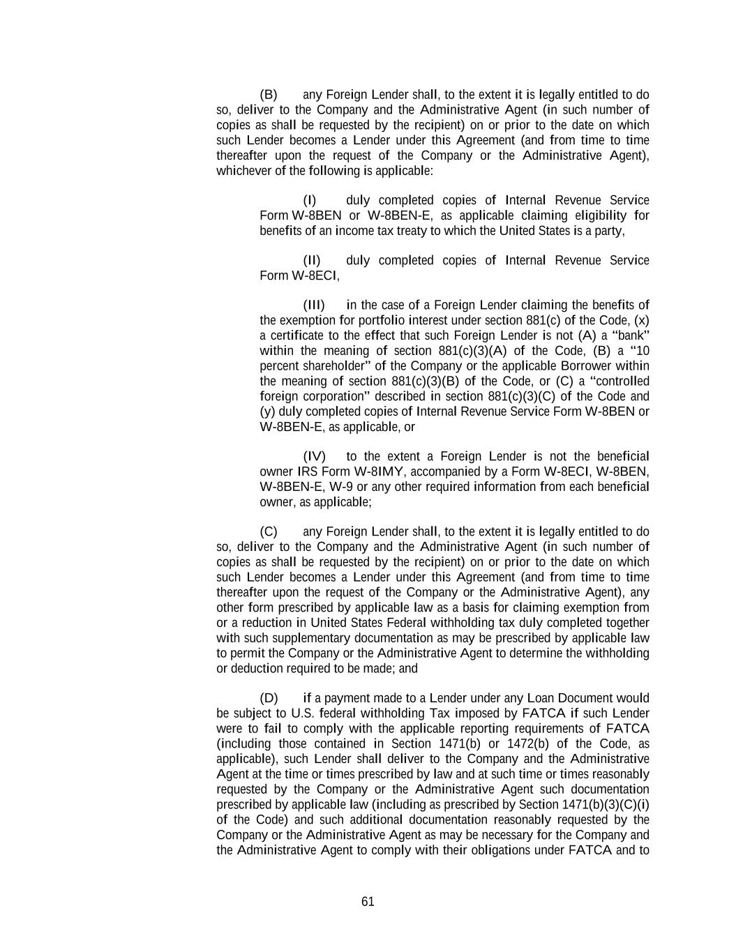 61 (B) any Foreign Lender shall, to the extent it is legally entitled to do so, deliver to the Company and the Administrative Agent (in such number of copies as shall be requested by the recipient) on or prior to the date on which such Lender becomes a Lender under this Agreement (and from time to time thereafter upon the request of the Company or the Administrative Agent), whichever of the following is applicable: (I) duly completed copies of Internal Revenue Service Form W-8BEN or W-8BEN-E, as applicable claiming eligibility for benefits of an income tax treaty to which the United States is a party, (II) duly completed copies of Internal Revenue Service Form W-8ECI, (III) in the case of a Foreign Lender claiming the benefits of the exemption for portfolio interest under section 881(c) of the Code, (x) a certificate to the effect that such Foreign Lender is not (A) a “bank” within the meaning of section 881(c)(3)(A) of the Code, (B) a “10 percent shareholder” of the Company or the applicable Borrower within the meaning of section 881(c)(3)(B) of the Code, or (C) a “controlled foreign corporation” described in section 881(c)(3)(C) of the Code and (y) duly completed copies of Internal Revenue Service Form W-8BEN or W-8BEN-E, as applicable, or (IV) to the extent a Foreign Lender is not the beneficial owner IRS Form W-8IMY, accompanied by a Form W-8ECI, W-8BEN, W-8BEN-E, W-9 or any other required information from each beneficial owner, as applicable; (C) any Foreign Lender shall, to the extent it is legally entitled to do so, deliver to the Company and the Administrative Agent (in such number of copies as shall be requested by the recipient) on or prior to the date on which such Lender becomes a Lender under this Agreement (and from time to time thereafter upon the request of the Company or the Administrative Agent), any other form prescribed by applicable law as a basis for claiming exemption from or a reduction in United States Federal withholding tax duly completed together with such supplementary documentation as may be prescribed by applicable law to permit the Company or the Administrative Agent to determine the withholding or deduction required to be made; and (D) if a payment made to a Lender under any Loan Document would be subject to U.S. federal withholding Tax imposed by FATCA if such Lender were to fail to comply with the applicable reporting requirements of FATCA (including those contained in Section 1471(b) or 1472(b) of the Code, as applicable), such Lender shall deliver to the Company and the Administrative Agent at the time or times prescribed by law and at such time or times reasonably requested by the Company or the Administrative Agent such documentation prescribed by applicable law (including as prescribed by Section 1471(b)(3)(C)(i) of the Code) and such additional documentation reasonably requested by the Company or the Administrative Agent as may be necessary for the Company and the Administrative Agent to comply with their obligations under FATCA and to