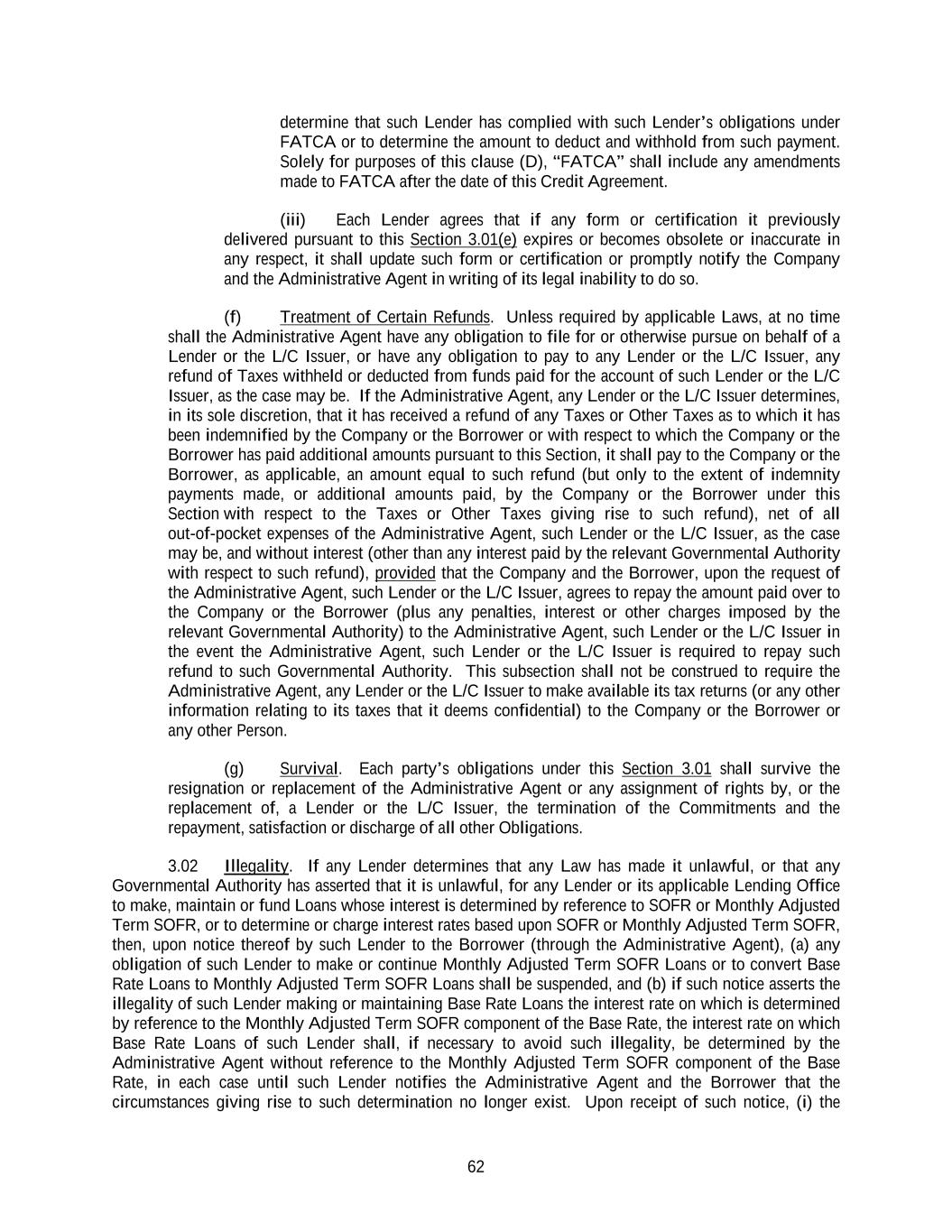 62 determine that such Lender has complied with such Lender’s obligations under FATCA or to determine the amount to deduct and withhold from such payment. Solely for purposes of this clause (D), “FATCA” shall include any amendments made to FATCA after the date of this Credit Agreement. (iii) Each Lender agrees that if any form or certification it previously delivered pursuant to this Section 3.01(e) expires or becomes obsolete or inaccurate in any respect, it shall update such form or certification or promptly notify the Company and the Administrative Agent in writing of its legal inability to do so. (f) Treatment of Certain Refunds. Unless required by applicable Laws, at no time shall the Administrative Agent have any obligation to file for or otherwise pursue on behalf of a Lender or the L/C Issuer, or have any obligation to pay to any Lender or the L/C Issuer, any refund of Taxes withheld or deducted from funds paid for the account of such Lender or the L/C Issuer, as the case may be. If the Administrative Agent, any Lender or the L/C Issuer determines, in its sole discretion, that it has received a refund of any Taxes or Other Taxes as to which it has been indemnified by the Company or the Borrower or with respect to which the Company or the Borrower has paid additional amounts pursuant to this Section, it shall pay to the Company or the Borrower, as applicable, an amount equal to such refund (but only to the extent of indemnity payments made, or additional amounts paid, by the Company or the Borrower under this Section with respect to the Taxes or Other Taxes giving rise to such refund), net of all out-of-pocket expenses of the Administrative Agent, such Lender or the L/C Issuer, as the case may be, and without interest (other than any interest paid by the relevant Governmental Authority with respect to such refund), provided that the Company and the Borrower, upon the request of the Administrative Agent, such Lender or the L/C Issuer, agrees to repay the amount paid over to the Company or the Borrower (plus any penalties, interest or other charges imposed by the relevant Governmental Authority) to the Administrative Agent, such Lender or the L/C Issuer in the event the Administrative Agent, such Lender or the L/C Issuer is required to repay such refund to such Governmental Authority. This subsection shall not be construed to require the Administrative Agent, any Lender or the L/C Issuer to make available its tax returns (or any other information relating to its taxes that it deems confidential) to the Company or the Borrower or any other Person. (g) Survival. Each party’s obligations under this Section 3.01 shall survive the resignation or replacement of the Administrative Agent or any assignment of rights by, or the replacement of, a Lender or the L/C Issuer, the termination of the Commitments and the repayment, satisfaction or discharge of all other Obligations. 3.02 Illegality. If any Lender determines that any Law has made it unlawful, or that any Governmental Authority has asserted that it is unlawful, for any Lender or its applicable Lending Office to make, maintain or fund Loans whose interest is determined by reference to SOFR or Monthly Adjusted Term SOFR, or to determine or charge interest rates based upon SOFR or Monthly Adjusted Term SOFR, then, upon notice thereof by such Lender to the Borrower (through the Administrative Agent), (a) any obligation of such Lender to make or continue Monthly Adjusted Term SOFR Loans or to convert Base Rate Loans to Monthly Adjusted Term SOFR Loans shall be suspended, and (b) if such notice asserts the illegality of such Lender making or maintaining Base Rate Loans the interest rate on which is determined by reference to the Monthly Adjusted Term SOFR component of the Base Rate, the interest rate on which Base Rate Loans of such Lender shall, if necessary to avoid such illegality, be determined by the Administrative Agent without reference to the Monthly Adjusted Term SOFR component of the Base Rate, in each case until such Lender notifies the Administrative Agent and the Borrower that the circumstances giving rise to such determination no longer exist. Upon receipt of such notice, (i) the