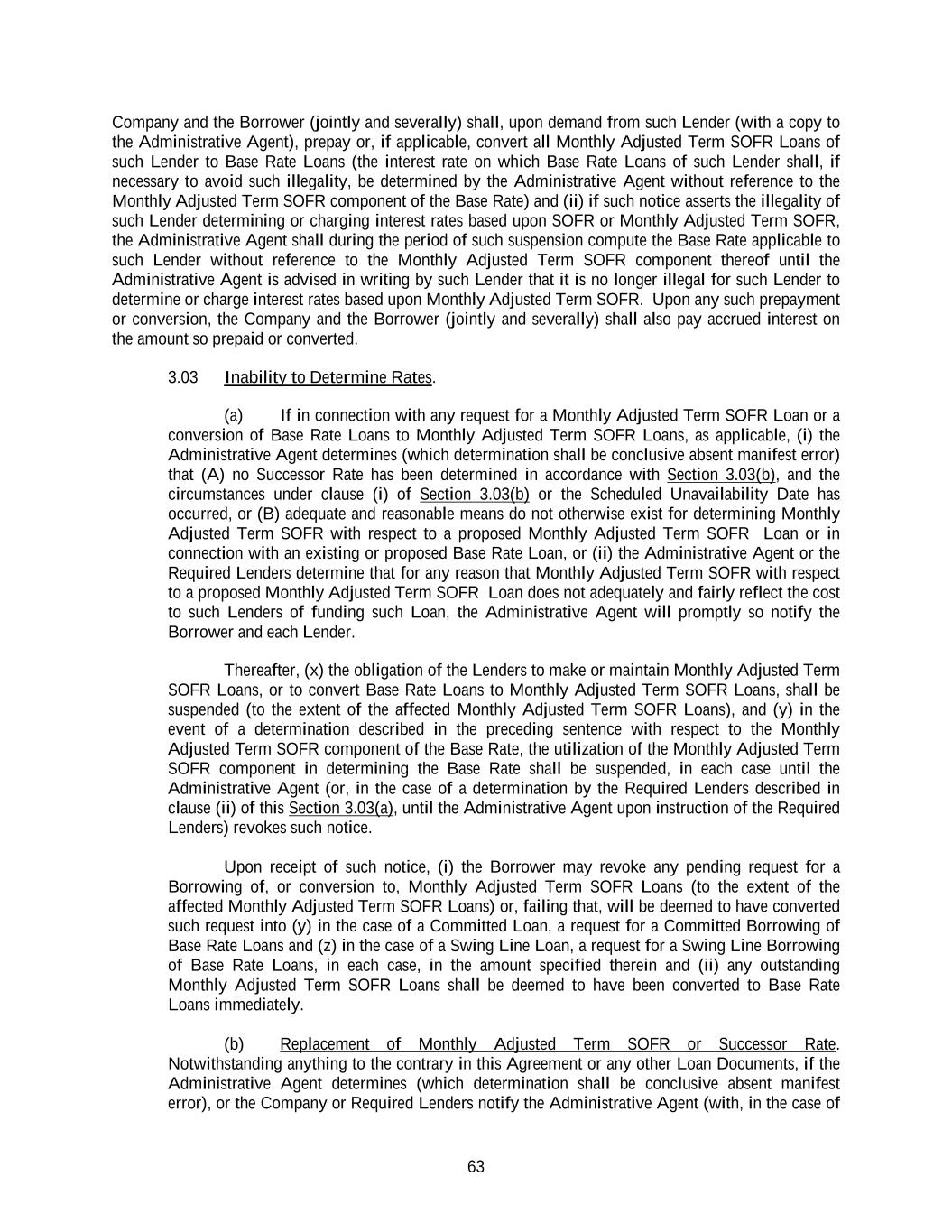 63 Company and the Borrower (jointly and severally) shall, upon demand from such Lender (with a copy to the Administrative Agent), prepay or, if applicable, convert all Monthly Adjusted Term SOFR Loans of such Lender to Base Rate Loans (the interest rate on which Base Rate Loans of such Lender shall, if necessary to avoid such illegality, be determined by the Administrative Agent without reference to the Monthly Adjusted Term SOFR component of the Base Rate) and (ii) if such notice asserts the illegality of such Lender determining or charging interest rates based upon SOFR or Monthly Adjusted Term SOFR, the Administrative Agent shall during the period of such suspension compute the Base Rate applicable to such Lender without reference to the Monthly Adjusted Term SOFR component thereof until the Administrative Agent is advised in writing by such Lender that it is no longer illegal for such Lender to determine or charge interest rates based upon Monthly Adjusted Term SOFR. Upon any such prepayment or conversion, the Company and the Borrower (jointly and severally) shall also pay accrued interest on the amount so prepaid or converted. 3.03 Inability to Determine Rates. (a) If in connection with any request for a Monthly Adjusted Term SOFR Loan or a conversion of Base Rate Loans to Monthly Adjusted Term SOFR Loans, as applicable, (i) the Administrative Agent determines (which determination shall be conclusive absent manifest error) that (A) no Successor Rate has been determined in accordance with Section 3.03(b), and the circumstances under clause (i) of Section 3.03(b) or the Scheduled Unavailability Date has occurred, or (B) adequate and reasonable means do not otherwise exist for determining Monthly Adjusted Term SOFR with respect to a proposed Monthly Adjusted Term SOFR Loan or in connection with an existing or proposed Base Rate Loan, or (ii) the Administrative Agent or the Required Lenders determine that for any reason that Monthly Adjusted Term SOFR with respect to a proposed Monthly Adjusted Term SOFR Loan does not adequately and fairly reflect the cost to such Lenders of funding such Loan, the Administrative Agent will promptly so notify the Borrower and each Lender. Thereafter, (x) the obligation of the Lenders to make or maintain Monthly Adjusted Term SOFR Loans, or to convert Base Rate Loans to Monthly Adjusted Term SOFR Loans, shall be suspended (to the extent of the affected Monthly Adjusted Term SOFR Loans), and (y) in the event of a determination described in the preceding sentence with respect to the Monthly Adjusted Term SOFR component of the Base Rate, the utilization of the Monthly Adjusted Term SOFR component in determining the Base Rate shall be suspended, in each case until the Administrative Agent (or, in the case of a determination by the Required Lenders described in clause (ii) of this Section 3.03(a), until the Administrative Agent upon instruction of the Required Lenders) revokes such notice. Upon receipt of such notice, (i) the Borrower may revoke any pending request for a Borrowing of, or conversion to, Monthly Adjusted Term SOFR Loans (to the extent of the affected Monthly Adjusted Term SOFR Loans) or, failing that, will be deemed to have converted such request into (y) in the case of a Committed Loan, a request for a Committed Borrowing of Base Rate Loans and (z) in the case of a Swing Line Loan, a request for a Swing Line Borrowing of Base Rate Loans, in each case, in the amount specified therein and (ii) any outstanding Monthly Adjusted Term SOFR Loans shall be deemed to have been converted to Base Rate Loans immediately. (b) Replacement of Monthly Adjusted Term SOFR or Successor Rate. Notwithstanding anything to the contrary in this Agreement or any other Loan Documents, if the Administrative Agent determines (which determination shall be conclusive absent manifest error), or the Company or Required Lenders notify the Administrative Agent (with, in the case of