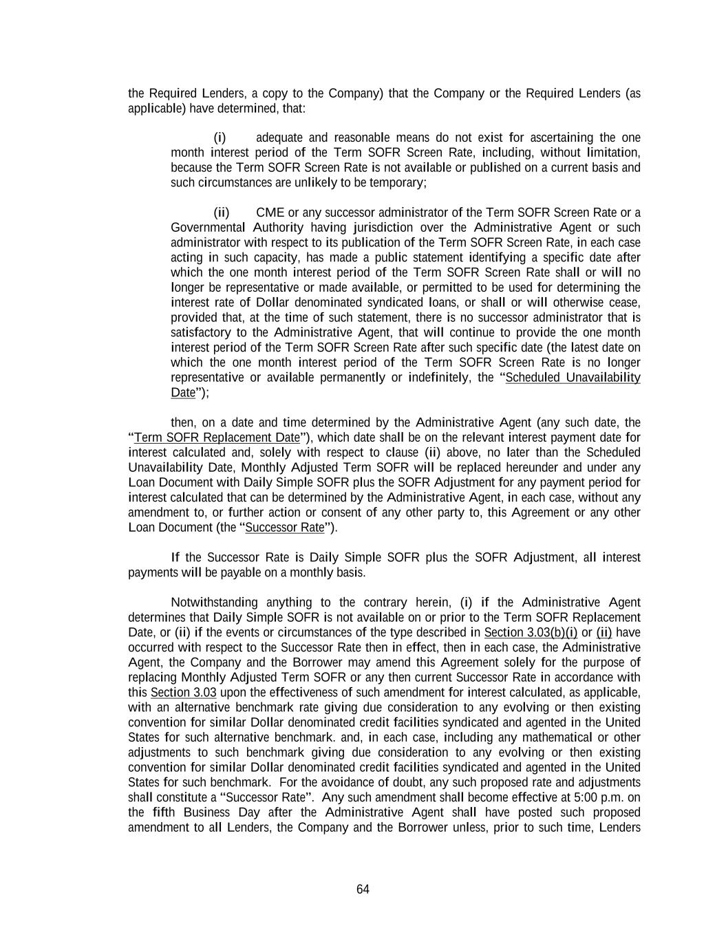 64 the Required Lenders, a copy to the Company) that the Company or the Required Lenders (as applicable) have determined, that: (i) adequate and reasonable means do not exist for ascertaining the one month interest period of the Term SOFR Screen Rate, including, without limitation, because the Term SOFR Screen Rate is not available or published on a current basis and such circumstances are unlikely to be temporary; (ii) CME or any successor administrator of the Term SOFR Screen Rate or a Governmental Authority having jurisdiction over the Administrative Agent or such administrator with respect to its publication of the Term SOFR Screen Rate, in each case acting in such capacity, has made a public statement identifying a specific date after which the one month interest period of the Term SOFR Screen Rate shall or will no longer be representative or made available, or permitted to be used for determining the interest rate of Dollar denominated syndicated loans, or shall or will otherwise cease, provided that, at the time of such statement, there is no successor administrator that is satisfactory to the Administrative Agent, that will continue to provide the one month interest period of the Term SOFR Screen Rate after such specific date (the latest date on which the one month interest period of the Term SOFR Screen Rate is no longer representative or available permanently or indefinitely, the “Scheduled Unavailability Date”); then, on a date and time determined by the Administrative Agent (any such date, the “Term SOFR Replacement Date”), which date shall be on the relevant interest payment date for interest calculated and, solely with respect to clause (ii) above, no later than the Scheduled Unavailability Date, Monthly Adjusted Term SOFR will be replaced hereunder and under any Loan Document with Daily Simple SOFR plus the SOFR Adjustment for any payment period for interest calculated that can be determined by the Administrative Agent, in each case, without any amendment to, or further action or consent of any other party to, this Agreement or any other Loan Document (the “Successor Rate”). If the Successor Rate is Daily Simple SOFR plus the SOFR Adjustment, all interest payments will be payable on a monthly basis. Notwithstanding anything to the contrary herein, (i) if the Administrative Agent determines that Daily Simple SOFR is not available on or prior to the Term SOFR Replacement Date, or (ii) if the events or circumstances of the type described in Section 3.03(b)(i) or (ii) have occurred with respect to the Successor Rate then in effect, then in each case, the Administrative Agent, the Company and the Borrower may amend this Agreement solely for the purpose of replacing Monthly Adjusted Term SOFR or any then current Successor Rate in accordance with this Section 3.03 upon the effectiveness of such amendment for interest calculated, as applicable, with an alternative benchmark rate giving due consideration to any evolving or then existing convention for similar Dollar denominated credit facilities syndicated and agented in the United States for such alternative benchmark. and, in each case, including any mathematical or other adjustments to such benchmark giving due consideration to any evolving or then existing convention for similar Dollar denominated credit facilities syndicated and agented in the United States for such benchmark. For the avoidance of doubt, any such proposed rate and adjustments shall constitute a “Successor Rate”. Any such amendment shall become effective at 5:00 p.m. on the fifth Business Day after the Administrative Agent shall have posted such proposed amendment to all Lenders, the Company and the Borrower unless, prior to such time, Lenders