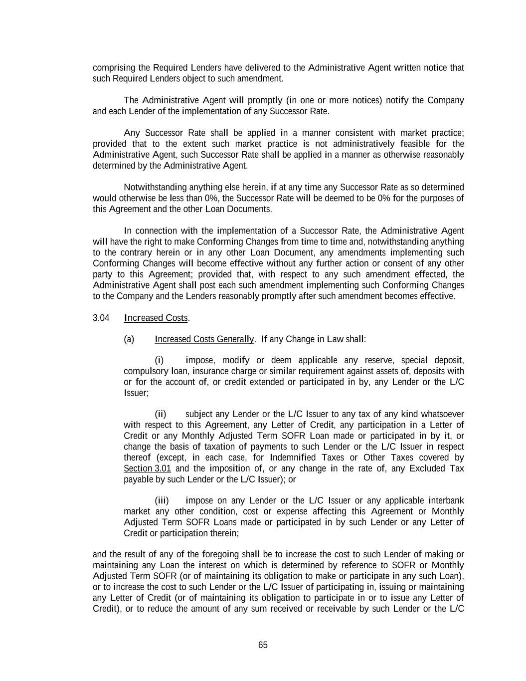 65 comprising the Required Lenders have delivered to the Administrative Agent written notice that such Required Lenders object to such amendment. The Administrative Agent will promptly (in one or more notices) notify the Company and each Lender of the implementation of any Successor Rate. Any Successor Rate shall be applied in a manner consistent with market practice; provided that to the extent such market practice is not administratively feasible for the Administrative Agent, such Successor Rate shall be applied in a manner as otherwise reasonably determined by the Administrative Agent. Notwithstanding anything else herein, if at any time any Successor Rate as so determined would otherwise be less than 0%, the Successor Rate will be deemed to be 0% for the purposes of this Agreement and the other Loan Documents. In connection with the implementation of a Successor Rate, the Administrative Agent will have the right to make Conforming Changes from time to time and, notwithstanding anything to the contrary herein or in any other Loan Document, any amendments implementing such Conforming Changes will become effective without any further action or consent of any other party to this Agreement; provided that, with respect to any such amendment effected, the Administrative Agent shall post each such amendment implementing such Conforming Changes to the Company and the Lenders reasonably promptly after such amendment becomes effective. 3.04 Increased Costs. (a) Increased Costs Generally. If any Change in Law shall: (i) impose, modify or deem applicable any reserve, special deposit, compulsory loan, insurance charge or similar requirement against assets of, deposits with or for the account of, or credit extended or participated in by, any Lender or the L/C Issuer; (ii) subject any Lender or the L/C Issuer to any tax of any kind whatsoever with respect to this Agreement, any Letter of Credit, any participation in a Letter of Credit or any Monthly Adjusted Term SOFR Loan made or participated in by it, or change the basis of taxation of payments to such Lender or the L/C Issuer in respect thereof (except, in each case, for Indemnified Taxes or Other Taxes covered by Section 3.01 and the imposition of, or any change in the rate of, any Excluded Tax payable by such Lender or the L/C Issuer); or (iii) impose on any Lender or the L/C Issuer or any applicable interbank market any other condition, cost or expense affecting this Agreement or Monthly Adjusted Term SOFR Loans made or participated in by such Lender or any Letter of Credit or participation therein; and the result of any of the foregoing shall be to increase the cost to such Lender of making or maintaining any Loan the interest on which is determined by reference to SOFR or Monthly Adjusted Term SOFR (or of maintaining its obligation to make or participate in any such Loan), or to increase the cost to such Lender or the L/C Issuer of participating in, issuing or maintaining any Letter of Credit (or of maintaining its obligation to participate in or to issue any Letter of Credit), or to reduce the amount of any sum received or receivable by such Lender or the L/C