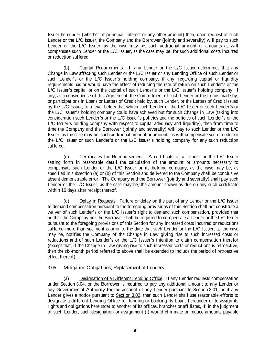 66 Issuer hereunder (whether of principal, interest or any other amount) then, upon request of such Lender or the L/C Issuer, the Company and the Borrower (jointly and severally) will pay to such Lender or the L/C Issuer, as the case may be, such additional amount or amounts as will compensate such Lender or the L/C Issuer, as the case may be, for such additional costs incurred or reduction suffered. (b) Capital Requirements. If any Lender or the L/C Issuer determines that any Change in Law affecting such Lender or the L/C Issuer or any Lending Office of such Lender or such Lender’s or the L/C Issuer’s holding company, if any, regarding capital or liquidity requirements has or would have the effect of reducing the rate of return on such Lender’s or the L/C Issuer’s capital or on the capital of such Lender’s or the L/C Issuer’s holding company, if any, as a consequence of this Agreement, the Commitment of such Lender or the Loans made by, or participations in Loans or Letters of Credit held by, such Lender, or the Letters of Credit issued by the L/C Issuer, to a level below that which such Lender or the L/C Issuer or such Lender’s or the L/C Issuer’s holding company could have achieved but for such Change in Law (taking into consideration such Lender’s or the L/C Issuer’s policies and the policies of such Lender’s or the L/C Issuer’s holding company with respect to capital adequacy and liquidity), then from time to time the Company and the Borrower (jointly and severally) will pay to such Lender or the L/C Issuer, as the case may be, such additional amount or amounts as will compensate such Lender or the L/C Issuer or such Lender’s or the L/C Issuer’s holding company for any such reduction suffered. (c) Certificates for Reimbursement. A certificate of a Lender or the L/C Issuer setting forth in reasonable detail the calculation of the amount or amounts necessary to compensate such Lender or the L/C Issuer or its holding company, as the case may be, as specified in subsection (a) or (b) of this Section and delivered to the Company shall be conclusive absent demonstrable error. The Company and the Borrower (jointly and severally) shall pay such Lender or the L/C Issuer, as the case may be, the amount shown as due on any such certificate within 10 days after receipt thereof. (d) Delay in Requests. Failure or delay on the part of any Lender or the L/C Issuer to demand compensation pursuant to the foregoing provisions of this Section shall not constitute a waiver of such Lender’s or the L/C Issuer’s right to demand such compensation, provided that neither the Company nor the Borrower shall be required to compensate a Lender or the L/C Issuer pursuant to the foregoing provisions of this Section for any increased costs incurred or reductions suffered more than six months prior to the date that such Lender or the L/C Issuer, as the case may be, notifies the Company of the Change in Law giving rise to such increased costs or reductions and of such Lender’s or the L/C Issuer’s intention to claim compensation therefor (except that, if the Change in Law giving rise to such increased costs or reductions is retroactive, then the six-month period referred to above shall be extended to include the period of retroactive effect thereof). 3.05 Mitigation Obligations; Replacement of Lenders. (a) Designation of a Different Lending Office. If any Lender requests compensation under Section 3.04, or the Borrower is required to pay any additional amount to any Lender or any Governmental Authority for the account of any Lender pursuant to Section 3.01, or if any Lender gives a notice pursuant to Section 3.02, then such Lender shall use reasonable efforts to designate a different Lending Office for funding or booking its Loans hereunder or to assign its rights and obligations hereunder to another of its offices, branches or affiliates, if, in the judgment of such Lender, such designation or assignment (i) would eliminate or reduce amounts payable