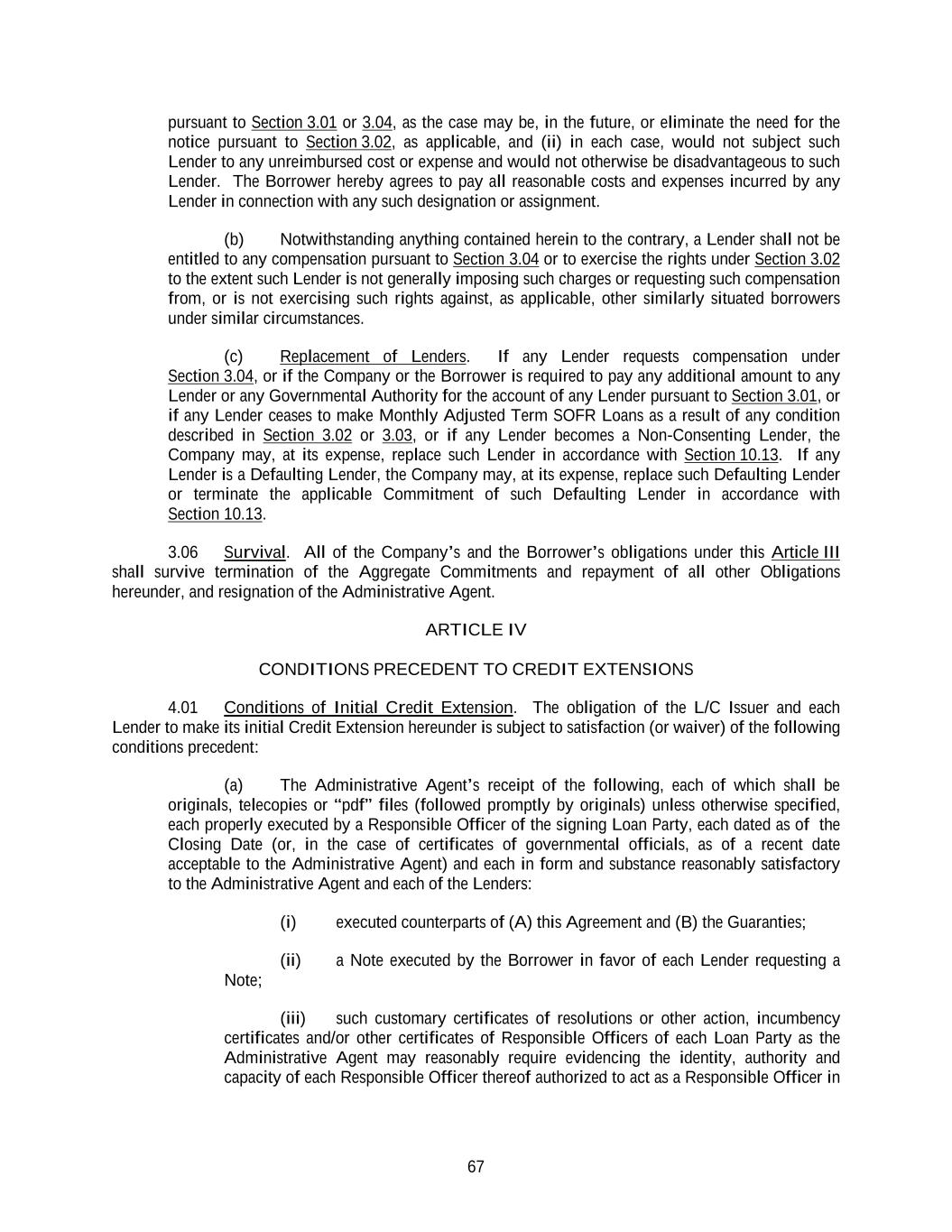 67 pursuant to Section 3.01 or 3.04, as the case may be, in the future, or eliminate the need for the notice pursuant to Section 3.02, as applicable, and (ii) in each case, would not subject such Lender to any unreimbursed cost or expense and would not otherwise be disadvantageous to such Lender. The Borrower hereby agrees to pay all reasonable costs and expenses incurred by any Lender in connection with any such designation or assignment. (b) Notwithstanding anything contained herein to the contrary, a Lender shall not be entitled to any compensation pursuant to Section 3.04 or to exercise the rights under Section 3.02 to the extent such Lender is not generally imposing such charges or requesting such compensation from, or is not exercising such rights against, as applicable, other similarly situated borrowers under similar circumstances. (c) Replacement of Lenders. If any Lender requests compensation under Section 3.04, or if the Company or the Borrower is required to pay any additional amount to any Lender or any Governmental Authority for the account of any Lender pursuant to Section 3.01, or if any Lender ceases to make Monthly Adjusted Term SOFR Loans as a result of any condition described in Section 3.02 or 3.03, or if any Lender becomes a Non-Consenting Lender, the Company may, at its expense, replace such Lender in accordance with Section 10.13. If any Lender is a Defaulting Lender, the Company may, at its expense, replace such Defaulting Lender or terminate the applicable Commitment of such Defaulting Lender in accordance with Section 10.13. 3.06 Survival. All of the Company’s and the Borrower’s obligations under this Article III shall survive termination of the Aggregate Commitments and repayment of all other Obligations hereunder, and resignation of the Administrative Agent. ARTICLE IV CONDITIONS PRECEDENT TO CREDIT EXTENSIONS 4.01 Conditions of Initial Credit Extension. The obligation of the L/C Issuer and each Lender to make its initial Credit Extension hereunder is subject to satisfaction (or waiver) of the following conditions precedent: (a) The Administrative Agent’s receipt of the following, each of which shall be originals, telecopies or “pdf” files (followed promptly by originals) unless otherwise specified, each properly executed by a Responsible Officer of the signing Loan Party, each dated as of the Closing Date (or, in the case of certificates of governmental officials, as of a recent date acceptable to the Administrative Agent) and each in form and substance reasonably satisfactory to the Administrative Agent and each of the Lenders: (i) executed counterparts of (A) this Agreement and (B) the Guaranties; (ii) a Note executed by the Borrower in favor of each Lender requesting a Note; (iii) such customary certificates of resolutions or other action, incumbency certificates and/or other certificates of Responsible Officers of each Loan Party as the Administrative Agent may reasonably require evidencing the identity, authority and capacity of each Responsible Officer thereof authorized to act as a Responsible Officer in