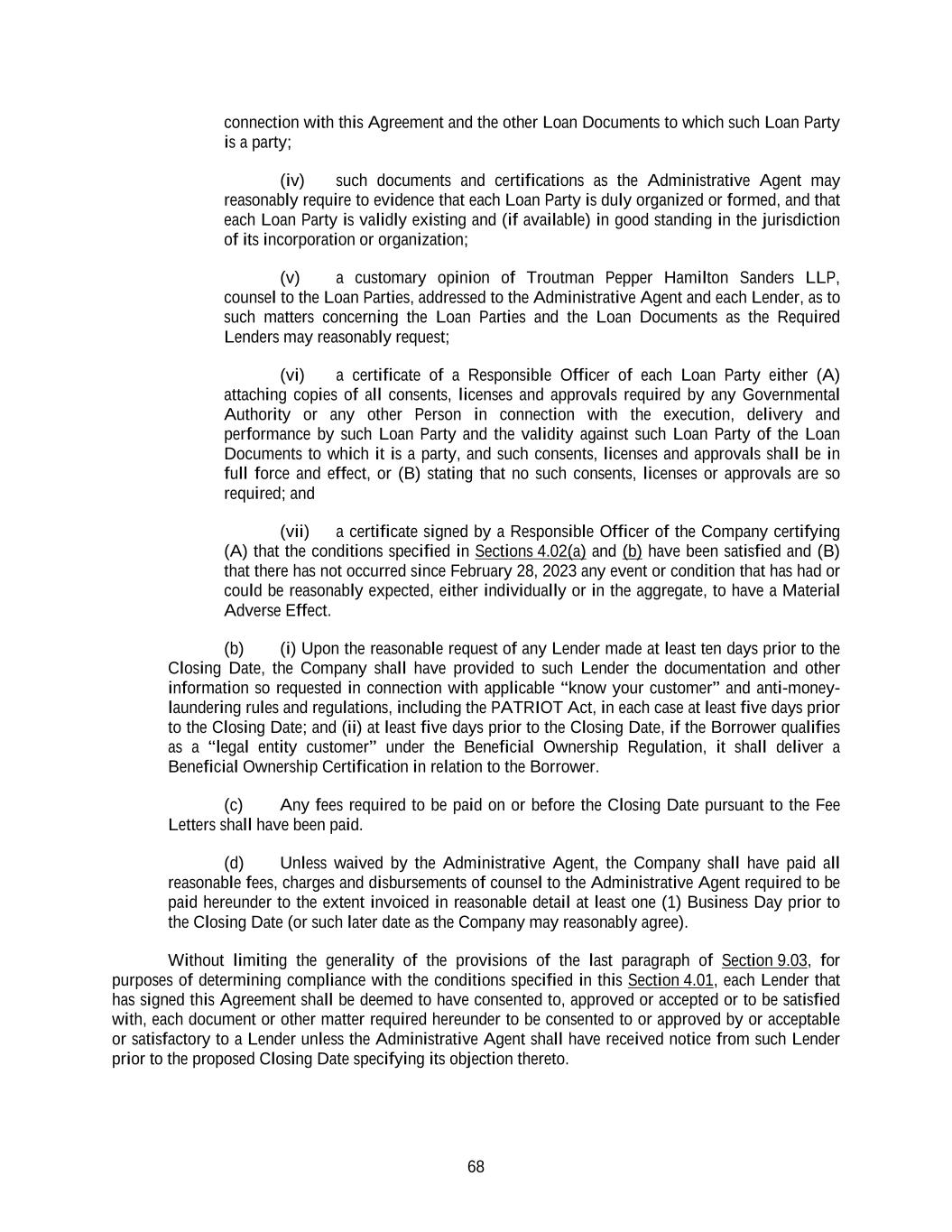 68 connection with this Agreement and the other Loan Documents to which such Loan Party is a party; (iv) such documents and certifications as the Administrative Agent may reasonably require to evidence that each Loan Party is duly organized or formed, and that each Loan Party is validly existing and (if available) in good standing in the jurisdiction of its incorporation or organization; (v) a customary opinion of Troutman Pepper Hamilton Sanders LLP, counsel to the Loan Parties, addressed to the Administrative Agent and each Lender, as to such matters concerning the Loan Parties and the Loan Documents as the Required Lenders may reasonably request; (vi) a certificate of a Responsible Officer of each Loan Party either (A) attaching copies of all consents, licenses and approvals required by any Governmental Authority or any other Person in connection with the execution, delivery and performance by such Loan Party and the validity against such Loan Party of the Loan Documents to which it is a party, and such consents, licenses and approvals shall be in full force and effect, or (B) stating that no such consents, licenses or approvals are so required; and (vii) a certificate signed by a Responsible Officer of the Company certifying (A) that the conditions specified in Sections 4.02(a) and (b) have been satisfied and (B) that there has not occurred since February 28, 2023 any event or condition that has had or could be reasonably expected, either individually or in the aggregate, to have a Material Adverse Effect. (b) (i) Upon the reasonable request of any Lender made at least ten days prior to the Closing Date, the Company shall have provided to such Lender the documentation and other information so requested in connection with applicable “know your customer” and anti-money- laundering rules and regulations, including the PATRIOT Act, in each case at least five days prior to the Closing Date; and (ii) at least five days prior to the Closing Date, if the Borrower qualifies as a “legal entity customer” under the Beneficial Ownership Regulation, it shall deliver a Beneficial Ownership Certification in relation to the Borrower. (c) Any fees required to be paid on or before the Closing Date pursuant to the Fee Letters shall have been paid. (d) Unless waived by the Administrative Agent, the Company shall have paid all reasonable fees, charges and disbursements of counsel to the Administrative Agent required to be paid hereunder to the extent invoiced in reasonable detail at least one (1) Business Day prior to the Closing Date (or such later date as the Company may reasonably agree). Without limiting the generality of the provisions of the last paragraph of Section 9.03, for purposes of determining compliance with the conditions specified in this Section 4.01, each Lender that has signed this Agreement shall be deemed to have consented to, approved or accepted or to be satisfied with, each document or other matter required hereunder to be consented to or approved by or acceptable or satisfactory to a Lender unless the Administrative Agent shall have received notice from such Lender prior to the proposed Closing Date specifying its objection thereto.