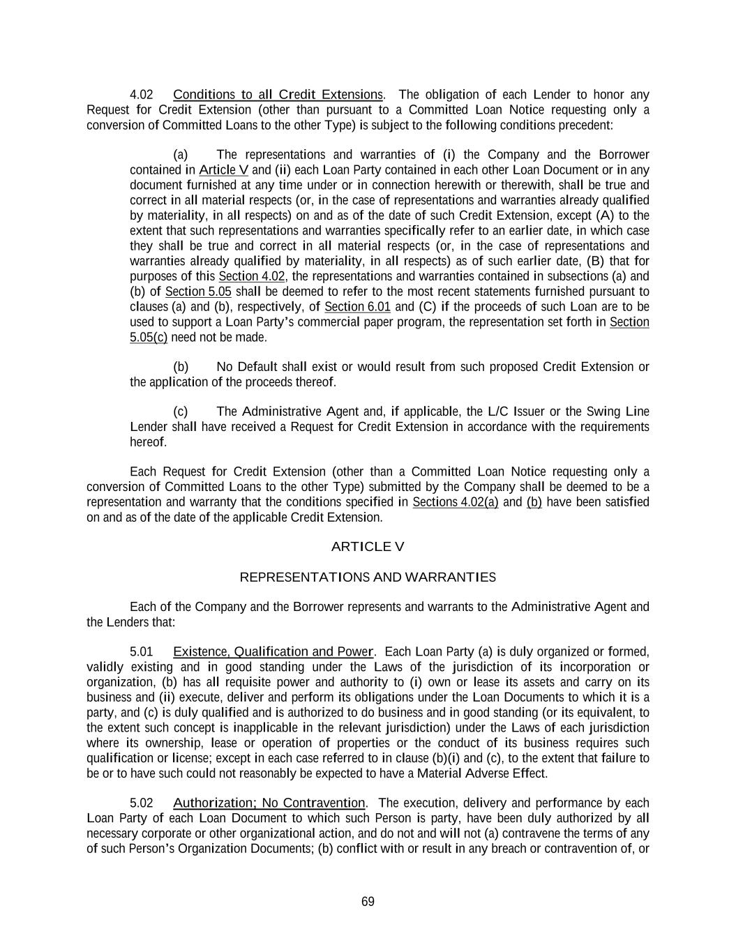 69 4.02 Conditions to all Credit Extensions. The obligation of each Lender to honor any Request for Credit Extension (other than pursuant to a Committed Loan Notice requesting only a conversion of Committed Loans to the other Type) is subject to the following conditions precedent: (a) The representations and warranties of (i) the Company and the Borrower contained in Article V and (ii) each Loan Party contained in each other Loan Document or in any document furnished at any time under or in connection herewith or therewith, shall be true and correct in all material respects (or, in the case of representations and warranties already qualified by materiality, in all respects) on and as of the date of such Credit Extension, except (A) to the extent that such representations and warranties specifically refer to an earlier date, in which case they shall be true and correct in all material respects (or, in the case of representations and warranties already qualified by materiality, in all respects) as of such earlier date, (B) that for purposes of this Section 4.02, the representations and warranties contained in subsections (a) and (b) of Section 5.05 shall be deemed to refer to the most recent statements furnished pursuant to clauses (a) and (b), respectively, of Section 6.01 and (C) if the proceeds of such Loan are to be used to support a Loan Party’s commercial paper program, the representation set forth in Section 5.05(c) need not be made. (b) No Default shall exist or would result from such proposed Credit Extension or the application of the proceeds thereof. (c) The Administrative Agent and, if applicable, the L/C Issuer or the Swing Line Lender shall have received a Request for Credit Extension in accordance with the requirements hereof. Each Request for Credit Extension (other than a Committed Loan Notice requesting only a conversion of Committed Loans to the other Type) submitted by the Company shall be deemed to be a representation and warranty that the conditions specified in Sections 4.02(a) and (b) have been satisfied on and as of the date of the applicable Credit Extension. ARTICLE V REPRESENTATIONS AND WARRANTIES Each of the Company and the Borrower represents and warrants to the Administrative Agent and the Lenders that: 5.01 Existence, Qualification and Power. Each Loan Party (a) is duly organized or formed, validly existing and in good standing under the Laws of the jurisdiction of its incorporation or organization, (b) has all requisite power and authority to (i) own or lease its assets and carry on its business and (ii) execute, deliver and perform its obligations under the Loan Documents to which it is a party, and (c) is duly qualified and is authorized to do business and in good standing (or its equivalent, to the extent such concept is inapplicable in the relevant jurisdiction) under the Laws of each jurisdiction where its ownership, lease or operation of properties or the conduct of its business requires such qualification or license; except in each case referred to in clause (b)(i) and (c), to the extent that failure to be or to have such could not reasonably be expected to have a Material Adverse Effect. 5.02 Authorization; No Contravention. The execution, delivery and performance by each Loan Party of each Loan Document to which such Person is party, have been duly authorized by all necessary corporate or other organizational action, and do not and will not (a) contravene the terms of any of such Person’s Organization Documents; (b) conflict with or result in any breach or contravention of, or