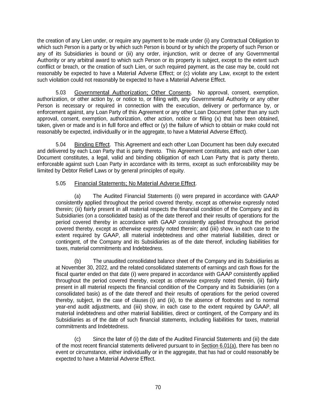 70 the creation of any Lien under, or require any payment to be made under (i) any Contractual Obligation to which such Person is a party or by which such Person is bound or by which the property of such Person or any of its Subsidiaries is bound or (ii) any order, injunction, writ or decree of any Governmental Authority or any arbitral award to which such Person or its property is subject, except to the extent such conflict or breach, or the creation of such Lien, or such required payment, as the case may be, could not reasonably be expected to have a Material Adverse Effect; or (c) violate any Law, except to the extent such violation could not reasonably be expected to have a Material Adverse Effect. 5.03 Governmental Authorization; Other Consents. No approval, consent, exemption, authorization, or other action by, or notice to, or filing with, any Governmental Authority or any other Person is necessary or required in connection with the execution, delivery or performance by, or enforcement against, any Loan Party of this Agreement or any other Loan Document (other than any such approval, consent, exemption, authorization, other action, notice or filing (x) that has been obtained, taken, given or made and is in full force and effect or (y) the failure of which to obtain or make could not reasonably be expected, individually or in the aggregate, to have a Material Adverse Effect). 5.04 Binding Effect. This Agreement and each other Loan Document has been duly executed and delivered by each Loan Party that is party thereto. This Agreement constitutes, and each other Loan Document constitutes, a legal, valid and binding obligation of each Loan Party that is party thereto, enforceable against such Loan Party in accordance with its terms, except as such enforceability may be limited by Debtor Relief Laws or by general principles of equity. 5.05 Financial Statements; No Material Adverse Effect. (a) The Audited Financial Statements (i) were prepared in accordance with GAAP consistently applied throughout the period covered thereby, except as otherwise expressly noted therein; (ii) fairly present in all material respects the financial condition of the Company and its Subsidiaries (on a consolidated basis) as of the date thereof and their results of operations for the period covered thereby in accordance with GAAP consistently applied throughout the period covered thereby, except as otherwise expressly noted therein; and (iii) show, in each case to the extent required by GAAP, all material indebtedness and other material liabilities, direct or contingent, of the Company and its Subsidiaries as of the date thereof, including liabilities for taxes, material commitments and Indebtedness. (b) The unaudited consolidated balance sheet of the Company and its Subsidiaries as at November 30, 2022, and the related consolidated statements of earnings and cash flows for the fiscal quarter ended on that date (i) were prepared in accordance with GAAP consistently applied throughout the period covered thereby, except as otherwise expressly noted therein, (ii) fairly present in all material respects the financial condition of the Company and its Subsidiaries (on a consolidated basis) as of the date thereof and their results of operations for the period covered thereby, subject, in the case of clauses (i) and (ii), to the absence of footnotes and to normal year-end audit adjustments, and (iii) show, in each case to the extent required by GAAP, all material indebtedness and other material liabilities, direct or contingent, of the Company and its Subsidiaries as of the date of such financial statements, including liabilities for taxes, material commitments and Indebtedness. (c) Since the later of (i) the date of the Audited Financial Statements and (ii) the date of the most recent financial statements delivered pursuant to in Section 6.01(a), there has been no event or circumstance, either individually or in the aggregate, that has had or could reasonably be expected to have a Material Adverse Effect.