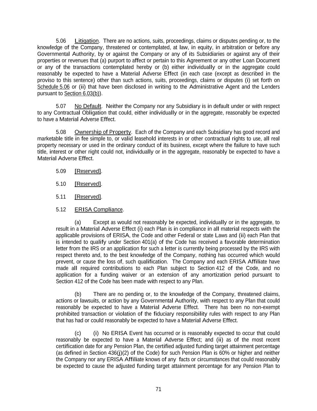 71 5.06 Litigation. There are no actions, suits, proceedings, claims or disputes pending or, to the knowledge of the Company, threatened or contemplated, at law, in equity, in arbitration or before any Governmental Authority, by or against the Company or any of its Subsidiaries or against any of their properties or revenues that (a) purport to affect or pertain to this Agreement or any other Loan Document or any of the transactions contemplated hereby or (b) either individually or in the aggregate could reasonably be expected to have a Material Adverse Effect (in each case (except as described in the proviso to this sentence) other than such actions, suits, proceedings, claims or disputes (i) set forth on Schedule 5.06 or (ii) that have been disclosed in writing to the Administrative Agent and the Lenders pursuant to Section 6.03(b)). 5.07 No Default. Neither the Company nor any Subsidiary is in default under or with respect to any Contractual Obligation that could, either individually or in the aggregate, reasonably be expected to have a Material Adverse Effect. 5.08 Ownership of Property. Each of the Company and each Subsidiary has good record and marketable title in fee simple to, or valid leasehold interests in or other contractual rights to use, all real property necessary or used in the ordinary conduct of its business, except where the failure to have such title, interest or other right could not, individually or in the aggregate, reasonably be expected to have a Material Adverse Effect. 5.09 [Reserved]. 5.10 [Reserved]. 5.11 [Reserved]. 5.12 ERISA Compliance. (a) Except as would not reasonably be expected, individually or in the aggregate, to result in a Material Adverse Effect (i) each Plan is in compliance in all material respects with the applicable provisions of ERISA, the Code and other Federal or state Laws and (ii) each Plan that is intended to qualify under Section 401(a) of the Code has received a favorable determination letter from the IRS or an application for such a letter is currently being processed by the IRS with respect thereto and, to the best knowledge of the Company, nothing has occurred which would prevent, or cause the loss of, such qualification. The Company and each ERISA Affiliate have made all required contributions to each Plan subject to Section 412 of the Code, and no application for a funding waiver or an extension of any amortization period pursuant to Section 412 of the Code has been made with respect to any Plan. (b) There are no pending or, to the knowledge of the Company, threatened claims, actions or lawsuits, or action by any Governmental Authority, with respect to any Plan that could reasonably be expected to have a Material Adverse Effect. There has been no non-exempt prohibited transaction or violation of the fiduciary responsibility rules with respect to any Plan that has had or could reasonably be expected to have a Material Adverse Effect. (c) (i) No ERISA Event has occurred or is reasonably expected to occur that could reasonably be expected to have a Material Adverse Effect; and (ii) as of the most recent certification date for any Pension Plan, the certified adjusted funding target attainment percentage (as defined in Section 436(j)(2) of the Code) for such Pension Plan is 60% or higher and neither the Company nor any ERISA Affiliate knows of any facts or circumstances that could reasonably be expected to cause the adjusted funding target attainment percentage for any Pension Plan to