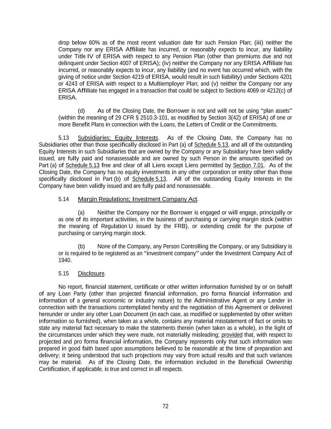 72 drop below 60% as of the most recent valuation date for such Pension Plan; (iii) neither the Company nor any ERISA Affiliate has incurred, or reasonably expects to incur, any liability under Title IV of ERISA with respect to any Pension Plan (other than premiums due and not delinquent under Section 4007 of ERISA); (iv) neither the Company nor any ERISA Affiliate has incurred, or reasonably expects to incur, any liability (and no event has occurred which, with the giving of notice under Section 4219 of ERISA, would result in such liability) under Sections 4201 or 4243 of ERISA with respect to a Multiemployer Plan; and (v) neither the Company nor any ERISA Affiliate has engaged in a transaction that could be subject to Sections 4069 or 4212(c) of ERISA. (d) As of the Closing Date, the Borrower is not and will not be using “plan assets” (within the meaning of 29 CFR § 2510.3-101, as modified by Section 3(42) of ERISA) of one or more Benefit Plans in connection with the Loans, the Letters of Credit or the Commitments. 5.13 Subsidiaries; Equity Interests. As of the Closing Date, the Company has no Subsidiaries other than those specifically disclosed in Part (a) of Schedule 5.13, and all of the outstanding Equity Interests in such Subsidiaries that are owned by the Company or any Subsidiary have been validly issued, are fully paid and nonassessable and are owned by such Person in the amounts specified on Part (a) of Schedule 5.13 free and clear of all Liens except Liens permitted by Section 7.01. As of the Closing Date, the Company has no equity investments in any other corporation or entity other than those specifically disclosed in Part (b) of Schedule 5.13. All of the outstanding Equity Interests in the Company have been validly issued and are fully paid and nonassessable. 5.14 Margin Regulations; Investment Company Act. (a) Neither the Company nor the Borrower is engaged or will engage, principally or as one of its important activities, in the business of purchasing or carrying margin stock (within the meaning of Regulation U issued by the FRB), or extending credit for the purpose of purchasing or carrying margin stock. (b) None of the Company, any Person Controlling the Company, or any Subsidiary is or is required to be registered as an “investment company” under the Investment Company Act of 1940. 5.15 Disclosure. No report, financial statement, certificate or other written information furnished by or on behalf of any Loan Party (other than projected financial information, pro forma financial information and information of a general economic or industry nature) to the Administrative Agent or any Lender in connection with the transactions contemplated hereby and the negotiation of this Agreement or delivered hereunder or under any other Loan Document (in each case, as modified or supplemented by other written information so furnished), when taken as a whole, contains any material misstatement of fact or omits to state any material fact necessary to make the statements therein (when taken as a whole), in the light of the circumstances under which they were made, not materially misleading; provided that, with respect to projected and pro forma financial information, the Company represents only that such information was prepared in good faith based upon assumptions believed to be reasonable at the time of preparation and delivery; it being understood that such projections may vary from actual results and that such variances may be material. As of the Closing Date, the information included in the Beneficial Ownership Certification, if applicable, is true and correct in all respects.