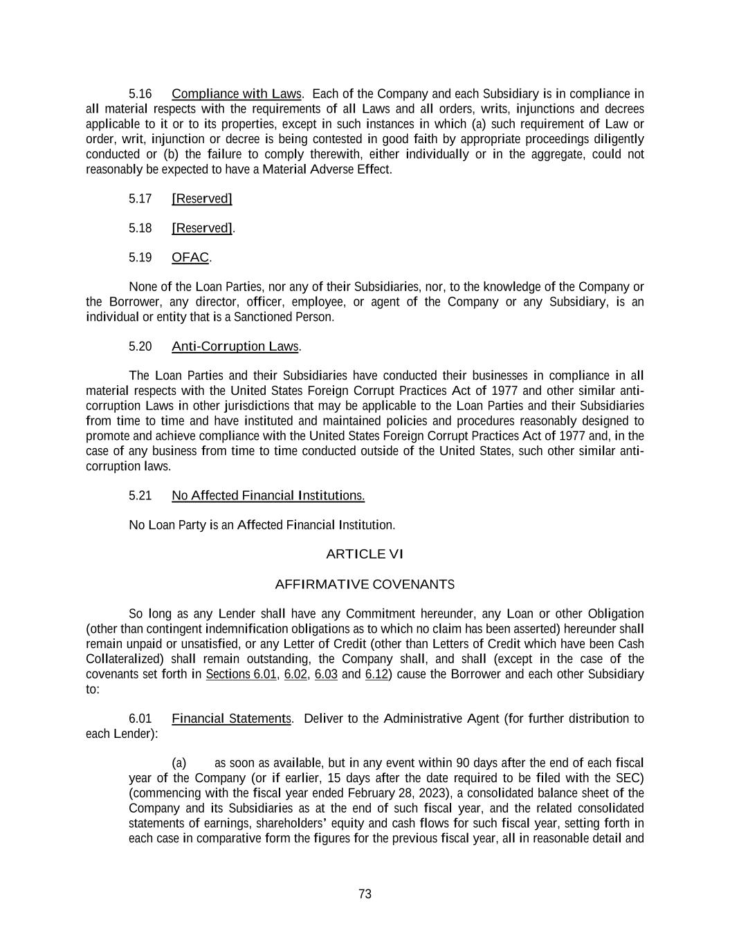 73 5.16 Compliance with Laws. Each of the Company and each Subsidiary is in compliance in all material respects with the requirements of all Laws and all orders, writs, injunctions and decrees applicable to it or to its properties, except in such instances in which (a) such requirement of Law or order, writ, injunction or decree is being contested in good faith by appropriate proceedings diligently conducted or (b) the failure to comply therewith, either individually or in the aggregate, could not reasonably be expected to have a Material Adverse Effect. 5.17 [Reserved] 5.18 [Reserved]. 5.19 OFAC. None of the Loan Parties, nor any of their Subsidiaries, nor, to the knowledge of the Company or the Borrower, any director, officer, employee, or agent of the Company or any Subsidiary, is an individual or entity that is a Sanctioned Person. 5.20 Anti-Corruption Laws. The Loan Parties and their Subsidiaries have conducted their businesses in compliance in all material respects with the United States Foreign Corrupt Practices Act of 1977 and other similar anti- corruption Laws in other jurisdictions that may be applicable to the Loan Parties and their Subsidiaries from time to time and have instituted and maintained policies and procedures reasonably designed to promote and achieve compliance with the United States Foreign Corrupt Practices Act of 1977 and, in the case of any business from time to time conducted outside of the United States, such other similar anti- corruption laws. 5.21 No Affected Financial Institutions. No Loan Party is an Affected Financial Institution. ARTICLE VI AFFIRMATIVE COVENANTS So long as any Lender shall have any Commitment hereunder, any Loan or other Obligation (other than contingent indemnification obligations as to which no claim has been asserted) hereunder shall remain unpaid or unsatisfied, or any Letter of Credit (other than Letters of Credit which have been Cash Collateralized) shall remain outstanding, the Company shall, and shall (except in the case of the covenants set forth in Sections 6.01, 6.02, 6.03 and 6.12) cause the Borrower and each other Subsidiary to: 6.01 Financial Statements. Deliver to the Administrative Agent (for further distribution to each Lender): (a) as soon as available, but in any event within 90 days after the end of each fiscal year of the Company (or if earlier, 15 days after the date required to be filed with the SEC) (commencing with the fiscal year ended February 28, 2023), a consolidated balance sheet of the Company and its Subsidiaries as at the end of such fiscal year, and the related consolidated statements of earnings, shareholders’ equity and cash flows for such fiscal year, setting forth in each case in comparative form the figures for the previous fiscal year, all in reasonable detail and