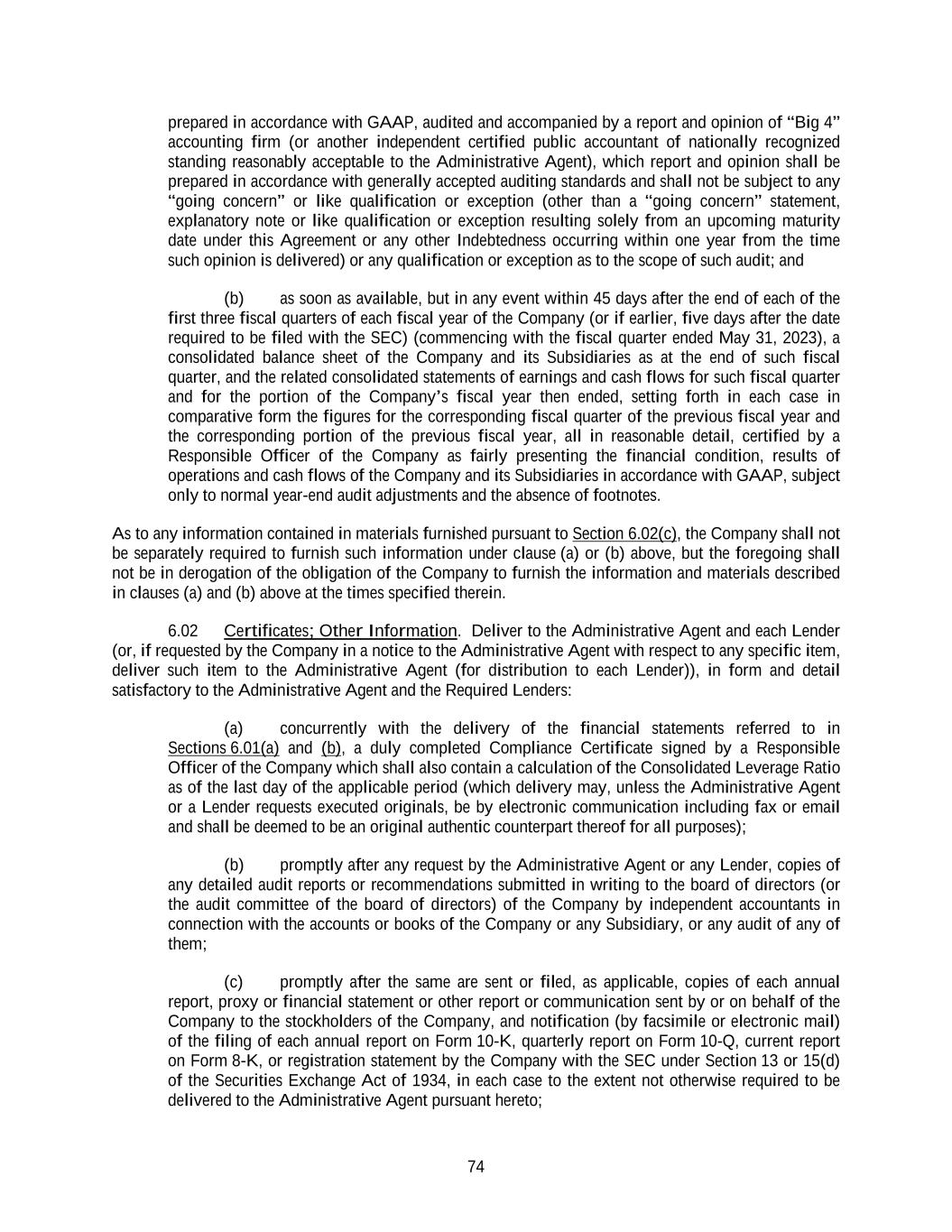 74 prepared in accordance with GAAP, audited and accompanied by a report and opinion of “Big 4” accounting firm (or another independent certified public accountant of nationally recognized standing reasonably acceptable to the Administrative Agent), which report and opinion shall be prepared in accordance with generally accepted auditing standards and shall not be subject to any “going concern” or like qualification or exception (other than a “going concern” statement, explanatory note or like qualification or exception resulting solely from an upcoming maturity date under this Agreement or any other Indebtedness occurring within one year from the time such opinion is delivered) or any qualification or exception as to the scope of such audit; and (b) as soon as available, but in any event within 45 days after the end of each of the first three fiscal quarters of each fiscal year of the Company (or if earlier, five days after the date required to be filed with the SEC) (commencing with the fiscal quarter ended May 31, 2023), a consolidated balance sheet of the Company and its Subsidiaries as at the end of such fiscal quarter, and the related consolidated statements of earnings and cash flows for such fiscal quarter and for the portion of the Company’s fiscal year then ended, setting forth in each case in comparative form the figures for the corresponding fiscal quarter of the previous fiscal year and the corresponding portion of the previous fiscal year, all in reasonable detail, certified by a Responsible Officer of the Company as fairly presenting the financial condition, results of operations and cash flows of the Company and its Subsidiaries in accordance with GAAP, subject only to normal year-end audit adjustments and the absence of footnotes. As to any information contained in materials furnished pursuant to Section 6.02(c), the Company shall not be separately required to furnish such information under clause (a) or (b) above, but the foregoing shall not be in derogation of the obligation of the Company to furnish the information and materials described in clauses (a) and (b) above at the times specified therein. 6.02 Certificates; Other Information. Deliver to the Administrative Agent and each Lender (or, if requested by the Company in a notice to the Administrative Agent with respect to any specific item, deliver such item to the Administrative Agent (for distribution to each Lender)), in form and detail satisfactory to the Administrative Agent and the Required Lenders: (a) concurrently with the delivery of the financial statements referred to in Sections 6.01(a) and (b), a duly completed Compliance Certificate signed by a Responsible Officer of the Company which shall also contain a calculation of the Consolidated Leverage Ratio as of the last day of the applicable period (which delivery may, unless the Administrative Agent or a Lender requests executed originals, be by electronic communication including fax or email and shall be deemed to be an original authentic counterpart thereof for all purposes); (b) promptly after any request by the Administrative Agent or any Lender, copies of any detailed audit reports or recommendations submitted in writing to the board of directors (or the audit committee of the board of directors) of the Company by independent accountants in connection with the accounts or books of the Company or any Subsidiary, or any audit of any of them; (c) promptly after the same are sent or filed, as applicable, copies of each annual report, proxy or financial statement or other report or communication sent by or on behalf of the Company to the stockholders of the Company, and notification (by facsimile or electronic mail) of the filing of each annual report on Form 10-K, quarterly report on Form 10-Q, current report on Form 8-K, or registration statement by the Company with the SEC under Section 13 or 15(d) of the Securities Exchange Act of 1934, in each case to the extent not otherwise required to be delivered to the Administrative Agent pursuant hereto;