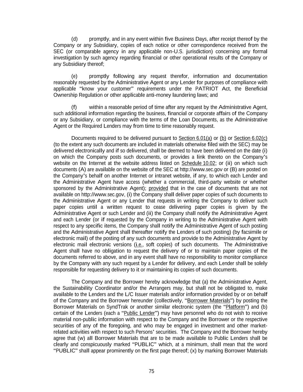 75 (d) promptly, and in any event within five Business Days, after receipt thereof by the Company or any Subsidiary, copies of each notice or other correspondence received from the SEC (or comparable agency in any applicable non-U.S. jurisdiction) concerning any formal investigation by such agency regarding financial or other operational results of the Company or any Subsidiary thereof; (e) promptly following any request therefor, information and documentation reasonably requested by the Administrative Agent or any Lender for purposes of compliance with applicable “know your customer” requirements under the PATRIOT Act, the Beneficial Ownership Regulation or other applicable anti-money laundering laws; and (f) within a reasonable period of time after any request by the Administrative Agent, such additional information regarding the business, financial or corporate affairs of the Company or any Subsidiary, or compliance with the terms of the Loan Documents, as the Administrative Agent or the Required Lenders may from time to time reasonably request. Documents required to be delivered pursuant to Section 6.01(a) or (b) or Section 6.02(c) (to the extent any such documents are included in materials otherwise filed with the SEC) may be delivered electronically and if so delivered, shall be deemed to have been delivered on the date (i) on which the Company posts such documents, or provides a link thereto on the Company’s website on the Internet at the website address listed on Schedule 10.02; or (ii) on which such documents (A) are available on the website of the SEC at http://www.sec.gov or (B) are posted on the Company’s behalf on another Internet or intranet website, if any, to which each Lender and the Administrative Agent have access (whether a commercial, third-party website or whether sponsored by the Administrative Agent); provided that in the case of documents that are not available on http://www.sec.gov, (i) the Company shall deliver paper copies of such documents to the Administrative Agent or any Lender that requests in writing the Company to deliver such paper copies until a written request to cease delivering paper copies is given by the Administrative Agent or such Lender and (ii) the Company shall notify the Administrative Agent and each Lender (or if requested by the Company in writing to the Administrative Agent with respect to any specific items, the Company shall notify the Administrative Agent of such posting and the Administrative Agent shall thereafter notify the Lenders of such posting) (by facsimile or electronic mail) of the posting of any such documents and provide to the Administrative Agent by electronic mail electronic versions (i.e., soft copies) of such documents. The Administrative Agent shall have no obligation to request the delivery of or to maintain paper copies of the documents referred to above, and in any event shall have no responsibility to monitor compliance by the Company with any such request by a Lender for delivery, and each Lender shall be solely responsible for requesting delivery to it or maintaining its copies of such documents. The Company and the Borrower hereby acknowledge that (a) the Administrative Agent, the Sustainability Coordinator and/or the Arrangers may, but shall not be obligated to, make available to the Lenders and the L/C Issuer materials and/or information provided by or on behalf of the Company and the Borrower hereunder (collectively, “Borrower Materials”) by posting the Borrower Materials on SyndTrak or another similar electronic system (the “Platform”) and (b) certain of the Lenders (each a “Public Lender”) may have personnel who do not wish to receive material non-public information with respect to the Company and the Borrower or the respective securities of any of the foregoing, and who may be engaged in investment and other market- related activities with respect to such Persons’ securities. The Company and the Borrower hereby agree that (w) all Borrower Materials that are to be made available to Public Lenders shall be clearly and conspicuously marked “PUBLIC” which, at a minimum, shall mean that the word “PUBLIC” shall appear prominently on the first page thereof; (x) by marking Borrower Materials