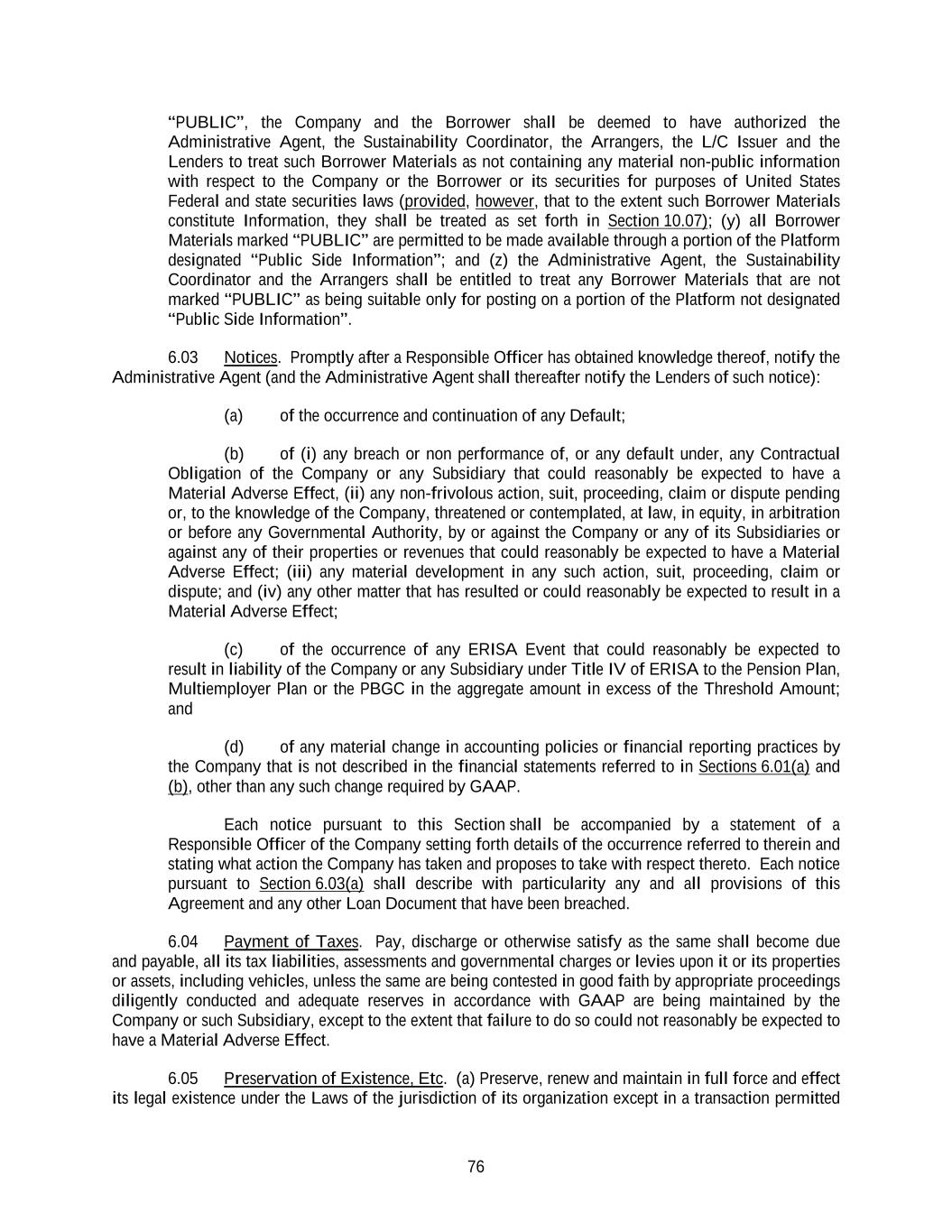 76 “PUBLIC”, the Company and the Borrower shall be deemed to have authorized the Administrative Agent, the Sustainability Coordinator, the Arrangers, the L/C Issuer and the Lenders to treat such Borrower Materials as not containing any material non-public information with respect to the Company or the Borrower or its securities for purposes of United States Federal and state securities laws (provided, however, that to the extent such Borrower Materials constitute Information, they shall be treated as set forth in Section 10.07); (y) all Borrower Materials marked “PUBLIC” are permitted to be made available through a portion of the Platform designated “Public Side Information”; and (z) the Administrative Agent, the Sustainability Coordinator and the Arrangers shall be entitled to treat any Borrower Materials that are not marked “PUBLIC” as being suitable only for posting on a portion of the Platform not designated “Public Side Information”. 6.03 Notices. Promptly after a Responsible Officer has obtained knowledge thereof, notify the Administrative Agent (and the Administrative Agent shall thereafter notify the Lenders of such notice): (a) of the occurrence and continuation of any Default; (b) of (i) any breach or non performance of, or any default under, any Contractual Obligation of the Company or any Subsidiary that could reasonably be expected to have a Material Adverse Effect, (ii) any non-frivolous action, suit, proceeding, claim or dispute pending or, to the knowledge of the Company, threatened or contemplated, at law, in equity, in arbitration or before any Governmental Authority, by or against the Company or any of its Subsidiaries or against any of their properties or revenues that could reasonably be expected to have a Material Adverse Effect; (iii) any material development in any such action, suit, proceeding, claim or dispute; and (iv) any other matter that has resulted or could reasonably be expected to result in a Material Adverse Effect; (c) of the occurrence of any ERISA Event that could reasonably be expected to result in liability of the Company or any Subsidiary under Title IV of ERISA to the Pension Plan, Multiemployer Plan or the PBGC in the aggregate amount in excess of the Threshold Amount; and (d) of any material change in accounting policies or financial reporting practices by the Company that is not described in the financial statements referred to in Sections 6.01(a) and (b), other than any such change required by GAAP. Each notice pursuant to this Section shall be accompanied by a statement of a Responsible Officer of the Company setting forth details of the occurrence referred to therein and stating what action the Company has taken and proposes to take with respect thereto. Each notice pursuant to Section 6.03(a) shall describe with particularity any and all provisions of this Agreement and any other Loan Document that have been breached. 6.04 Payment of Taxes. Pay, discharge or otherwise satisfy as the same shall become due and payable, all its tax liabilities, assessments and governmental charges or levies upon it or its properties or assets, including vehicles, unless the same are being contested in good faith by appropriate proceedings diligently conducted and adequate reserves in accordance with GAAP are being maintained by the Company or such Subsidiary, except to the extent that failure to do so could not reasonably be expected to have a Material Adverse Effect. 6.05 Preservation of Existence, Etc. (a) Preserve, renew and maintain in full force and effect its legal existence under the Laws of the jurisdiction of its organization except in a transaction permitted