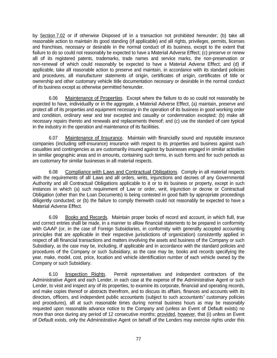 77 by Section 7.02 or if otherwise Disposed of in a transaction not prohibited hereunder; (b) take all reasonable action to maintain its good standing (if applicable) and all rights, privileges, permits, licenses and franchises, necessary or desirable in the normal conduct of its business, except to the extent that failure to do so could not reasonably be expected to have a Material Adverse Effect; (c) preserve or renew all of its registered patents, trademarks, trade names and service marks, the non-preservation or non-renewal of which could reasonably be expected to have a Material Adverse Effect; and (d) if applicable, take all reasonable action to preserve and maintain, in accordance with its standard policies and procedures, all manufacturer statements of origin, certificates of origin, certificates of title or ownership and other customary vehicle title documentation necessary or desirable in the normal conduct of its business except as otherwise permitted hereunder. 6.06 Maintenance of Properties. Except where the failure to do so could not reasonably be expected to have, individually or in the aggregate, a Material Adverse Effect, (a) maintain, preserve and protect all of its properties and equipment necessary in the operation of its business in good working order and condition, ordinary wear and tear excepted and casualty or condemnation excepted; (b) make all necessary repairs thereto and renewals and replacements thereof; and (c) use the standard of care typical in the industry in the operation and maintenance of its facilities. 6.07 Maintenance of Insurance. Maintain with financially sound and reputable insurance companies (including self-insurance) insurance with respect to its properties and business against such casualties and contingencies as are customarily insured against by businesses engaged in similar activities in similar geographic areas and in amounts, containing such terms, in such forms and for such periods as are customary for similar businesses in all material respects. 6.08 Compliance with Laws and Contractual Obligations. Comply in all material respects with the requirements of all Laws and all orders, writs, injunctions and decrees of any Governmental Authority and all Contractual Obligations applicable to it or to its business or property, except in such instances in which (a) such requirement of Law or order, writ, injunction or decree or Contractual Obligation (other than the Loan Documents) is being contested in good faith by appropriate proceedings diligently conducted; or (b) the failure to comply therewith could not reasonably be expected to have a Material Adverse Effect. 6.09 Books and Records. Maintain proper books of record and account, in which full, true and correct entries shall be made, in a manner to allow financial statements to be prepared in conformity with GAAP (or, in the case of Foreign Subsidiaries, in conformity with generally accepted accounting principles that are applicable in their respective jurisdictions of organization) consistently applied in respect of all financial transactions and matters involving the assets and business of the Company or such Subsidiary, as the case may be, including, if applicable and in accordance with the standard policies and procedures of the Company or such Subsidiary, as the case may be, books and records specifying the year, make, model, cost, price, location and vehicle identification number of each vehicle owned by the Company or such Subsidiary. 6.10 Inspection Rights. Permit representatives and independent contractors of the Administrative Agent and each Lender, in each case at the expense of the Administrative Agent or such Lender, to visit and inspect any of its properties, to examine its corporate, financial and operating records, and make copies thereof or abstracts therefrom, and to discuss its affairs, finances and accounts with its directors, officers, and independent public accountants (subject to such accountants’ customary policies and procedures), all at such reasonable times during normal business hours as may be reasonably requested upon reasonable advance notice to the Company and (unless an Event of Default exists) no more than once during any period of 12 consecutive months; provided, however, that (i) unless an Event of Default exists, only the Administrative Agent on behalf of the Lenders may exercise rights under this