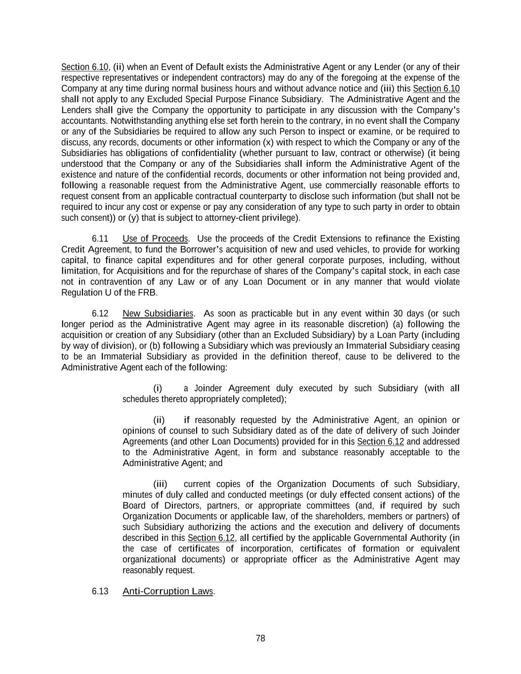 78 Section 6.10, (ii) when an Event of Default exists the Administrative Agent or any Lender (or any of their respective representatives or independent contractors) may do any of the foregoing at the expense of the Company at any time during normal business hours and without advance notice and (iii) this Section 6.10 shall not apply to any Excluded Special Purpose Finance Subsidiary. The Administrative Agent and the Lenders shall give the Company the opportunity to participate in any discussion with the Company’s accountants. Notwithstanding anything else set forth herein to the contrary, in no event shall the Company or any of the Subsidiaries be required to allow any such Person to inspect or examine, or be required to discuss, any records, documents or other information (x) with respect to which the Company or any of the Subsidiaries has obligations of confidentiality (whether pursuant to law, contract or otherwise) (it being understood that the Company or any of the Subsidiaries shall inform the Administrative Agent of the existence and nature of the confidential records, documents or other information not being provided and, following a reasonable request from the Administrative Agent, use commercially reasonable efforts to request consent from an applicable contractual counterparty to disclose such information (but shall not be required to incur any cost or expense or pay any consideration of any type to such party in order to obtain such consent)) or (y) that is subject to attorney-client privilege). 6.11 Use of Proceeds. Use the proceeds of the Credit Extensions to refinance the Existing Credit Agreement, to fund the Borrower’s acquisition of new and used vehicles, to provide for working capital, to finance capital expenditures and for other general corporate purposes, including, without limitation, for Acquisitions and for the repurchase of shares of the Company’s capital stock, in each case not in contravention of any Law or of any Loan Document or in any manner that would violate Regulation U of the FRB. 6.12 New Subsidiaries. As soon as practicable but in any event within 30 days (or such longer period as the Administrative Agent may agree in its reasonable discretion) (a) following the acquisition or creation of any Subsidiary (other than an Excluded Subsidiary) by a Loan Party (including by way of division), or (b) following a Subsidiary which was previously an Immaterial Subsidiary ceasing to be an Immaterial Subsidiary as provided in the definition thereof, cause to be delivered to the Administrative Agent each of the following: (i) a Joinder Agreement duly executed by such Subsidiary (with all schedules thereto appropriately completed); (ii) if reasonably requested by the Administrative Agent, an opinion or opinions of counsel to such Subsidiary dated as of the date of delivery of such Joinder Agreements (and other Loan Documents) provided for in this Section 6.12 and addressed to the Administrative Agent, in form and substance reasonably acceptable to the Administrative Agent; and (iii) current copies of the Organization Documents of such Subsidiary, minutes of duly called and conducted meetings (or duly effected consent actions) of the Board of Directors, partners, or appropriate committees (and, if required by such Organization Documents or applicable law, of the shareholders, members or partners) of such Subsidiary authorizing the actions and the execution and delivery of documents described in this Section 6.12, all certified by the applicable Governmental Authority (in the case of certificates of incorporation, certificates of formation or equivalent organizational documents) or appropriate officer as the Administrative Agent may reasonably request. 6.13 Anti-Corruption Laws.