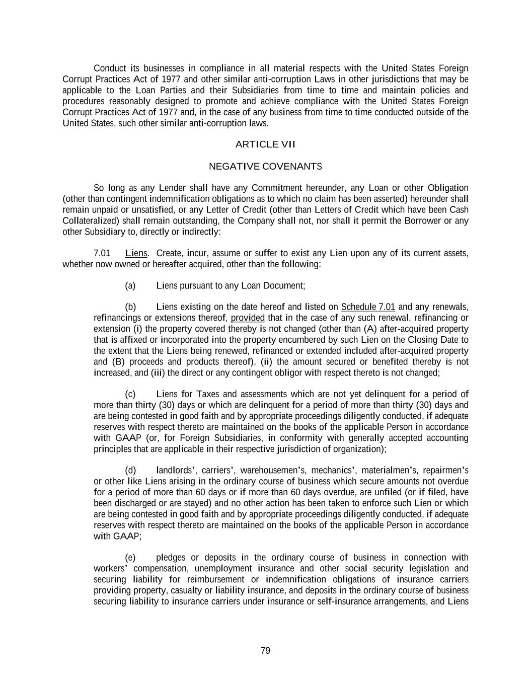 79 Conduct its businesses in compliance in all material respects with the United States Foreign Corrupt Practices Act of 1977 and other similar anti-corruption Laws in other jurisdictions that may be applicable to the Loan Parties and their Subsidiaries from time to time and maintain policies and procedures reasonably designed to promote and achieve compliance with the United States Foreign Corrupt Practices Act of 1977 and, in the case of any business from time to time conducted outside of the United States, such other similar anti-corruption laws. ARTICLE VII NEGATIVE COVENANTS So long as any Lender shall have any Commitment hereunder, any Loan or other Obligation (other than contingent indemnification obligations as to which no claim has been asserted) hereunder shall remain unpaid or unsatisfied, or any Letter of Credit (other than Letters of Credit which have been Cash Collateralized) shall remain outstanding, the Company shall not, nor shall it permit the Borrower or any other Subsidiary to, directly or indirectly: 7.01 Liens. Create, incur, assume or suffer to exist any Lien upon any of its current assets, whether now owned or hereafter acquired, other than the following: (a) Liens pursuant to any Loan Document; (b) Liens existing on the date hereof and listed on Schedule 7.01 and any renewals, refinancings or extensions thereof, provided that in the case of any such renewal, refinancing or extension (i) the property covered thereby is not changed (other than (A) after-acquired property that is affixed or incorporated into the property encumbered by such Lien on the Closing Date to the extent that the Liens being renewed, refinanced or extended included after-acquired property and (B) proceeds and products thereof), (ii) the amount secured or benefited thereby is not increased, and (iii) the direct or any contingent obligor with respect thereto is not changed; (c) Liens for Taxes and assessments which are not yet delinquent for a period of more than thirty (30) days or which are delinquent for a period of more than thirty (30) days and are being contested in good faith and by appropriate proceedings diligently conducted, if adequate reserves with respect thereto are maintained on the books of the applicable Person in accordance with GAAP (or, for Foreign Subsidiaries, in conformity with generally accepted accounting principles that are applicable in their respective jurisdiction of organization); (d) landlords’, carriers’, warehousemen’s, mechanics’, materialmen’s, repairmen’s or other like Liens arising in the ordinary course of business which secure amounts not overdue for a period of more than 60 days or if more than 60 days overdue, are unfiled (or if filed, have been discharged or are stayed) and no other action has been taken to enforce such Lien or which are being contested in good faith and by appropriate proceedings diligently conducted, if adequate reserves with respect thereto are maintained on the books of the applicable Person in accordance with GAAP; (e) pledges or deposits in the ordinary course of business in connection with workers’ compensation, unemployment insurance and other social security legislation and securing liability for reimbursement or indemnification obligations of insurance carriers providing property, casualty or liability insurance, and deposits in the ordinary course of business securing liability to insurance carriers under insurance or self-insurance arrangements, and Liens