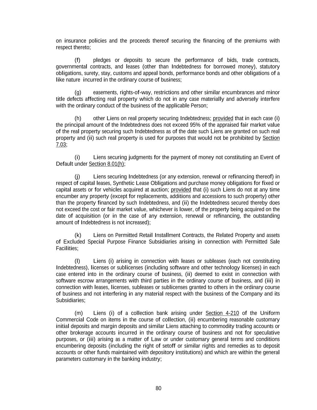 80 on insurance policies and the proceeds thereof securing the financing of the premiums with respect thereto; (f) pledges or deposits to secure the performance of bids, trade contracts, governmental contracts, and leases (other than Indebtedness for borrowed money), statutory obligations, surety, stay, customs and appeal bonds, performance bonds and other obligations of a like nature incurred in the ordinary course of business; (g) easements, rights-of-way, restrictions and other similar encumbrances and minor title defects affecting real property which do not in any case materially and adversely interfere with the ordinary conduct of the business of the applicable Person; (h) other Liens on real property securing Indebtedness; provided that in each case (i) the principal amount of the Indebtedness does not exceed 95% of the appraised fair market value of the real property securing such Indebtedness as of the date such Liens are granted on such real property and (ii) such real property is used for purposes that would not be prohibited by Section 7.03; (i) Liens securing judgments for the payment of money not constituting an Event of Default under Section 8.01(h); (j) Liens securing Indebtedness (or any extension, renewal or refinancing thereof) in respect of capital leases, Synthetic Lease Obligations and purchase money obligations for fixed or capital assets or for vehicles acquired at auction; provided that (i) such Liens do not at any time encumber any property (except for replacements, additions and accessions to such property) other than the property financed by such Indebtedness, and (ii) the Indebtedness secured thereby does not exceed the cost or fair market value, whichever is lower, of the property being acquired on the date of acquisition (or in the case of any extension, renewal or refinancing, the outstanding amount of Indebtedness is not increased); (k) Liens on Permitted Retail Installment Contracts, the Related Property and assets of Excluded Special Purpose Finance Subsidiaries arising in connection with Permitted Sale Facilities; (l) Liens (i) arising in connection with leases or subleases (each not constituting Indebtedness), licenses or sublicenses (including software and other technology licenses) in each case entered into in the ordinary course of business, (ii) deemed to exist in connection with software escrow arrangements with third parties in the ordinary course of business, and (iii) in connection with leases, licenses, subleases or sublicenses granted to others in the ordinary course of business and not interfering in any material respect with the business of the Company and its Subsidiaries; (m) Liens (i) of a collection bank arising under Section 4-210 of the Uniform Commercial Code on items in the course of collection, (ii) encumbering reasonable customary initial deposits and margin deposits and similar Liens attaching to commodity trading accounts or other brokerage accounts incurred in the ordinary course of business and not for speculative purposes, or (iii) arising as a matter of Law or under customary general terms and conditions encumbering deposits (including the right of setoff or similar rights and remedies as to deposit accounts or other funds maintained with depository institutions) and which are within the general parameters customary in the banking industry;