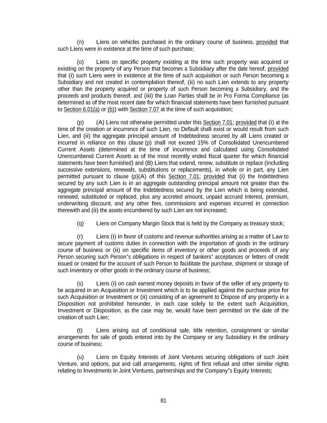 81 (n) Liens on vehicles purchased in the ordinary course of business, provided that such Liens were in existence at the time of such purchase; (o) Liens on specific property existing at the time such property was acquired or existing on the property of any Person that becomes a Subsidiary after the date hereof, provided that (i) such Liens were in existence at the time of such acquisition or such Person becoming a Subsidiary and not created in contemplation thereof, (ii) no such Lien extends to any property other than the property acquired or property of such Person becoming a Subsidiary, and the proceeds and products thereof, and (iii) the Loan Parties shall be in Pro Forma Compliance (as determined as of the most recent date for which financial statements have been furnished pursuant to Section 6.01(a) or (b)) with Section 7.07 at the time of such acquisition; (p) (A) Liens not otherwise permitted under this Section 7.01; provided that (i) at the time of the creation or incurrence of such Lien, no Default shall exist or would result from such Lien, and (ii) the aggregate principal amount of Indebtedness secured by all Liens created or incurred in reliance on this clause (p) shall not exceed 15% of Consolidated Unencumbered Current Assets (determined at the time of incurrence and calculated using Consolidated Unencumbered Current Assets as of the most recently ended fiscal quarter for which financial statements have been furnished) and (B) Liens that extend, renew, substitute or replace (including successive extensions, renewals, substitutions or replacements), in whole or in part, any Lien permitted pursuant to clause (p)(A) of this Section 7.01; provided that (i) the Indebtedness secured by any such Lien is in an aggregate outstanding principal amount not greater than the aggregate principal amount of the Indebtedness secured by the Lien which is being extended, renewed, substituted or replaced, plus any accreted amount, unpaid accrued interest, premium, underwriting discount, and any other fees, commissions and expenses incurred in connection therewith and (ii) the assets encumbered by such Lien are not increased; (q) Liens on Company Margin Stock that is held by the Company as treasury stock; (r) Liens (i) in favor of customs and revenue authorities arising as a matter of Law to secure payment of customs duties in connection with the importation of goods in the ordinary course of business or (ii) on specific items of inventory or other goods and proceeds of any Person securing such Person’s obligations in respect of bankers’ acceptances or letters of credit issued or created for the account of such Person to facilitate the purchase, shipment or storage of such inventory or other goods in the ordinary course of business; (s) Liens (i) on cash earnest money deposits in favor of the seller of any property to be acquired in an Acquisition or Investment which is to be applied against the purchase price for such Acquisition or Investment or (ii) consisting of an agreement to Dispose of any property in a Disposition not prohibited hereunder, in each case solely to the extent such Acquisition, Investment or Disposition, as the case may be, would have been permitted on the date of the creation of such Lien; (t) Liens arising out of conditional sale, title retention, consignment or similar arrangements for sale of goods entered into by the Company or any Subsidiary in the ordinary course of business; (u) Liens on Equity Interests of Joint Ventures securing obligations of such Joint Venture, and options, put and call arrangements, rights of first refusal and other similar rights relating to Investments in Joint Ventures, partnerships and the Company’s Equity Interests;