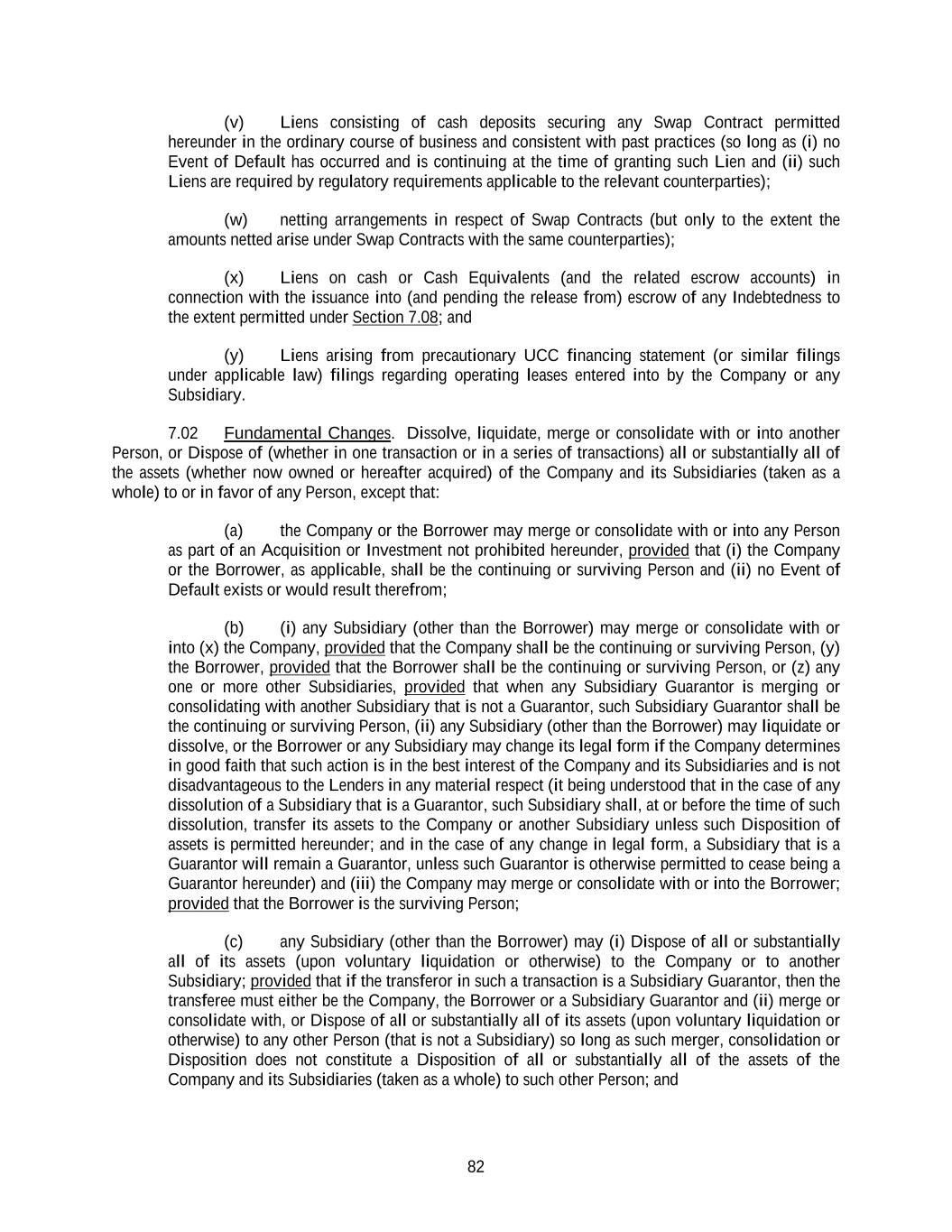 82 (v) Liens consisting of cash deposits securing any Swap Contract permitted hereunder in the ordinary course of business and consistent with past practices (so long as (i) no Event of Default has occurred and is continuing at the time of granting such Lien and (ii) such Liens are required by regulatory requirements applicable to the relevant counterparties); (w) netting arrangements in respect of Swap Contracts (but only to the extent the amounts netted arise under Swap Contracts with the same counterparties); (x) Liens on cash or Cash Equivalents (and the related escrow accounts) in connection with the issuance into (and pending the release from) escrow of any Indebtedness to the extent permitted under Section 7.08; and (y) Liens arising from precautionary UCC financing statement (or similar filings under applicable law) filings regarding operating leases entered into by the Company or any Subsidiary. 7.02 Fundamental Changes. Dissolve, liquidate, merge or consolidate with or into another Person, or Dispose of (whether in one transaction or in a series of transactions) all or substantially all of the assets (whether now owned or hereafter acquired) of the Company and its Subsidiaries (taken as a whole) to or in favor of any Person, except that: (a) the Company or the Borrower may merge or consolidate with or into any Person as part of an Acquisition or Investment not prohibited hereunder, provided that (i) the Company or the Borrower, as applicable, shall be the continuing or surviving Person and (ii) no Event of Default exists or would result therefrom; (b) (i) any Subsidiary (other than the Borrower) may merge or consolidate with or into (x) the Company, provided that the Company shall be the continuing or surviving Person, (y) the Borrower, provided that the Borrower shall be the continuing or surviving Person, or (z) any one or more other Subsidiaries, provided that when any Subsidiary Guarantor is merging or consolidating with another Subsidiary that is not a Guarantor, such Subsidiary Guarantor shall be the continuing or surviving Person, (ii) any Subsidiary (other than the Borrower) may liquidate or dissolve, or the Borrower or any Subsidiary may change its legal form if the Company determines in good faith that such action is in the best interest of the Company and its Subsidiaries and is not disadvantageous to the Lenders in any material respect (it being understood that in the case of any dissolution of a Subsidiary that is a Guarantor, such Subsidiary shall, at or before the time of such dissolution, transfer its assets to the Company or another Subsidiary unless such Disposition of assets is permitted hereunder; and in the case of any change in legal form, a Subsidiary that is a Guarantor will remain a Guarantor, unless such Guarantor is otherwise permitted to cease being a Guarantor hereunder) and (iii) the Company may merge or consolidate with or into the Borrower; provided that the Borrower is the surviving Person; (c) any Subsidiary (other than the Borrower) may (i) Dispose of all or substantially all of its assets (upon voluntary liquidation or otherwise) to the Company or to another Subsidiary; provided that if the transferor in such a transaction is a Subsidiary Guarantor, then the transferee must either be the Company, the Borrower or a Subsidiary Guarantor and (ii) merge or consolidate with, or Dispose of all or substantially all of its assets (upon voluntary liquidation or otherwise) to any other Person (that is not a Subsidiary) so long as such merger, consolidation or Disposition does not constitute a Disposition of all or substantially all of the assets of the Company and its Subsidiaries (taken as a whole) to such other Person; and