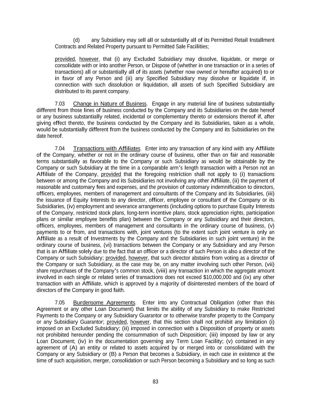 83 (d) any Subsidiary may sell all or substantially all of its Permitted Retail Installment Contracts and Related Property pursuant to Permitted Sale Facilities; provided, however, that (i) any Excluded Subsidiary may dissolve, liquidate, or merge or consolidate with or into another Person, or Dispose of (whether in one transaction or in a series of transactions) all or substantially all of its assets (whether now owned or hereafter acquired) to or in favor of any Person and (ii) any Specified Subsidiary may dissolve or liquidate if, in connection with such dissolution or liquidation, all assets of such Specified Subsidiary are distributed to its parent company. 7.03 Change in Nature of Business. Engage in any material line of business substantially different from those lines of business conducted by the Company and its Subsidiaries on the date hereof or any business substantially related, incidental or complementary thereto or extensions thereof if, after giving effect thereto, the business conducted by the Company and its Subsidiaries, taken as a whole, would be substantially different from the business conducted by the Company and its Subsidiaries on the date hereof. 7.04 Transactions with Affiliates. Enter into any transaction of any kind with any Affiliate of the Company, whether or not in the ordinary course of business, other than on fair and reasonable terms substantially as favorable to the Company or such Subsidiary as would be obtainable by the Company or such Subsidiary at the time in a comparable arm’s length transaction with a Person not an Affiliate of the Company, provided that the foregoing restriction shall not apply to (i) transactions between or among the Company and its Subsidiaries not involving any other Affiliate, (ii) the payment of reasonable and customary fees and expenses, and the provision of customary indemnification to directors, officers, employees, members of management and consultants of the Company and its Subsidiaries, (iii) the issuance of Equity Interests to any director, officer, employee or consultant of the Company or its Subsidiaries, (iv) employment and severance arrangements (including options to purchase Equity Interests of the Company, restricted stock plans, long-term incentive plans, stock appreciation rights, participation plans or similar employee benefits plan) between the Company or any Subsidiary and their directors, officers, employees, members of management and consultants in the ordinary course of business, (v) payments to or from, and transactions with, joint ventures (to the extent such joint venture is only an Affiliate as a result of Investments by the Company and the Subsidiaries in such joint venture) in the ordinary course of business, (vi) transactions between the Company or any Subsidiary and any Person that is an Affiliate solely due to the fact that an officer or a director of such Person is also a director of the Company or such Subsidiary; provided, however, that such director abstains from voting as a director of the Company or such Subsidiary, as the case may be, on any matter involving such other Person, (vii) share repurchases of the Company’s common stock, (viii) any transaction in which the aggregate amount involved in each single or related series of transactions does not exceed $10,000,000 and (ix) any other transaction with an Affiliate, which is approved by a majority of disinterested members of the board of directors of the Company in good faith. 7.05 Burdensome Agreements. Enter into any Contractual Obligation (other than this Agreement or any other Loan Document) that limits the ability of any Subsidiary to make Restricted Payments to the Company or any Subsidiary Guarantor or to otherwise transfer property to the Company or any Subsidiary Guarantor; provided, however, that this section shall not prohibit any limitation (i) imposed on an Excluded Subsidiary; (ii) imposed in connection with a Disposition of property or assets not prohibited hereunder pending the consummation of such Disposition; (iii) imposed by law or any Loan Document; (iv) in the documentation governing any Term Loan Facility; (v) contained in any agreement of (A) an entity or related to assets acquired by or merged into or consolidated with the Company or any Subsidiary or (B) a Person that becomes a Subsidiary, in each case in existence at the time of such acquisition, merger, consolidation or such Person becoming a Subsidiary and so long as such