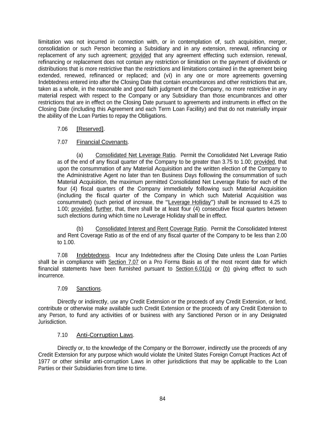 84 limitation was not incurred in connection with, or in contemplation of, such acquisition, merger, consolidation or such Person becoming a Subsidiary and in any extension, renewal, refinancing or replacement of any such agreement; provided that any agreement effecting such extension, renewal, refinancing or replacement does not contain any restriction or limitation on the payment of dividends or distributions that is more restrictive than the restrictions and limitations contained in the agreement being extended, renewed, refinanced or replaced; and (vi) in any one or more agreements governing Indebtedness entered into after the Closing Date that contain encumbrances and other restrictions that are, taken as a whole, in the reasonable and good faith judgment of the Company, no more restrictive in any material respect with respect to the Company or any Subsidiary than those encumbrances and other restrictions that are in effect on the Closing Date pursuant to agreements and instruments in effect on the Closing Date (including this Agreement and each Term Loan Facility) and that do not materially impair the ability of the Loan Parties to repay the Obligations. 7.06 [Reserved]. 7.07 Financial Covenants. (a) Consolidated Net Leverage Ratio. Permit the Consolidated Net Leverage Ratio as of the end of any fiscal quarter of the Company to be greater than 3.75 to 1.00; provided, that upon the consummation of any Material Acquisition and the written election of the Company to the Administrative Agent no later than ten Business Days following the consummation of such Material Acquisition, the maximum permitted Consolidated Net Leverage Ratio for each of the four (4) fiscal quarters of the Company immediately following such Material Acquisition (including the fiscal quarter of the Company in which such Material Acquisition was consummated) (such period of increase, the “Leverage Holiday”) shall be increased to 4.25 to 1.00; provided, further, that, there shall be at least four (4) consecutive fiscal quarters between such elections during which time no Leverage Holiday shall be in effect. (b) Consolidated Interest and Rent Coverage Ratio. Permit the Consolidated Interest and Rent Coverage Ratio as of the end of any fiscal quarter of the Company to be less than 2.00 to 1.00. 7.08 Indebtedness. Incur any Indebtedness after the Closing Date unless the Loan Parties shall be in compliance with Section 7.07 on a Pro Forma Basis as of the most recent date for which financial statements have been furnished pursuant to Section 6.01(a) or (b) giving effect to such incurrence. 7.09 Sanctions. Directly or indirectly, use any Credit Extension or the proceeds of any Credit Extension, or lend, contribute or otherwise make available such Credit Extension or the proceeds of any Credit Extension to any Person, to fund any activities of or business with any Sanctioned Person or in any Designated Jurisdiction. 7.10 Anti-Corruption Laws. Directly or, to the knowledge of the Company or the Borrower, indirectly use the proceeds of any Credit Extension for any purpose which would violate the United States Foreign Corrupt Practices Act of 1977 or other similar anti-corruption Laws in other jurisdictions that may be applicable to the Loan Parties or their Subsidiaries from time to time.