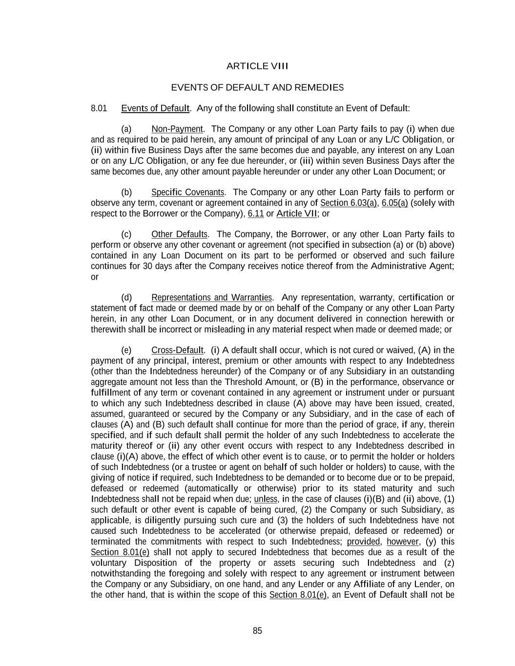 85 ARTICLE VIII EVENTS OF DEFAULT AND REMEDIES 8.01 Events of Default. Any of the following shall constitute an Event of Default: (a) Non-Payment. The Company or any other Loan Party fails to pay (i) when due and as required to be paid herein, any amount of principal of any Loan or any L/C Obligation, or (ii) within five Business Days after the same becomes due and payable, any interest on any Loan or on any L/C Obligation, or any fee due hereunder, or (iii) within seven Business Days after the same becomes due, any other amount payable hereunder or under any other Loan Document; or (b) Specific Covenants. The Company or any other Loan Party fails to perform or observe any term, covenant or agreement contained in any of Section 6.03(a), 6.05(a) (solely with respect to the Borrower or the Company), 6.11 or Article VII; or (c) Other Defaults. The Company, the Borrower, or any other Loan Party fails to perform or observe any other covenant or agreement (not specified in subsection (a) or (b) above) contained in any Loan Document on its part to be performed or observed and such failure continues for 30 days after the Company receives notice thereof from the Administrative Agent; or (d) Representations and Warranties. Any representation, warranty, certification or statement of fact made or deemed made by or on behalf of the Company or any other Loan Party herein, in any other Loan Document, or in any document delivered in connection herewith or therewith shall be incorrect or misleading in any material respect when made or deemed made; or (e) Cross-Default. (i) A default shall occur, which is not cured or waived, (A) in the payment of any principal, interest, premium or other amounts with respect to any Indebtedness (other than the Indebtedness hereunder) of the Company or of any Subsidiary in an outstanding aggregate amount not less than the Threshold Amount, or (B) in the performance, observance or fulfillment of any term or covenant contained in any agreement or instrument under or pursuant to which any such Indebtedness described in clause (A) above may have been issued, created, assumed, guaranteed or secured by the Company or any Subsidiary, and in the case of each of clauses (A) and (B) such default shall continue for more than the period of grace, if any, therein specified, and if such default shall permit the holder of any such Indebtedness to accelerate the maturity thereof or (ii) any other event occurs with respect to any Indebtedness described in clause (i)(A) above, the effect of which other event is to cause, or to permit the holder or holders of such Indebtedness (or a trustee or agent on behalf of such holder or holders) to cause, with the giving of notice if required, such Indebtedness to be demanded or to become due or to be prepaid, defeased or redeemed (automatically or otherwise) prior to its stated maturity and such Indebtedness shall not be repaid when due; unless, in the case of clauses (i)(B) and (ii) above, (1) such default or other event is capable of being cured, (2) the Company or such Subsidiary, as applicable, is diligently pursuing such cure and (3) the holders of such Indebtedness have not caused such Indebtedness to be accelerated (or otherwise prepaid, defeased or redeemed) or terminated the commitments with respect to such Indebtedness; provided, however, (y) this Section 8.01(e) shall not apply to secured Indebtedness that becomes due as a result of the voluntary Disposition of the property or assets securing such Indebtedness and (z) notwithstanding the foregoing and solely with respect to any agreement or instrument between the Company or any Subsidiary, on one hand, and any Lender or any Affiliate of any Lender, on the other hand, that is within the scope of this Section 8.01(e), an Event of Default shall not be