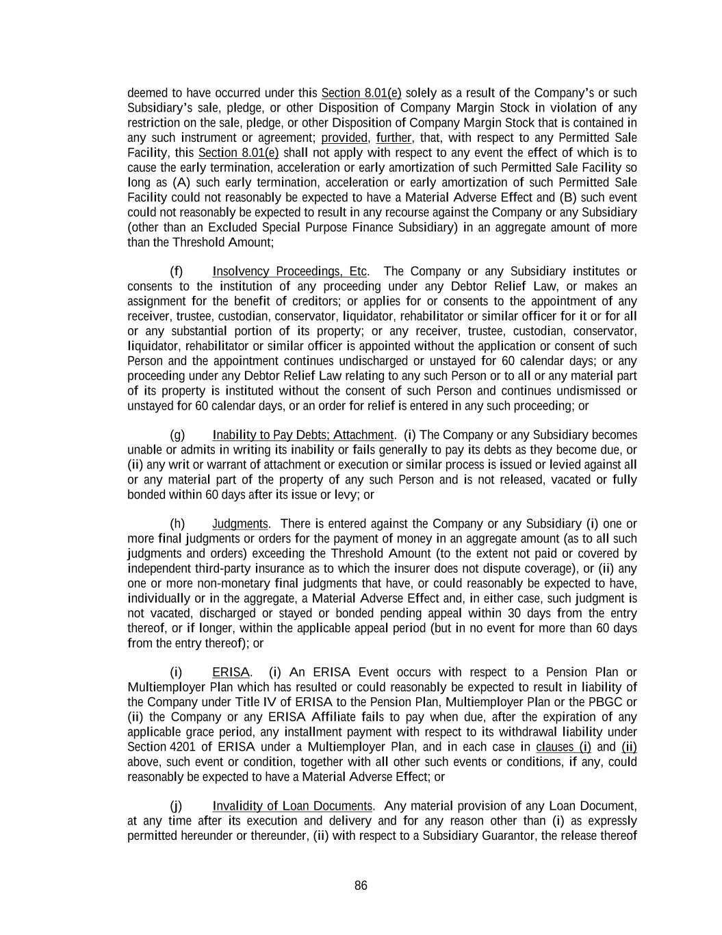 86 deemed to have occurred under this Section 8.01(e) solely as a result of the Company’s or such Subsidiary’s sale, pledge, or other Disposition of Company Margin Stock in violation of any restriction on the sale, pledge, or other Disposition of Company Margin Stock that is contained in any such instrument or agreement; provided, further, that, with respect to any Permitted Sale Facility, this Section 8.01(e) shall not apply with respect to any event the effect of which is to cause the early termination, acceleration or early amortization of such Permitted Sale Facility so long as (A) such early termination, acceleration or early amortization of such Permitted Sale Facility could not reasonably be expected to have a Material Adverse Effect and (B) such event could not reasonably be expected to result in any recourse against the Company or any Subsidiary (other than an Excluded Special Purpose Finance Subsidiary) in an aggregate amount of more than the Threshold Amount; (f) Insolvency Proceedings, Etc. The Company or any Subsidiary institutes or consents to the institution of any proceeding under any Debtor Relief Law, or makes an assignment for the benefit of creditors; or applies for or consents to the appointment of any receiver, trustee, custodian, conservator, liquidator, rehabilitator or similar officer for it or for all or any substantial portion of its property; or any receiver, trustee, custodian, conservator, liquidator, rehabilitator or similar officer is appointed without the application or consent of such Person and the appointment continues undischarged or unstayed for 60 calendar days; or any proceeding under any Debtor Relief Law relating to any such Person or to all or any material part of its property is instituted without the consent of such Person and continues undismissed or unstayed for 60 calendar days, or an order for relief is entered in any such proceeding; or (g) Inability to Pay Debts; Attachment. (i) The Company or any Subsidiary becomes unable or admits in writing its inability or fails generally to pay its debts as they become due, or (ii) any writ or warrant of attachment or execution or similar process is issued or levied against all or any material part of the property of any such Person and is not released, vacated or fully bonded within 60 days after its issue or levy; or (h) Judgments. There is entered against the Company or any Subsidiary (i) one or more final judgments or orders for the payment of money in an aggregate amount (as to all such judgments and orders) exceeding the Threshold Amount (to the extent not paid or covered by independent third-party insurance as to which the insurer does not dispute coverage), or (ii) any one or more non-monetary final judgments that have, or could reasonably be expected to have, individually or in the aggregate, a Material Adverse Effect and, in either case, such judgment is not vacated, discharged or stayed or bonded pending appeal within 30 days from the entry thereof, or if longer, within the applicable appeal period (but in no event for more than 60 days from the entry thereof); or (i) ERISA. (i) An ERISA Event occurs with respect to a Pension Plan or Multiemployer Plan which has resulted or could reasonably be expected to result in liability of the Company under Title IV of ERISA to the Pension Plan, Multiemployer Plan or the PBGC or (ii) the Company or any ERISA Affiliate fails to pay when due, after the expiration of any applicable grace period, any installment payment with respect to its withdrawal liability under Section 4201 of ERISA under a Multiemployer Plan, and in each case in clauses (i) and (ii) above, such event or condition, together with all other such events or conditions, if any, could reasonably be expected to have a Material Adverse Effect; or (j) Invalidity of Loan Documents. Any material provision of any Loan Document, at any time after its execution and delivery and for any reason other than (i) as expressly permitted hereunder or thereunder, (ii) with respect to a Subsidiary Guarantor, the release thereof