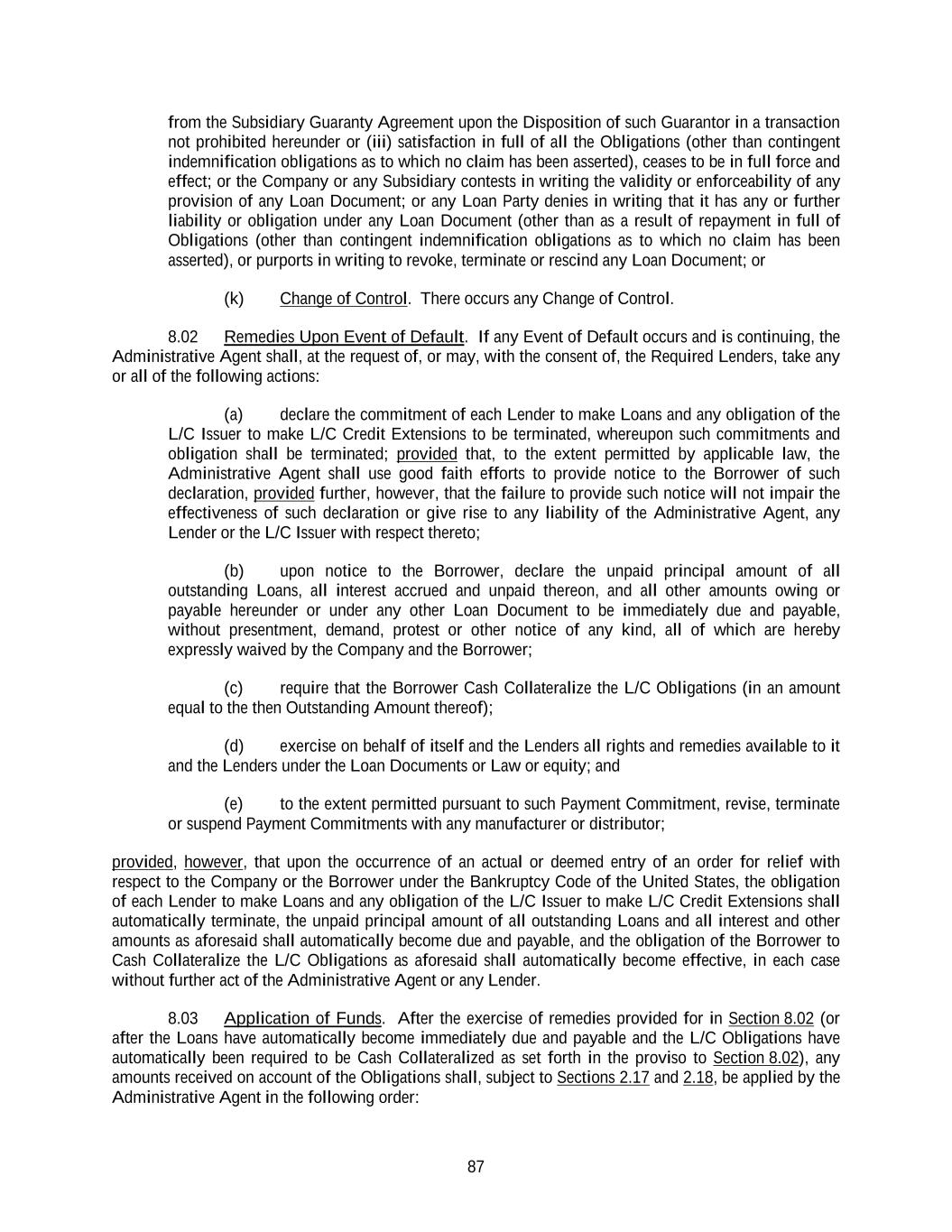 87 from the Subsidiary Guaranty Agreement upon the Disposition of such Guarantor in a transaction not prohibited hereunder or (iii) satisfaction in full of all the Obligations (other than contingent indemnification obligations as to which no claim has been asserted), ceases to be in full force and effect; or the Company or any Subsidiary contests in writing the validity or enforceability of any provision of any Loan Document; or any Loan Party denies in writing that it has any or further liability or obligation under any Loan Document (other than as a result of repayment in full of Obligations (other than contingent indemnification obligations as to which no claim has been asserted), or purports in writing to revoke, terminate or rescind any Loan Document; or (k) Change of Control. There occurs any Change of Control. 8.02 Remedies Upon Event of Default. If any Event of Default occurs and is continuing, the Administrative Agent shall, at the request of, or may, with the consent of, the Required Lenders, take any or all of the following actions: (a) declare the commitment of each Lender to make Loans and any obligation of the L/C Issuer to make L/C Credit Extensions to be terminated, whereupon such commitments and obligation shall be terminated; provided that, to the extent permitted by applicable law, the Administrative Agent shall use good faith efforts to provide notice to the Borrower of such declaration, provided further, however, that the failure to provide such notice will not impair the effectiveness of such declaration or give rise to any liability of the Administrative Agent, any Lender or the L/C Issuer with respect thereto; (b) upon notice to the Borrower, declare the unpaid principal amount of all outstanding Loans, all interest accrued and unpaid thereon, and all other amounts owing or payable hereunder or under any other Loan Document to be immediately due and payable, without presentment, demand, protest or other notice of any kind, all of which are hereby expressly waived by the Company and the Borrower; (c) require that the Borrower Cash Collateralize the L/C Obligations (in an amount equal to the then Outstanding Amount thereof); (d) exercise on behalf of itself and the Lenders all rights and remedies available to it and the Lenders under the Loan Documents or Law or equity; and (e) to the extent permitted pursuant to such Payment Commitment, revise, terminate or suspend Payment Commitments with any manufacturer or distributor; provided, however, that upon the occurrence of an actual or deemed entry of an order for relief with respect to the Company or the Borrower under the Bankruptcy Code of the United States, the obligation of each Lender to make Loans and any obligation of the L/C Issuer to make L/C Credit Extensions shall automatically terminate, the unpaid principal amount of all outstanding Loans and all interest and other amounts as aforesaid shall automatically become due and payable, and the obligation of the Borrower to Cash Collateralize the L/C Obligations as aforesaid shall automatically become effective, in each case without further act of the Administrative Agent or any Lender. 8.03 Application of Funds. After the exercise of remedies provided for in Section 8.02 (or after the Loans have automatically become immediately due and payable and the L/C Obligations have automatically been required to be Cash Collateralized as set forth in the proviso to Section 8.02), any amounts received on account of the Obligations shall, subject to Sections 2.17 and 2.18, be applied by the Administrative Agent in the following order: