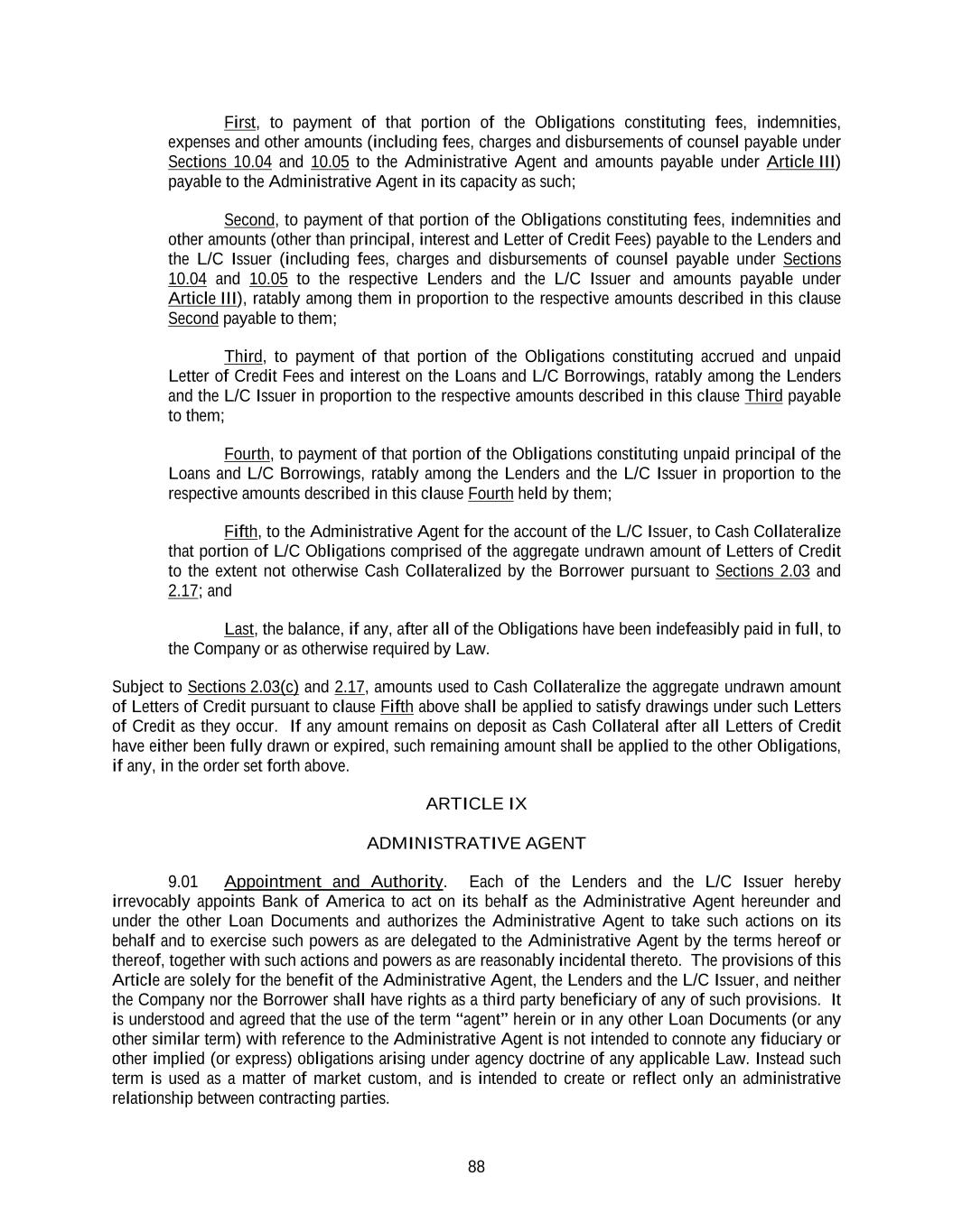 88 First, to payment of that portion of the Obligations constituting fees, indemnities, expenses and other amounts (including fees, charges and disbursements of counsel payable under Sections 10.04 and 10.05 to the Administrative Agent and amounts payable under Article III) payable to the Administrative Agent in its capacity as such; Second, to payment of that portion of the Obligations constituting fees, indemnities and other amounts (other than principal, interest and Letter of Credit Fees) payable to the Lenders and the L/C Issuer (including fees, charges and disbursements of counsel payable under Sections 10.04 and 10.05 to the respective Lenders and the L/C Issuer and amounts payable under Article III), ratably among them in proportion to the respective amounts described in this clause Second payable to them; Third, to payment of that portion of the Obligations constituting accrued and unpaid Letter of Credit Fees and interest on the Loans and L/C Borrowings, ratably among the Lenders and the L/C Issuer in proportion to the respective amounts described in this clause Third payable to them; Fourth, to payment of that portion of the Obligations constituting unpaid principal of the Loans and L/C Borrowings, ratably among the Lenders and the L/C Issuer in proportion to the respective amounts described in this clause Fourth held by them; Fifth, to the Administrative Agent for the account of the L/C Issuer, to Cash Collateralize that portion of L/C Obligations comprised of the aggregate undrawn amount of Letters of Credit to the extent not otherwise Cash Collateralized by the Borrower pursuant to Sections 2.03 and 2.17; and Last, the balance, if any, after all of the Obligations have been indefeasibly paid in full, to the Company or as otherwise required by Law. Subject to Sections 2.03(c) and 2.17, amounts used to Cash Collateralize the aggregate undrawn amount of Letters of Credit pursuant to clause Fifth above shall be applied to satisfy drawings under such Letters of Credit as they occur. If any amount remains on deposit as Cash Collateral after all Letters of Credit have either been fully drawn or expired, such remaining amount shall be applied to the other Obligations, if any, in the order set forth above. ARTICLE IX ADMINISTRATIVE AGENT 9.01 Appointment and Authority. Each of the Lenders and the L/C Issuer hereby irrevocably appoints Bank of America to act on its behalf as the Administrative Agent hereunder and under the other Loan Documents and authorizes the Administrative Agent to take such actions on its behalf and to exercise such powers as are delegated to the Administrative Agent by the terms hereof or thereof, together with such actions and powers as are reasonably incidental thereto. The provisions of this Article are solely for the benefit of the Administrative Agent, the Lenders and the L/C Issuer, and neither the Company nor the Borrower shall have rights as a third party beneficiary of any of such provisions. It is understood and agreed that the use of the term “agent” herein or in any other Loan Documents (or any other similar term) with reference to the Administrative Agent is not intended to connote any fiduciary or other implied (or express) obligations arising under agency doctrine of any applicable Law. Instead such term is used as a matter of market custom, and is intended to create or reflect only an administrative relationship between contracting parties.