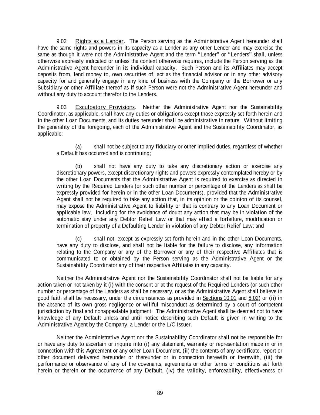 89 9.02 Rights as a Lender. The Person serving as the Administrative Agent hereunder shall have the same rights and powers in its capacity as a Lender as any other Lender and may exercise the same as though it were not the Administrative Agent and the term “Lender” or “Lenders” shall, unless otherwise expressly indicated or unless the context otherwise requires, include the Person serving as the Administrative Agent hereunder in its individual capacity. Such Person and its Affiliates may accept deposits from, lend money to, own securities of, act as the financial advisor or in any other advisory capacity for and generally engage in any kind of business with the Company or the Borrower or any Subsidiary or other Affiliate thereof as if such Person were not the Administrative Agent hereunder and without any duty to account therefor to the Lenders. 9.03 Exculpatory Provisions. Neither the Administrative Agent nor the Sustainability Coordinator, as applicable, shall have any duties or obligations except those expressly set forth herein and in the other Loan Documents, and its duties hereunder shall be administrative in nature. Without limiting the generality of the foregoing, each of the Administrative Agent and the Sustainability Coordinator, as applicable: (a) shall not be subject to any fiduciary or other implied duties, regardless of whether a Default has occurred and is continuing; (b) shall not have any duty to take any discretionary action or exercise any discretionary powers, except discretionary rights and powers expressly contemplated hereby or by the other Loan Documents that the Administrative Agent is required to exercise as directed in writing by the Required Lenders (or such other number or percentage of the Lenders as shall be expressly provided for herein or in the other Loan Documents), provided that the Administrative Agent shall not be required to take any action that, in its opinion or the opinion of its counsel, may expose the Administrative Agent to liability or that is contrary to any Loan Document or applicable law, including for the avoidance of doubt any action that may be in violation of the automatic stay under any Debtor Relief Law or that may effect a forfeiture, modification or termination of property of a Defaulting Lender in violation of any Debtor Relief Law; and (c) shall not, except as expressly set forth herein and in the other Loan Documents, have any duty to disclose, and shall not be liable for the failure to disclose, any information relating to the Company or any of the Borrower or any of their respective Affiliates that is communicated to or obtained by the Person serving as the Administrative Agent or the Sustainability Coordinator any of their respective Affiliates in any capacity. Neither the Administrative Agent nor the Sustainability Coordinator shall not be liable for any action taken or not taken by it (i) with the consent or at the request of the Required Lenders (or such other number or percentage of the Lenders as shall be necessary, or as the Administrative Agent shall believe in good faith shall be necessary, under the circumstances as provided in Sections 10.01 and 8.02) or (ii) in the absence of its own gross negligence or willful misconduct as determined by a court of competent jurisdiction by final and nonappealable judgment. The Administrative Agent shall be deemed not to have knowledge of any Default unless and until notice describing such Default is given in writing to the Administrative Agent by the Company, a Lender or the L/C Issuer. Neither the Administrative Agent nor the Sustainability Coordinator shall not be responsible for or have any duty to ascertain or inquire into (i) any statement, warranty or representation made in or in connection with this Agreement or any other Loan Document, (ii) the contents of any certificate, report or other document delivered hereunder or thereunder or in connection herewith or therewith, (iii) the performance or observance of any of the covenants, agreements or other terms or conditions set forth herein or therein or the occurrence of any Default, (iv) the validity, enforceability, effectiveness or