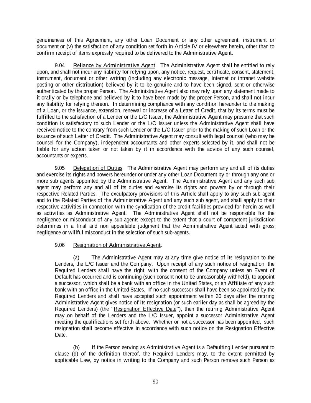 90 genuineness of this Agreement, any other Loan Document or any other agreement, instrument or document or (v) the satisfaction of any condition set forth in Article IV or elsewhere herein, other than to confirm receipt of items expressly required to be delivered to the Administrative Agent. 9.04 Reliance by Administrative Agent. The Administrative Agent shall be entitled to rely upon, and shall not incur any liability for relying upon, any notice, request, certificate, consent, statement, instrument, document or other writing (including any electronic message, Internet or intranet website posting or other distribution) believed by it to be genuine and to have been signed, sent or otherwise authenticated by the proper Person. The Administrative Agent also may rely upon any statement made to it orally or by telephone and believed by it to have been made by the proper Person, and shall not incur any liability for relying thereon. In determining compliance with any condition hereunder to the making of a Loan, or the issuance, extension, renewal or increase of a Letter of Credit, that by its terms must be fulfilled to the satisfaction of a Lender or the L/C Issuer, the Administrative Agent may presume that such condition is satisfactory to such Lender or the L/C Issuer unless the Administrative Agent shall have received notice to the contrary from such Lender or the L/C Issuer prior to the making of such Loan or the issuance of such Letter of Credit. The Administrative Agent may consult with legal counsel (who may be counsel for the Company), independent accountants and other experts selected by it, and shall not be liable for any action taken or not taken by it in accordance with the advice of any such counsel, accountants or experts. 9.05 Delegation of Duties. The Administrative Agent may perform any and all of its duties and exercise its rights and powers hereunder or under any other Loan Document by or through any one or more sub agents appointed by the Administrative Agent. The Administrative Agent and any such sub agent may perform any and all of its duties and exercise its rights and powers by or through their respective Related Parties. The exculpatory provisions of this Article shall apply to any such sub agent and to the Related Parties of the Administrative Agent and any such sub agent, and shall apply to their respective activities in connection with the syndication of the credit facilities provided for herein as well as activities as Administrative Agent. The Administrative Agent shall not be responsible for the negligence or misconduct of any sub-agents except to the extent that a court of competent jurisdiction determines in a final and non appealable judgment that the Administrative Agent acted with gross negligence or willful misconduct in the selection of such sub-agents. 9.06 Resignation of Administrative Agent. (a) The Administrative Agent may at any time give notice of its resignation to the Lenders, the L/C Issuer and the Company. Upon receipt of any such notice of resignation, the Required Lenders shall have the right, with the consent of the Company unless an Event of Default has occurred and is continuing (such consent not to be unreasonably withheld), to appoint a successor, which shall be a bank with an office in the United States, or an Affiliate of any such bank with an office in the United States. If no such successor shall have been so appointed by the Required Lenders and shall have accepted such appointment within 30 days after the retiring Administrative Agent gives notice of its resignation (or such earlier day as shall be agreed by the Required Lenders) (the “Resignation Effective Date”), then the retiring Administrative Agent may on behalf of the Lenders and the L/C Issuer, appoint a successor Administrative Agent meeting the qualifications set forth above. Whether or not a successor has been appointed, such resignation shall become effective in accordance with such notice on the Resignation Effective Date. (b) If the Person serving as Administrative Agent is a Defaulting Lender pursuant to clause (d) of the definition thereof, the Required Lenders may, to the extent permitted by applicable Law, by notice in writing to the Company and such Person remove such Person as