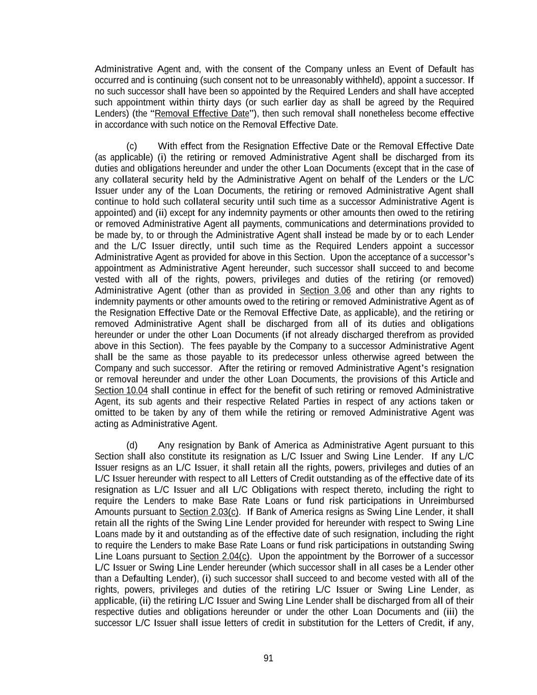 91 Administrative Agent and, with the consent of the Company unless an Event of Default has occurred and is continuing (such consent not to be unreasonably withheld), appoint a successor. If no such successor shall have been so appointed by the Required Lenders and shall have accepted such appointment within thirty days (or such earlier day as shall be agreed by the Required Lenders) (the “Removal Effective Date”), then such removal shall nonetheless become effective in accordance with such notice on the Removal Effective Date. (c) With effect from the Resignation Effective Date or the Removal Effective Date (as applicable) (i) the retiring or removed Administrative Agent shall be discharged from its duties and obligations hereunder and under the other Loan Documents (except that in the case of any collateral security held by the Administrative Agent on behalf of the Lenders or the L/C Issuer under any of the Loan Documents, the retiring or removed Administrative Agent shall continue to hold such collateral security until such time as a successor Administrative Agent is appointed) and (ii) except for any indemnity payments or other amounts then owed to the retiring or removed Administrative Agent all payments, communications and determinations provided to be made by, to or through the Administrative Agent shall instead be made by or to each Lender and the L/C Issuer directly, until such time as the Required Lenders appoint a successor Administrative Agent as provided for above in this Section. Upon the acceptance of a successor’s appointment as Administrative Agent hereunder, such successor shall succeed to and become vested with all of the rights, powers, privileges and duties of the retiring (or removed) Administrative Agent (other than as provided in Section 3.06 and other than any rights to indemnity payments or other amounts owed to the retiring or removed Administrative Agent as of the Resignation Effective Date or the Removal Effective Date, as applicable), and the retiring or removed Administrative Agent shall be discharged from all of its duties and obligations hereunder or under the other Loan Documents (if not already discharged therefrom as provided above in this Section). The fees payable by the Company to a successor Administrative Agent shall be the same as those payable to its predecessor unless otherwise agreed between the Company and such successor. After the retiring or removed Administrative Agent’s resignation or removal hereunder and under the other Loan Documents, the provisions of this Article and Section 10.04 shall continue in effect for the benefit of such retiring or removed Administrative Agent, its sub agents and their respective Related Parties in respect of any actions taken or omitted to be taken by any of them while the retiring or removed Administrative Agent was acting as Administrative Agent. (d) Any resignation by Bank of America as Administrative Agent pursuant to this Section shall also constitute its resignation as L/C Issuer and Swing Line Lender. If any L/C Issuer resigns as an L/C Issuer, it shall retain all the rights, powers, privileges and duties of an L/C Issuer hereunder with respect to all Letters of Credit outstanding as of the effective date of its resignation as L/C Issuer and all L/C Obligations with respect thereto, including the right to require the Lenders to make Base Rate Loans or fund risk participations in Unreimbursed Amounts pursuant to Section 2.03(c). If Bank of America resigns as Swing Line Lender, it shall retain all the rights of the Swing Line Lender provided for hereunder with respect to Swing Line Loans made by it and outstanding as of the effective date of such resignation, including the right to require the Lenders to make Base Rate Loans or fund risk participations in outstanding Swing Line Loans pursuant to Section 2.04(c). Upon the appointment by the Borrower of a successor L/C Issuer or Swing Line Lender hereunder (which successor shall in all cases be a Lender other than a Defaulting Lender), (i) such successor shall succeed to and become vested with all of the rights, powers, privileges and duties of the retiring L/C Issuer or Swing Line Lender, as applicable, (ii) the retiring L/C Issuer and Swing Line Lender shall be discharged from all of their respective duties and obligations hereunder or under the other Loan Documents and (iii) the successor L/C Issuer shall issue letters of credit in substitution for the Letters of Credit, if any,
