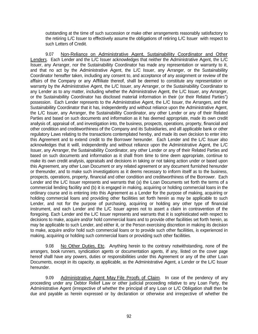92 outstanding at the time of such succession or make other arrangements reasonably satisfactory to the retiring L/C Issuer to effectively assume the obligations of retiring L/C Issuer with respect to such Letters of Credit. 9.07 Non-Reliance on Administrative Agent, Sustainability Coordinator and Other Lenders. Each Lender and the L/C Issuer acknowledges that neither the Administrative Agent, the L/C Issuer, any Arranger, nor the Sustainability Coordinator has made any representation or warranty to it, and that no act by the Administrative Agent, the L/C Issuer, any Arranger, or the Sustainability Coordinator hereafter taken, including any consent to, and acceptance of any assignment or review of the affairs of the Company or any Affiliate thereof, shall be deemed to constitute any representation or warranty by the Administrative Agent, the L/C Issuer, any Arranger, or the Sustainability Coordinator to any Lender as to any matter, including whether the Administrative Agent, the L/C Issuer, any Arranger, or the Sustainability Coordinator has disclosed material information in their (or their Related Parties’) possession. Each Lender represents to the Administrative Agent, the L/C Issuer, the Arrangers, and the Sustainability Coordinator that it has, independently and without reliance upon the Administrative Agent, the L/C Issuer, any Arranger, the Sustainability Coordinator, any other Lender or any of their Related Parties and based on such documents and information as it has deemed appropriate, made its own credit analysis of, appraisal of, and investigation into, the business, prospects, operations, property, financial and other condition and creditworthiness of the Company and its Subsidiaries, and all applicable bank or other regulatory Laws relating to the transactions contemplated hereby, and made its own decision to enter into this Agreement and to extend credit to the Borrower hereunder. Each Lender and the L/C Issuer also acknowledges that it will, independently and without reliance upon the Administrative Agent, the L/C Issuer, any Arranger, the Sustainability Coordinator, any other Lender or any of their Related Parties and based on such documents and information as it shall from time to time deem appropriate, continue to make its own credit analysis, appraisals and decisions in taking or not taking action under or based upon this Agreement, any other Loan Document or any related agreement or any document furnished hereunder or thereunder, and to make such investigations as it deems necessary to inform itself as to the business, prospects, operations, property, financial and other condition and creditworthiness of the Borrower. Each Lender and the L/C Issuer represents and warrants that (a) the Loan Documents set forth the terms of a commercial lending facility and (b) it is engaged in making, acquiring or holding commercial loans in the ordinary course and is entering into this Agreement as a Lender for the purpose of making, acquiring or holding commercial loans and providing other facilities set forth herein as may be applicable to such Lender, and not for the purpose of purchasing, acquiring or holding any other type of financial instrument, and each Lender and the L/C Issuer agrees not to assert a claim in contravention of the foregoing. Each Lender and the L/C Issuer represents and warrants that it is sophisticated with respect to decisions to make, acquire and/or hold commercial loans and to provide other facilities set forth herein, as may be applicable to such Lender, and either it, or the Person exercising discretion in making its decision to make, acquire and/or hold such commercial loans or to provide such other facilities, is experienced in making, acquiring or holding such commercial loans or providing such other facilities. 9.08 No Other Duties, Etc. Anything herein to the contrary notwithstanding, none of the arrangers, book runners, syndication agents or documentation agents, if any, listed on the cover page hereof shall have any powers, duties or responsibilities under this Agreement or any of the other Loan Documents, except in its capacity, as applicable, as the Administrative Agent, a Lender or the L/C Issuer hereunder. 9.09 Administrative Agent May File Proofs of Claim. In case of the pendency of any proceeding under any Debtor Relief Law or other judicial proceeding relative to any Loan Party, the Administrative Agent (irrespective of whether the principal of any Loan or L/C Obligation shall then be due and payable as herein expressed or by declaration or otherwise and irrespective of whether the