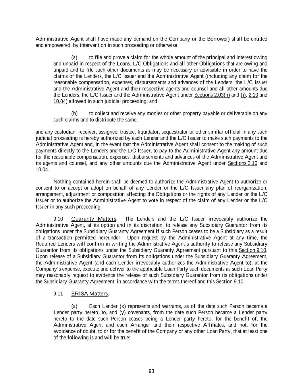 93 Administrative Agent shall have made any demand on the Company or the Borrower) shall be entitled and empowered, by intervention in such proceeding or otherwise (a) to file and prove a claim for the whole amount of the principal and interest owing and unpaid in respect of the Loans, L/C Obligations and all other Obligations that are owing and unpaid and to file such other documents as may be necessary or advisable in order to have the claims of the Lenders, the L/C Issuer and the Administrative Agent (including any claim for the reasonable compensation, expenses, disbursements and advances of the Lenders, the L/C Issuer and the Administrative Agent and their respective agents and counsel and all other amounts due the Lenders, the L/C Issuer and the Administrative Agent under Sections 2.03(h) and (i), 2.10 and 10.04) allowed in such judicial proceeding; and (b) to collect and receive any monies or other property payable or deliverable on any such claims and to distribute the same; and any custodian, receiver, assignee, trustee, liquidator, sequestrator or other similar official in any such judicial proceeding is hereby authorized by each Lender and the L/C Issuer to make such payments to the Administrative Agent and, in the event that the Administrative Agent shall consent to the making of such payments directly to the Lenders and the L/C Issuer, to pay to the Administrative Agent any amount due for the reasonable compensation, expenses, disbursements and advances of the Administrative Agent and its agents and counsel, and any other amounts due the Administrative Agent under Sections 2.10 and 10.04. Nothing contained herein shall be deemed to authorize the Administrative Agent to authorize or consent to or accept or adopt on behalf of any Lender or the L/C Issuer any plan of reorganization, arrangement, adjustment or composition affecting the Obligations or the rights of any Lender or the L/C Issuer or to authorize the Administrative Agent to vote in respect of the claim of any Lender or the L/C Issuer in any such proceeding. 9.10 Guaranty Matters. The Lenders and the L/C Issuer irrevocably authorize the Administrative Agent, at its option and in its discretion, to release any Subsidiary Guarantor from its obligations under the Subsidiary Guaranty Agreement if such Person ceases to be a Subsidiary as a result of a transaction permitted hereunder. Upon request by the Administrative Agent at any time, the Required Lenders will confirm in writing the Administrative Agent’s authority to release any Subsidiary Guarantor from its obligations under the Subsidiary Guaranty Agreement pursuant to this Section 9.10. Upon release of a Subsidiary Guarantor from its obligations under the Subsidiary Guaranty Agreement, the Administrative Agent (and each Lender irrevocably authorizes the Administrative Agent to), at the Company’s expense, execute and deliver to the applicable Loan Party such documents as such Loan Party may reasonably request to evidence the release of such Subsidiary Guarantor from its obligations under the Subsidiary Guaranty Agreement, in accordance with the terms thereof and this Section 9.10. 9.11 ERISA Matters. (a) Each Lender (x) represents and warrants, as of the date such Person became a Lender party hereto, to, and (y) covenants, from the date such Person became a Lender party hereto to the date such Person ceases being a Lender party hereto, for the benefit of, the Administrative Agent and each Arranger and their respective Affiliates, and not, for the avoidance of doubt, to or for the benefit of the Company or any other Loan Party, that at least one of the following is and will be true:
