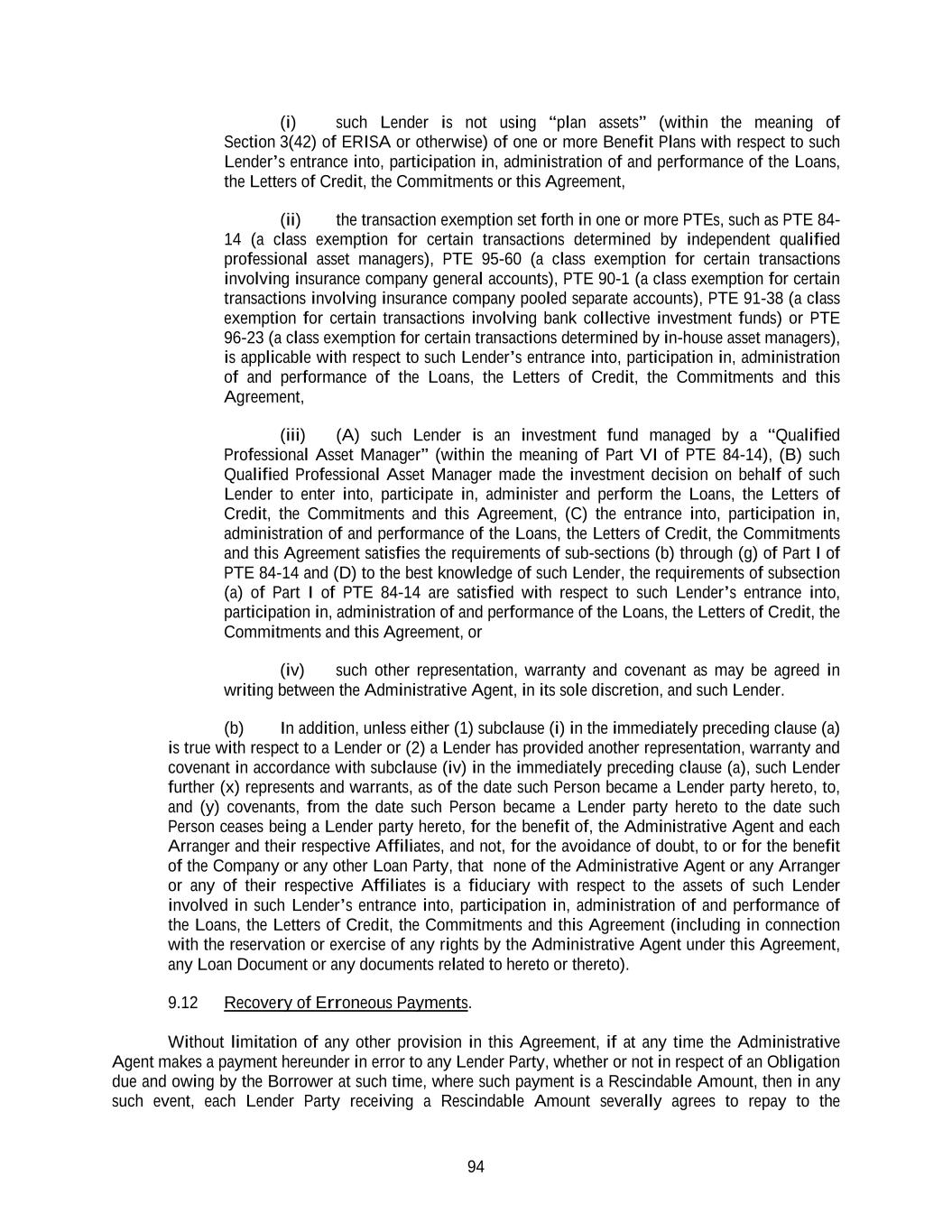 94 (i) such Lender is not using “plan assets” (within the meaning of Section 3(42) of ERISA or otherwise) of one or more Benefit Plans with respect to such Lender’s entrance into, participation in, administration of and performance of the Loans, the Letters of Credit, the Commitments or this Agreement, (ii) the transaction exemption set forth in one or more PTEs, such as PTE 84- 14 (a class exemption for certain transactions determined by independent qualified professional asset managers), PTE 95-60 (a class exemption for certain transactions involving insurance company general accounts), PTE 90-1 (a class exemption for certain transactions involving insurance company pooled separate accounts), PTE 91-38 (a class exemption for certain transactions involving bank collective investment funds) or PTE 96-23 (a class exemption for certain transactions determined by in-house asset managers), is applicable with respect to such Lender’s entrance into, participation in, administration of and performance of the Loans, the Letters of Credit, the Commitments and this Agreement, (iii) (A) such Lender is an investment fund managed by a “Qualified Professional Asset Manager” (within the meaning of Part VI of PTE 84-14), (B) such Qualified Professional Asset Manager made the investment decision on behalf of such Lender to enter into, participate in, administer and perform the Loans, the Letters of Credit, the Commitments and this Agreement, (C) the entrance into, participation in, administration of and performance of the Loans, the Letters of Credit, the Commitments and this Agreement satisfies the requirements of sub-sections (b) through (g) of Part I of PTE 84-14 and (D) to the best knowledge of such Lender, the requirements of subsection (a) of Part I of PTE 84-14 are satisfied with respect to such Lender’s entrance into, participation in, administration of and performance of the Loans, the Letters of Credit, the Commitments and this Agreement, or (iv) such other representation, warranty and covenant as may be agreed in writing between the Administrative Agent, in its sole discretion, and such Lender. (b) In addition, unless either (1) subclause (i) in the immediately preceding clause (a) is true with respect to a Lender or (2) a Lender has provided another representation, warranty and covenant in accordance with subclause (iv) in the immediately preceding clause (a), such Lender further (x) represents and warrants, as of the date such Person became a Lender party hereto, to, and (y) covenants, from the date such Person became a Lender party hereto to the date such Person ceases being a Lender party hereto, for the benefit of, the Administrative Agent and each Arranger and their respective Affiliates, and not, for the avoidance of doubt, to or for the benefit of the Company or any other Loan Party, that none of the Administrative Agent or any Arranger or any of their respective Affiliates is a fiduciary with respect to the assets of such Lender involved in such Lender’s entrance into, participation in, administration of and performance of the Loans, the Letters of Credit, the Commitments and this Agreement (including in connection with the reservation or exercise of any rights by the Administrative Agent under this Agreement, any Loan Document or any documents related to hereto or thereto). 9.12 Recovery of Erroneous Payments. Without limitation of any other provision in this Agreement, if at any time the Administrative Agent makes a payment hereunder in error to any Lender Party, whether or not in respect of an Obligation due and owing by the Borrower at such time, where such payment is a Rescindable Amount, then in any such event, each Lender Party receiving a Rescindable Amount severally agrees to repay to the