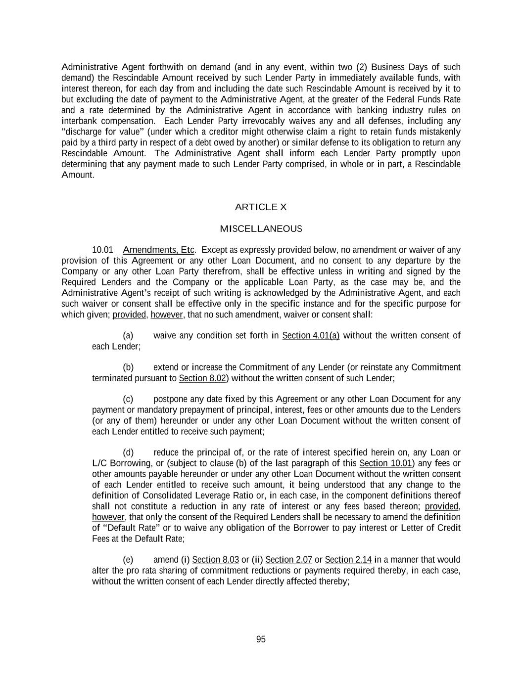 95 Administrative Agent forthwith on demand (and in any event, within two (2) Business Days of such demand) the Rescindable Amount received by such Lender Party in immediately available funds, with interest thereon, for each day from and including the date such Rescindable Amount is received by it to but excluding the date of payment to the Administrative Agent, at the greater of the Federal Funds Rate and a rate determined by the Administrative Agent in accordance with banking industry rules on interbank compensation. Each Lender Party irrevocably waives any and all defenses, including any “discharge for value” (under which a creditor might otherwise claim a right to retain funds mistakenly paid by a third party in respect of a debt owed by another) or similar defense to its obligation to return any Rescindable Amount. The Administrative Agent shall inform each Lender Party promptly upon determining that any payment made to such Lender Party comprised, in whole or in part, a Rescindable Amount. ARTICLE X MISCELLANEOUS 10.01 Amendments, Etc. Except as expressly provided below, no amendment or waiver of any provision of this Agreement or any other Loan Document, and no consent to any departure by the Company or any other Loan Party therefrom, shall be effective unless in writing and signed by the Required Lenders and the Company or the applicable Loan Party, as the case may be, and the Administrative Agent’s receipt of such writing is acknowledged by the Administrative Agent, and each such waiver or consent shall be effective only in the specific instance and for the specific purpose for which given; provided, however, that no such amendment, waiver or consent shall: (a) waive any condition set forth in Section 4.01(a) without the written consent of each Lender; (b) extend or increase the Commitment of any Lender (or reinstate any Commitment terminated pursuant to Section 8.02) without the written consent of such Lender; (c) postpone any date fixed by this Agreement or any other Loan Document for any payment or mandatory prepayment of principal, interest, fees or other amounts due to the Lenders (or any of them) hereunder or under any other Loan Document without the written consent of each Lender entitled to receive such payment; (d) reduce the principal of, or the rate of interest specified herein on, any Loan or L/C Borrowing, or (subject to clause (b) of the last paragraph of this Section 10.01) any fees or other amounts payable hereunder or under any other Loan Document without the written consent of each Lender entitled to receive such amount, it being understood that any change to the definition of Consolidated Leverage Ratio or, in each case, in the component definitions thereof shall not constitute a reduction in any rate of interest or any fees based thereon; provided, however, that only the consent of the Required Lenders shall be necessary to amend the definition of “Default Rate” or to waive any obligation of the Borrower to pay interest or Letter of Credit Fees at the Default Rate; (e) amend (i) Section 8.03 or (ii) Section 2.07 or Section 2.14 in a manner that would alter the pro rata sharing of commitment reductions or payments required thereby, in each case, without the written consent of each Lender directly affected thereby;