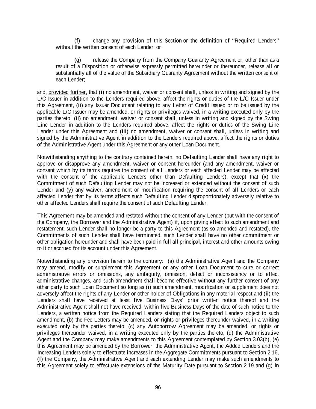 96 (f) change any provision of this Section or the definition of “Required Lenders” without the written consent of each Lender; or (g) release the Company from the Company Guaranty Agreement or, other than as a result of a Disposition or otherwise expressly permitted hereunder or thereunder, release all or substantially all of the value of the Subsidiary Guaranty Agreement without the written consent of each Lender; and, provided further, that (i) no amendment, waiver or consent shall, unless in writing and signed by the L/C Issuer in addition to the Lenders required above, affect the rights or duties of the L/C Issuer under this Agreement, (ii) any Issuer Document relating to any Letter of Credit issued or to be issued by the applicable L/C Issuer may be amended, or rights or privileges waived, in a writing executed only by the parties thereto; (ii) no amendment, waiver or consent shall, unless in writing and signed by the Swing Line Lender in addition to the Lenders required above, affect the rights or duties of the Swing Line Lender under this Agreement and (iii) no amendment, waiver or consent shall, unless in writing and signed by the Administrative Agent in addition to the Lenders required above, affect the rights or duties of the Administrative Agent under this Agreement or any other Loan Document. Notwithstanding anything to the contrary contained herein, no Defaulting Lender shall have any right to approve or disapprove any amendment, waiver or consent hereunder (and any amendment, waiver or consent which by its terms requires the consent of all Lenders or each affected Lender may be effected with the consent of the applicable Lenders other than Defaulting Lenders), except that (x) the Commitment of such Defaulting Lender may not be increased or extended without the consent of such Lender and (y) any waiver, amendment or modification requiring the consent of all Lenders or each affected Lender that by its terms affects such Defaulting Lender disproportionately adversely relative to other affected Lenders shall require the consent of such Defaulting Lender. This Agreement may be amended and restated without the consent of any Lender (but with the consent of the Company, the Borrower and the Administrative Agent) if, upon giving effect to such amendment and restatement, such Lender shall no longer be a party to this Agreement (as so amended and restated), the Commitments of such Lender shall have terminated, such Lender shall have no other commitment or other obligation hereunder and shall have been paid in full all principal, interest and other amounts owing to it or accrued for its account under this Agreement. Notwithstanding any provision herein to the contrary: (a) the Administrative Agent and the Company may amend, modify or supplement this Agreement or any other Loan Document to cure or correct administrative errors or omissions, any ambiguity, omission, defect or inconsistency or to effect administrative changes, and such amendment shall become effective without any further consent of any other party to such Loan Document so long as (i) such amendment, modification or supplement does not adversely affect the rights of any Lender or other holder of Obligations in any material respect and (ii) the Lenders shall have received at least five Business Days’ prior written notice thereof and the Administrative Agent shall not have received, within five Business Days of the date of such notice to the Lenders, a written notice from the Required Lenders stating that the Required Lenders object to such amendment, (b) the Fee Letters may be amended, or rights or privileges thereunder waived, in a writing executed only by the parties thereto, (c) any Autoborrow Agreement may be amended, or rights or privileges thereunder waived, in a writing executed only by the parties thereto, (d) the Administrative Agent and the Company may make amendments to this Agreement contemplated by Section 3.03(b), (e) this Agreement may be amended by the Borrower, the Administrative Agent, the Added Lenders and the Increasing Lenders solely to effectuate increases in the Aggregate Commitments pursuant to Section 2.16, (f) the Company, the Administrative Agent and each extending Lender may make such amendments to this Agreement solely to effectuate extensions of the Maturity Date pursuant to Section 2.19 and (g) in